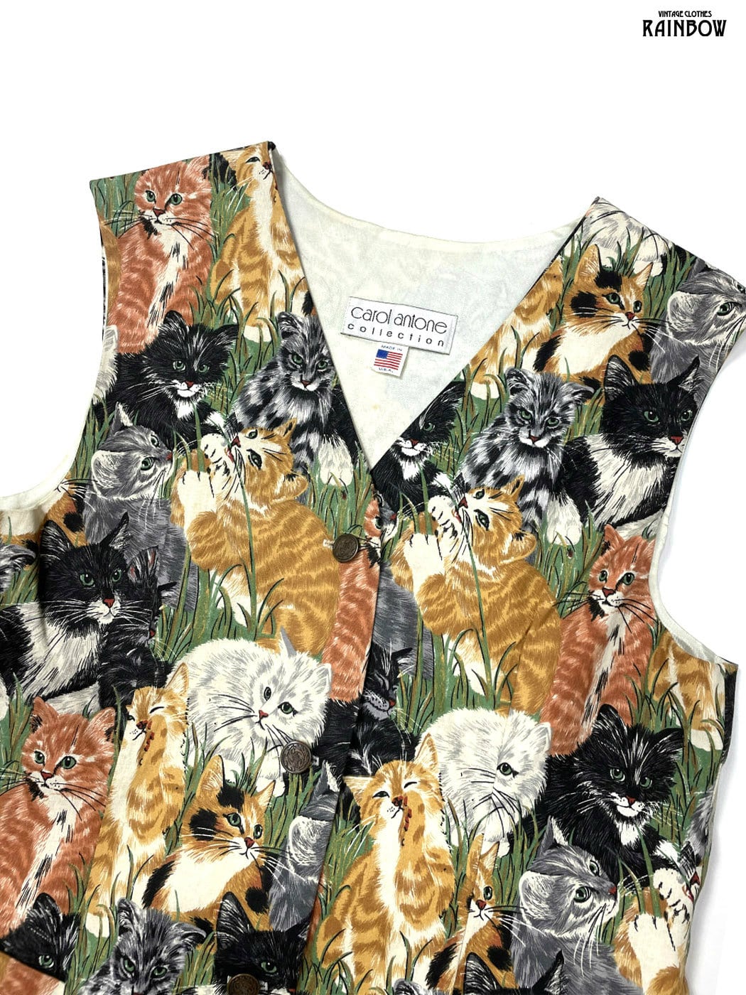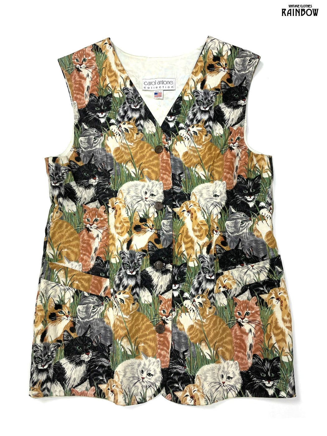 #トップス #ベスト #ノースリーブ #茶 #総柄 #アニマル #ネコ #アメリカ製 #クラシック #コットン #ベスト