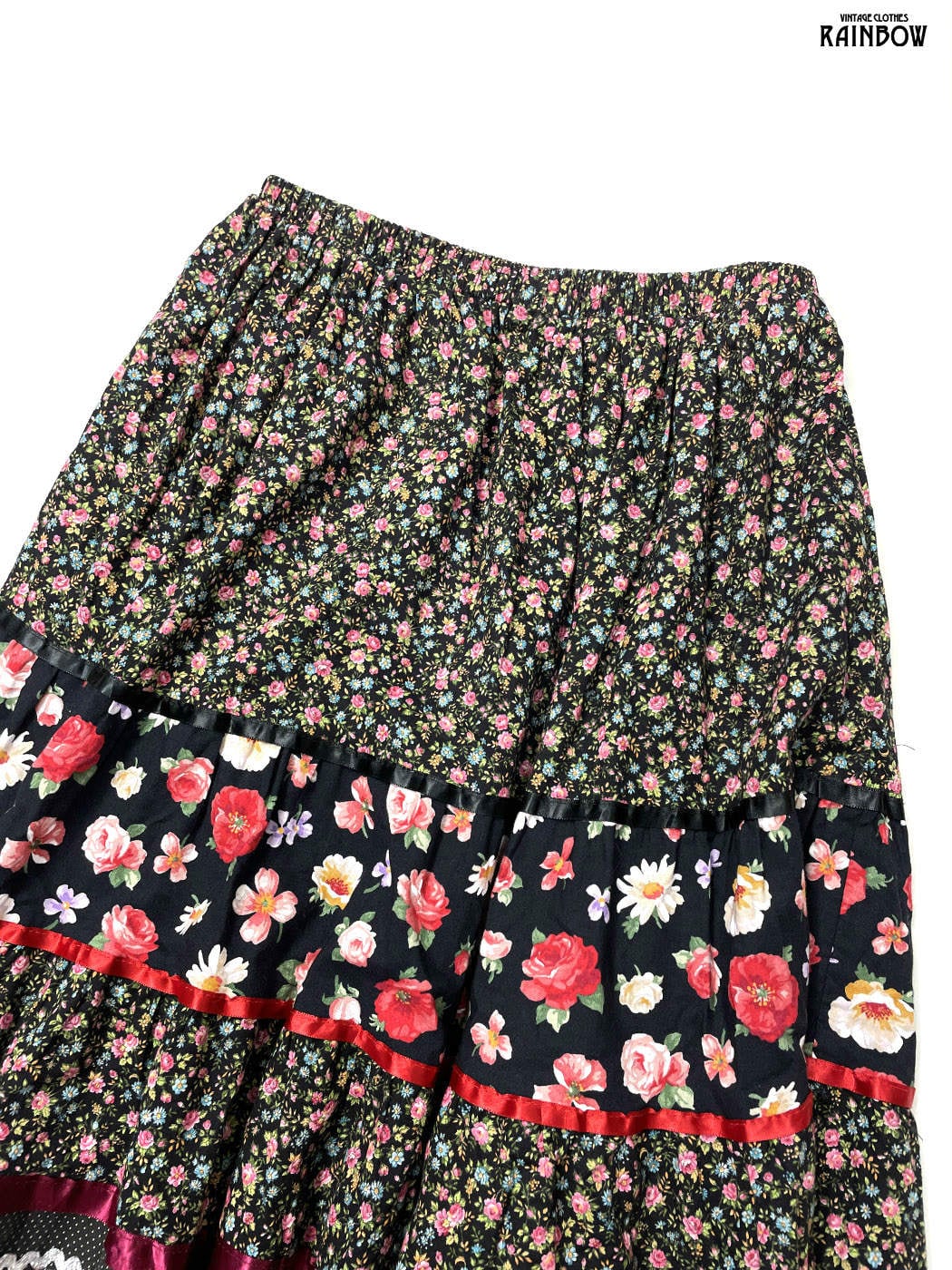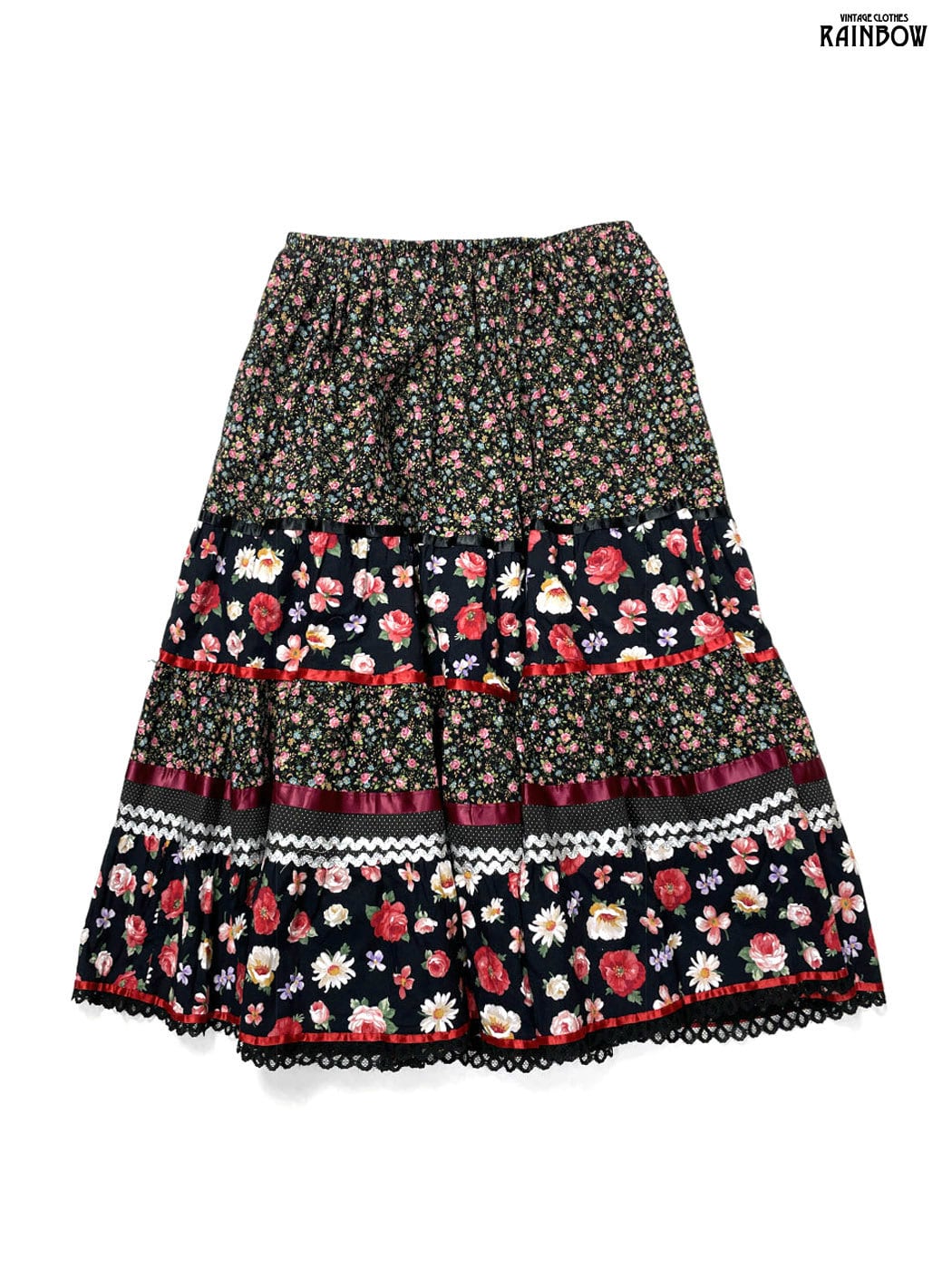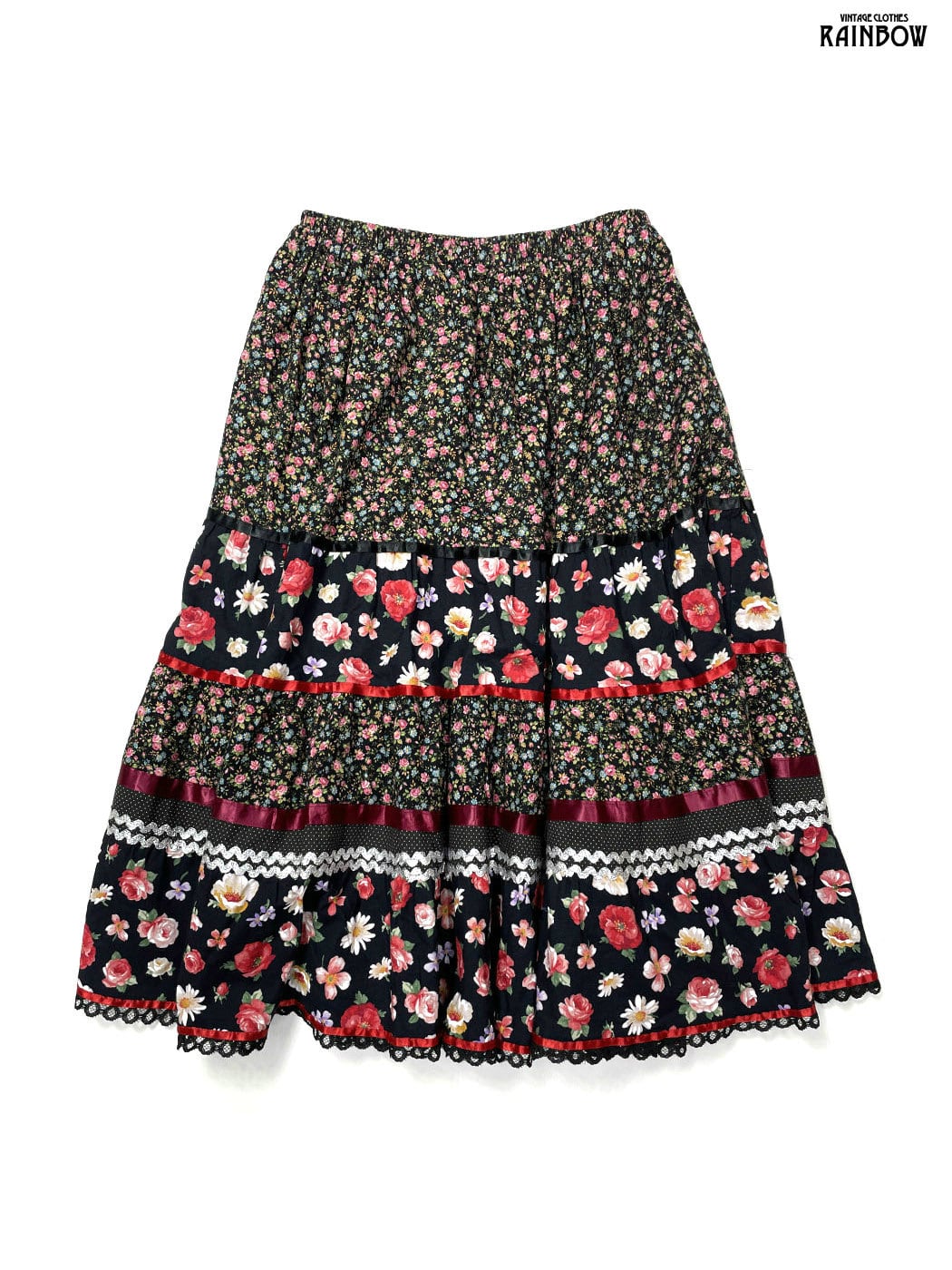 #スカート #膝丈 #ティアード #黒 #花柄 #レース #クラシック #コットン #花柄スカート
