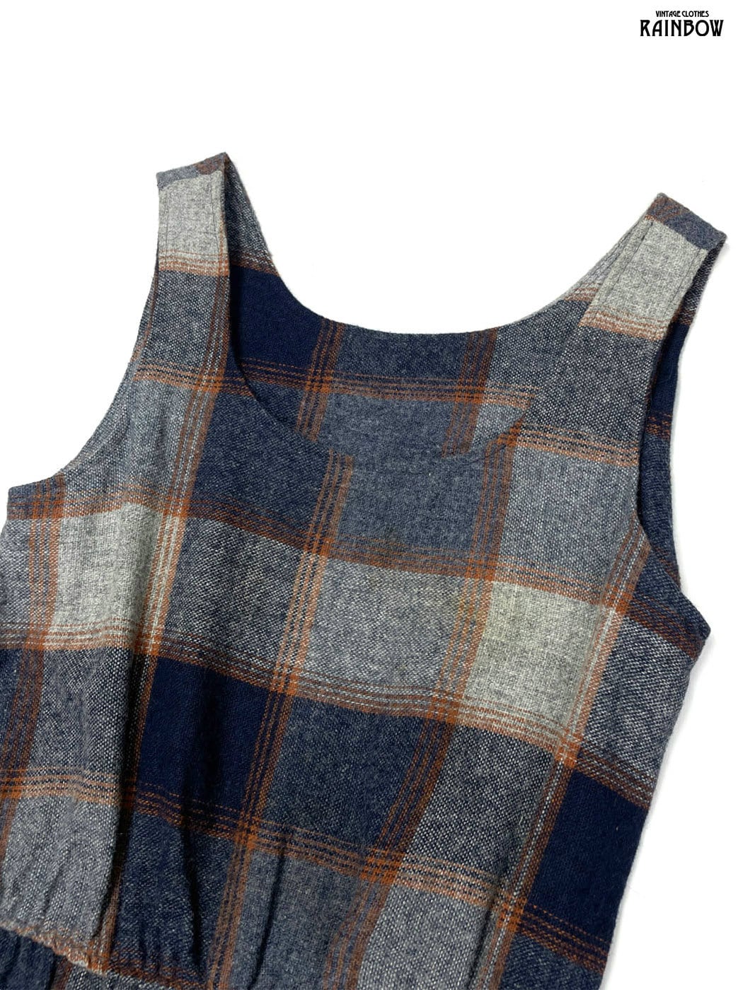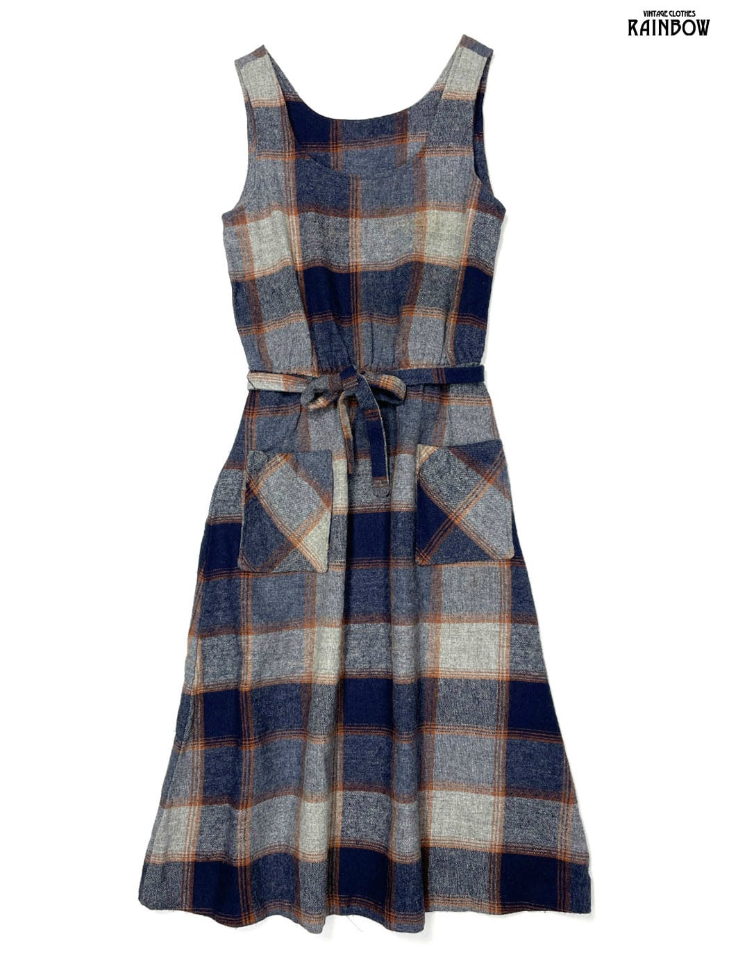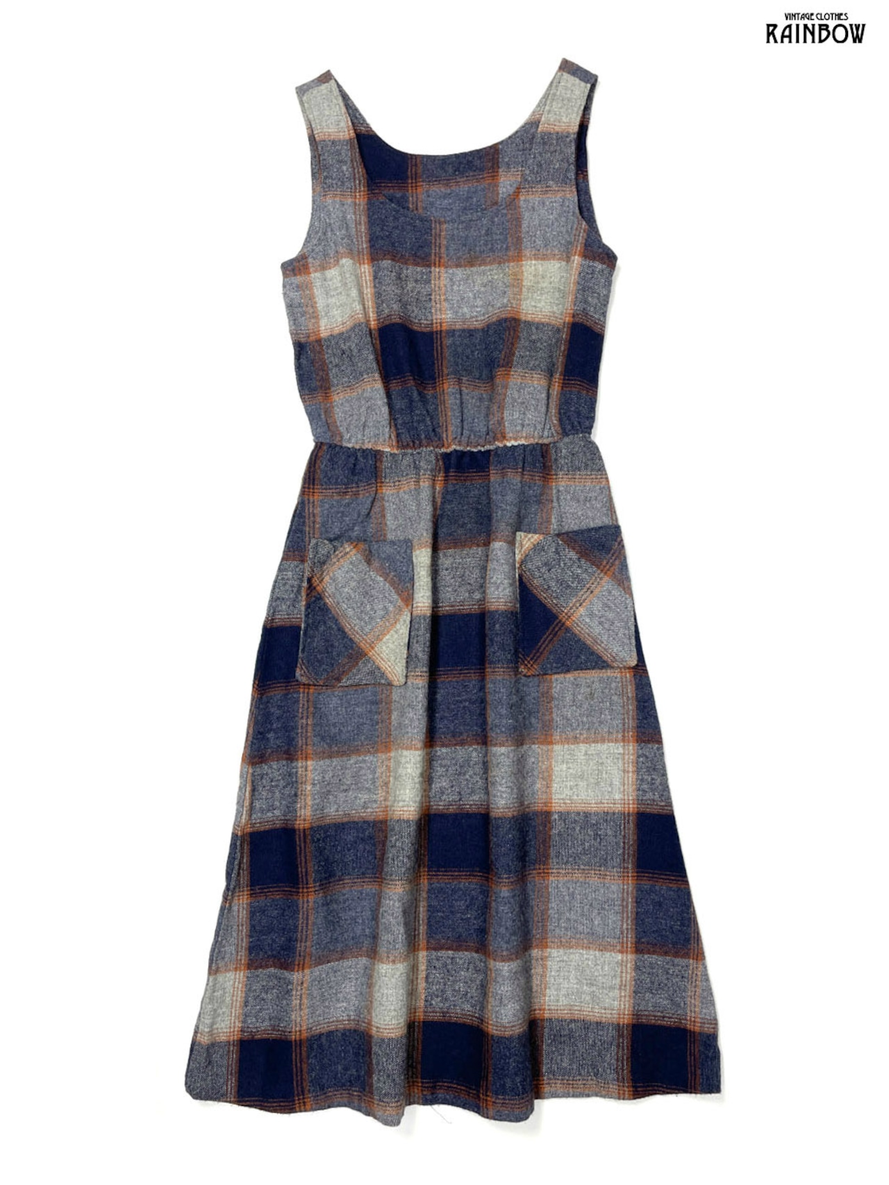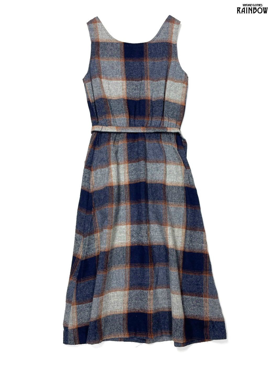 #ワンピース #ノースリーブ #ロング丈 #ゴムウエスト #紺 #チェック柄 #ベルト付き #ウール #ウールワンピース