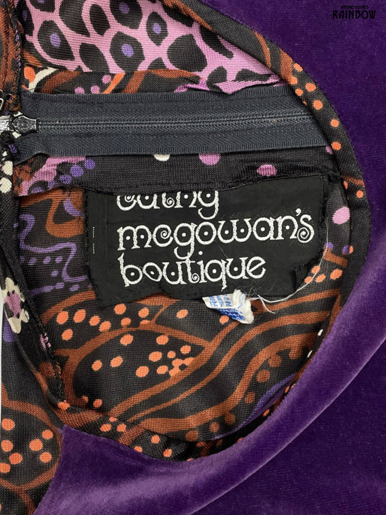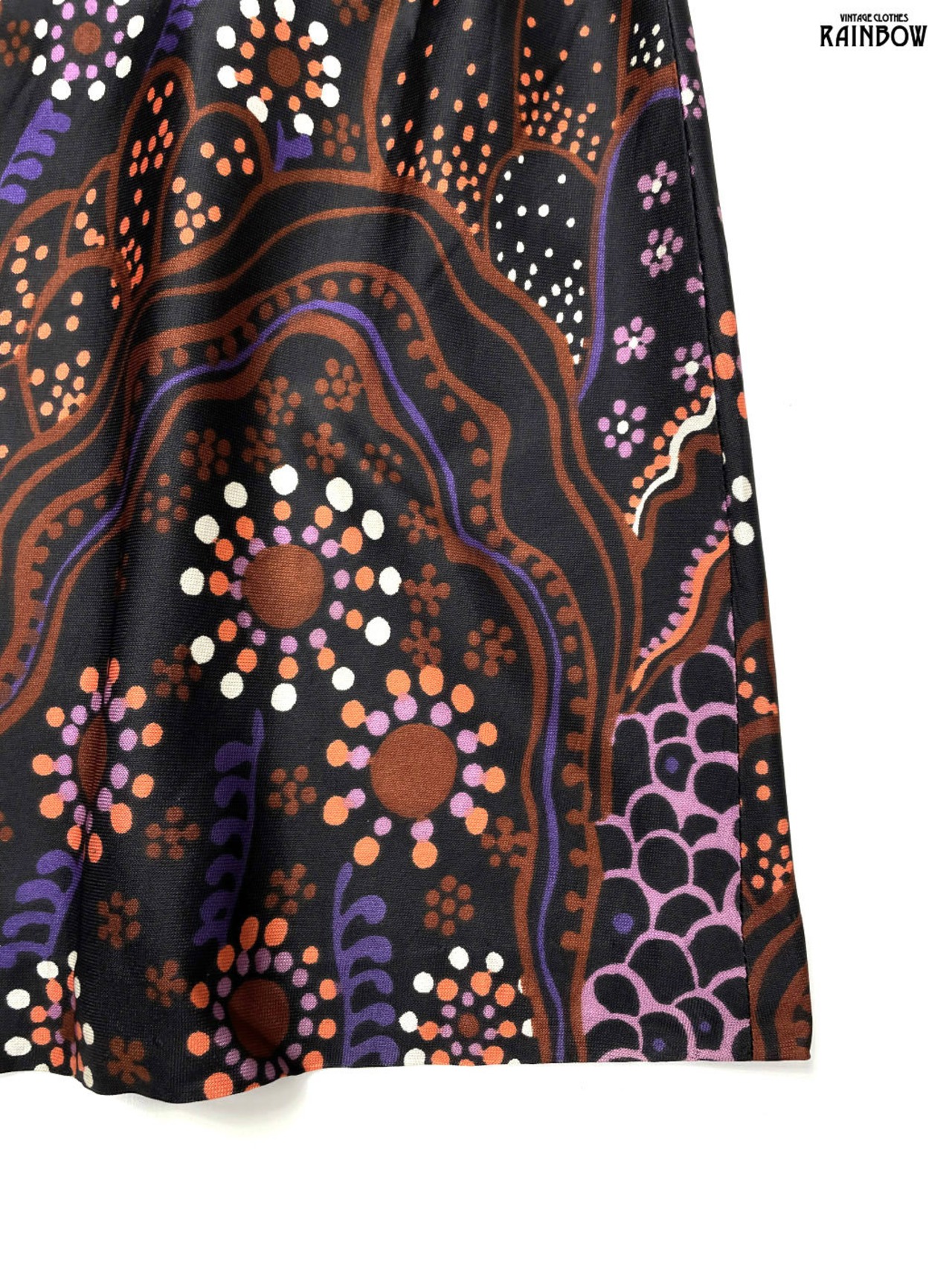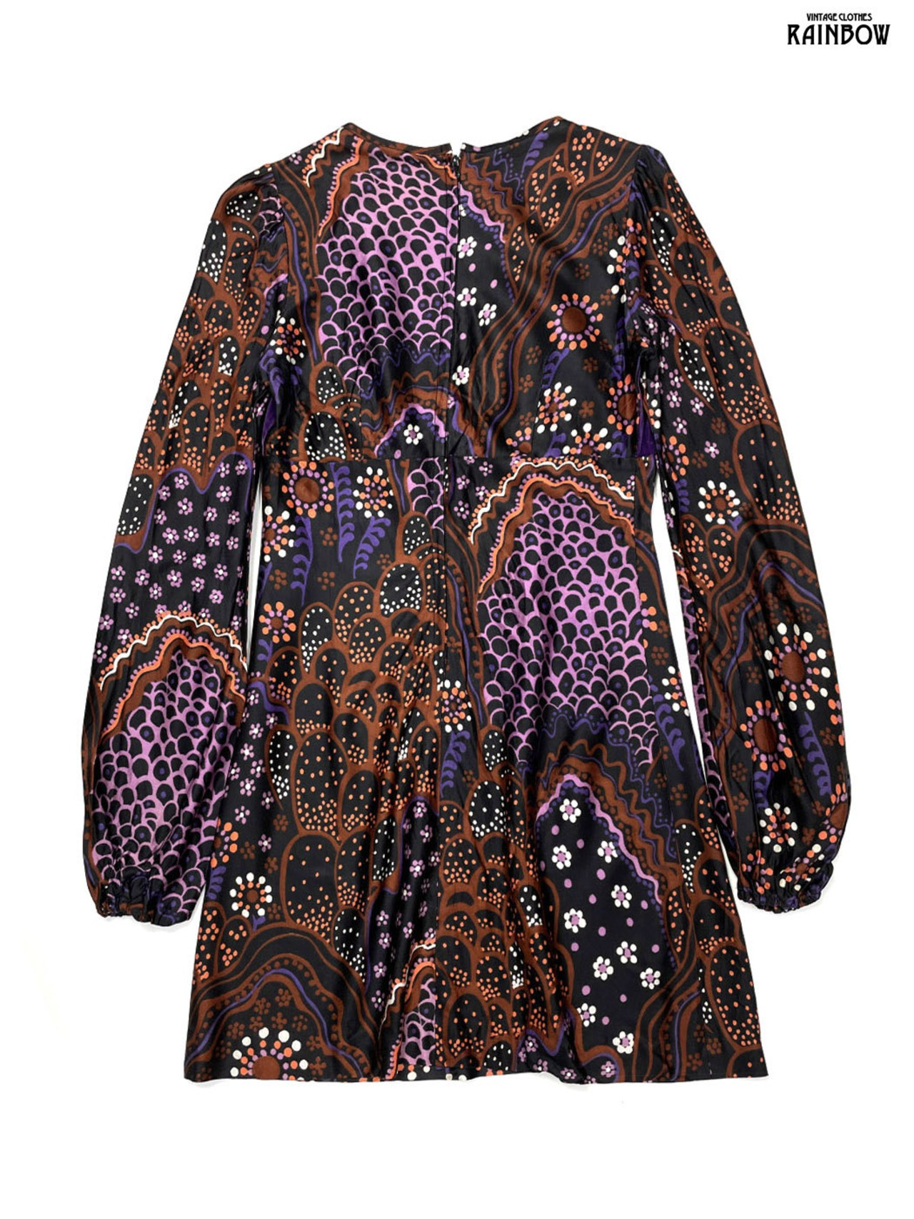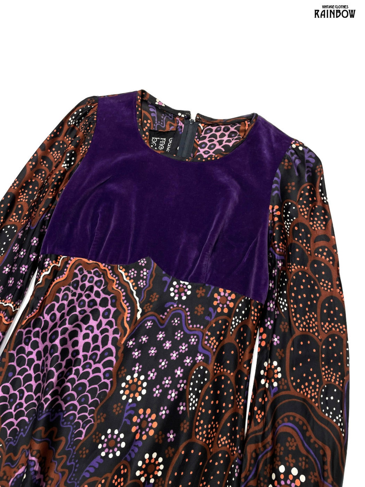 #ワンピース #ロングスリーブ #ミニ丈 #ウエスト切り替え #茶 #紫 #総柄 #クラシック #ベロア #長袖総柄ワンピース