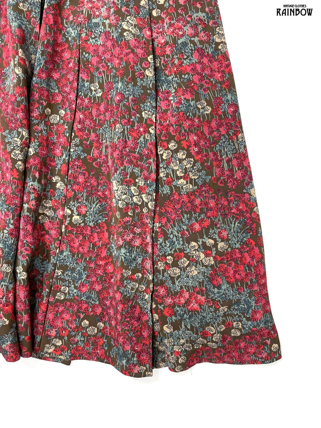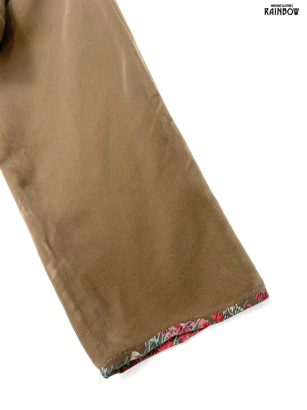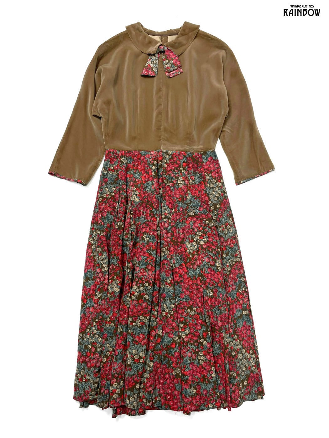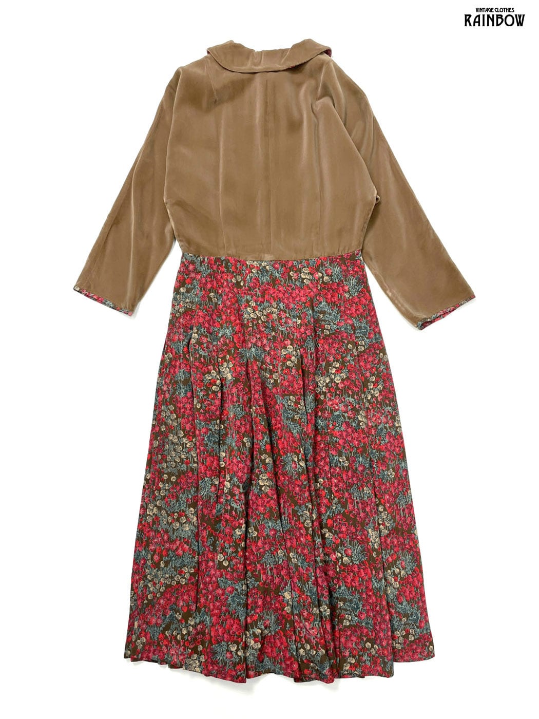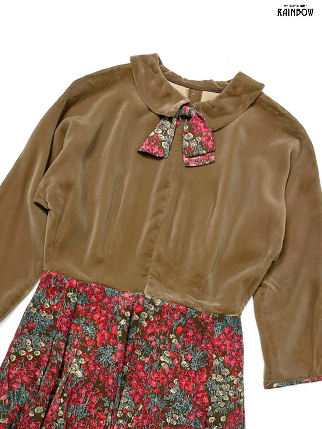 古着 リボン 花柄 ベロア ロング丈 長袖 ワンピース ピンク ベージュ (otu2509036)
