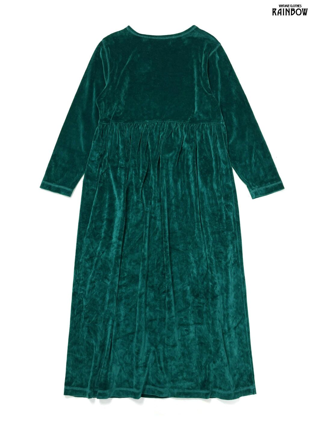 #ワンピース #ロングスリーブ #ロング丈 #ウエスト切り替え #緑 #無地 #シンプル #ベロア #ベロアワンピース