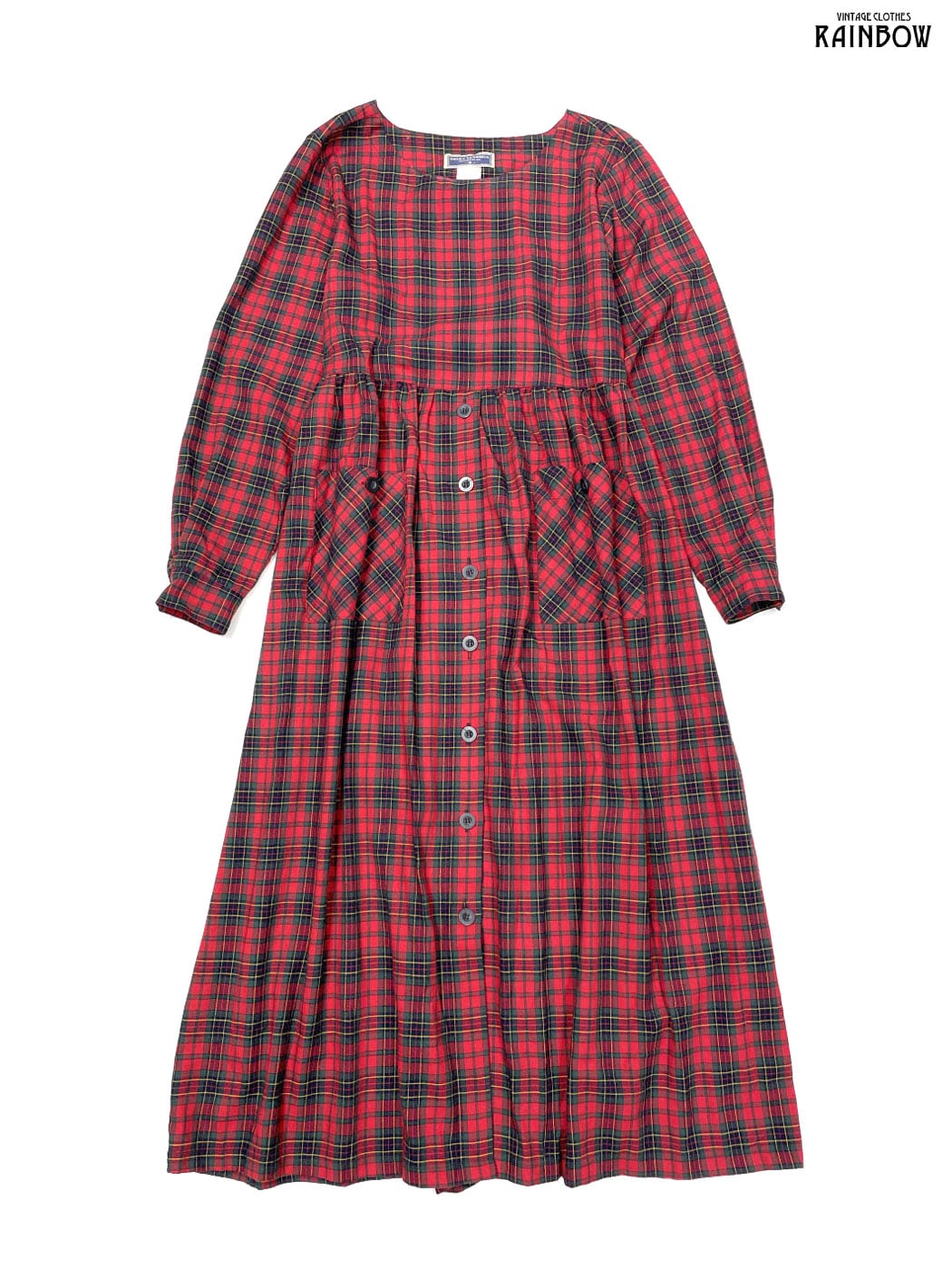 #ワンピース #ロングスリーブ #ロング丈 #フレア #ウエスト切り替え #赤 #チェック柄 #リボン #ガーリー #コットン #長袖チェック柄ワンピース