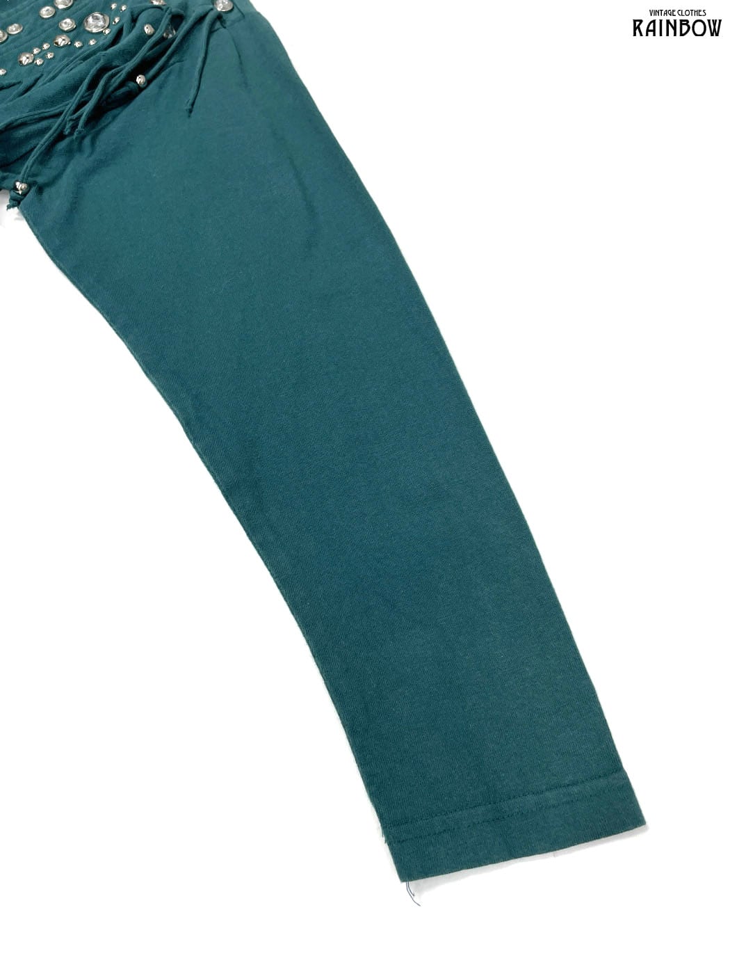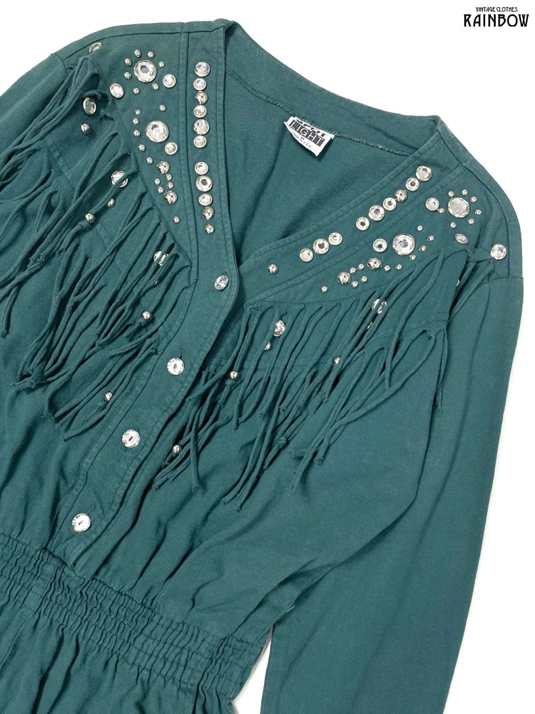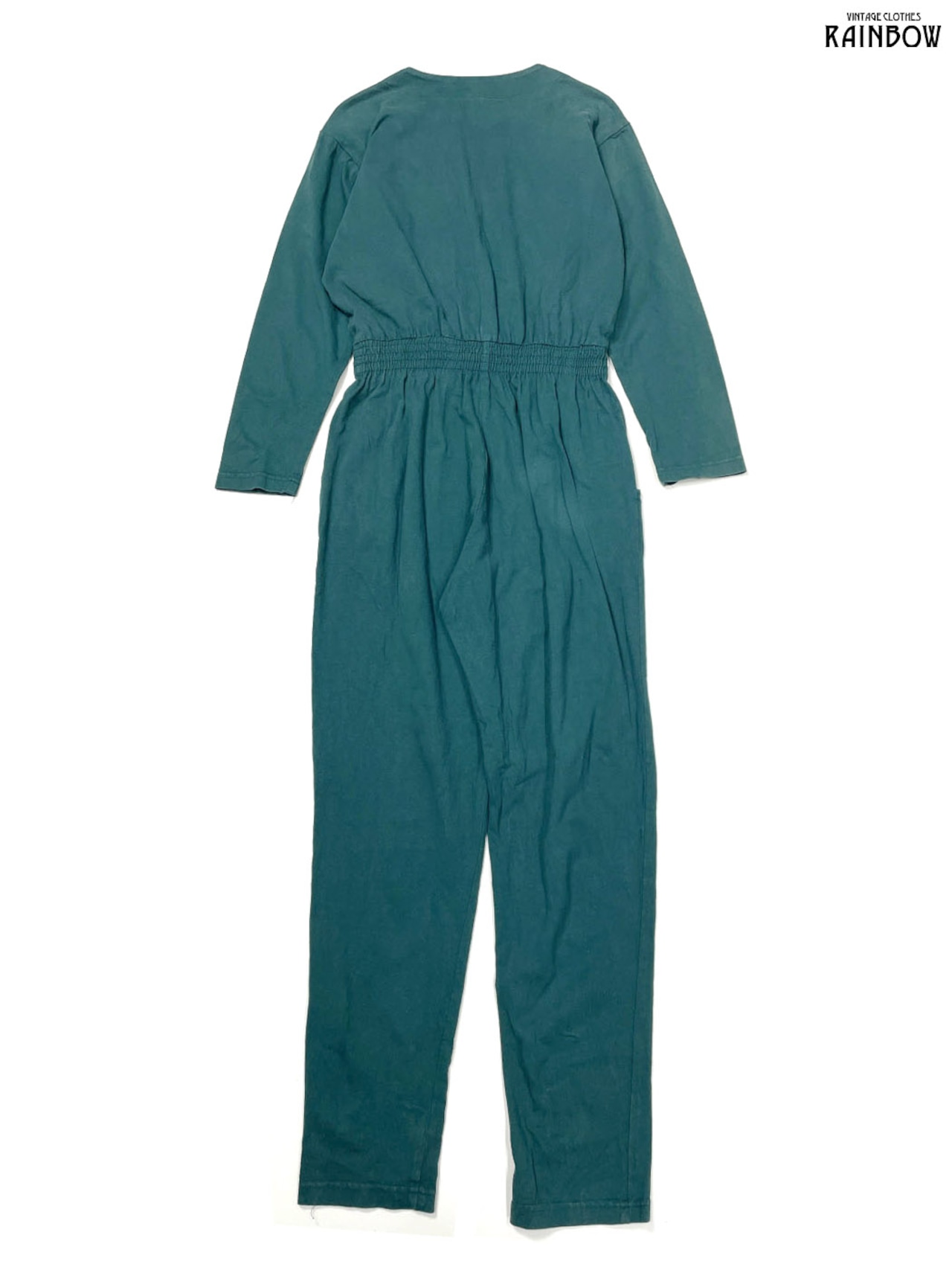 #ワンピース #オールインワン #ロングスリーブ #ロング丈 #ゴムウエスト #緑 #無地 #アメリカ製 #フリンジ #ビジュー #ヴィンテージ #コットン #長袖オールインワン
