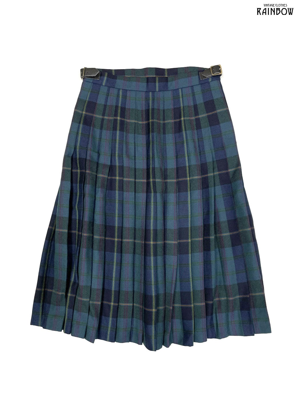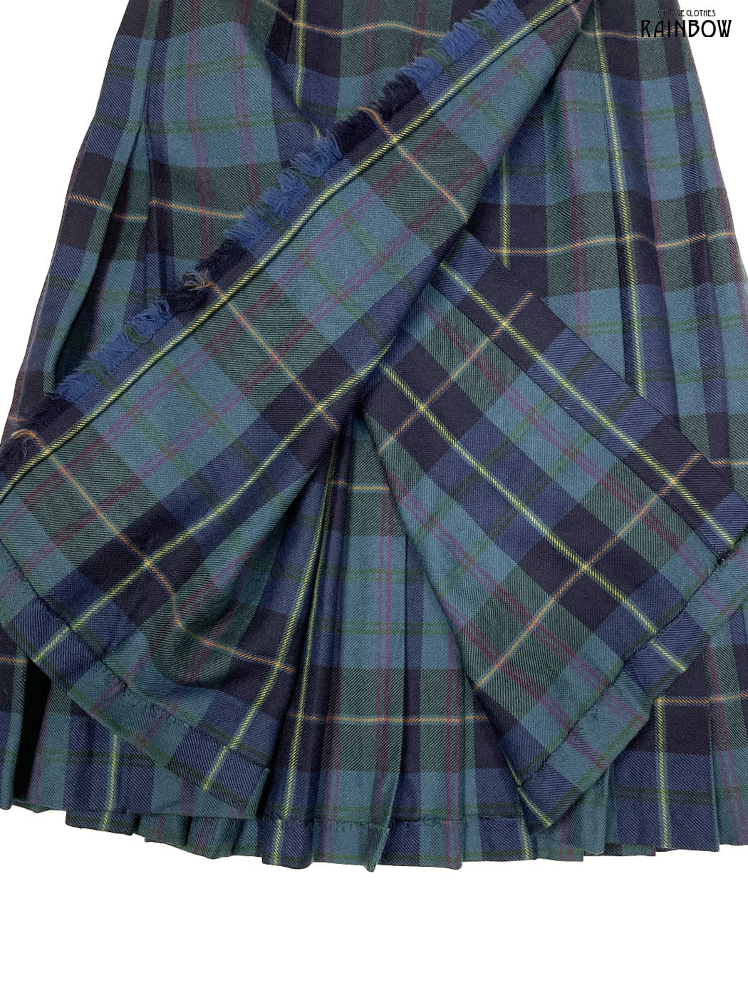 古着 JAMES PRINGLE WEAVERS スコットランド製 フリンジ 巻きデザイン チェック柄 ピュアウール 膝丈 プリーツ スカート 緑 紺 (btu2509070) | 古着屋RAINBOW