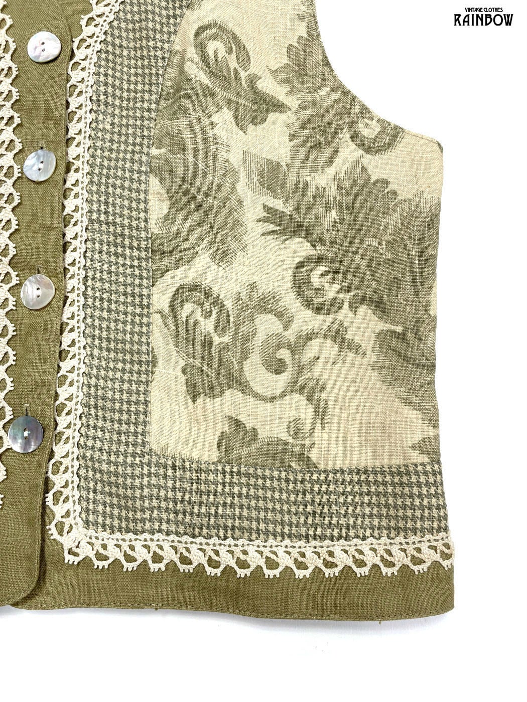#トップス #ベスト #ノースリーブ #ベージュ #総柄 #アメリカ製 #レース #シェルボタン #リネン #ベスト