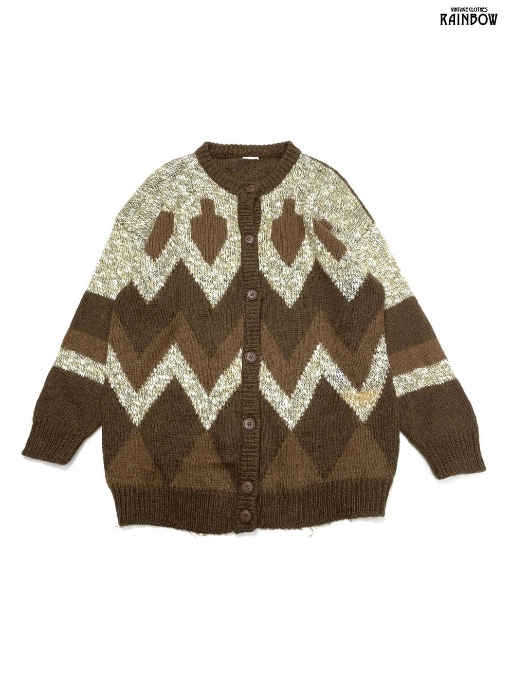 #ニット #カーディガン #ロングスリーブ #茶 #総柄 #ニット地 #柄カーディガン