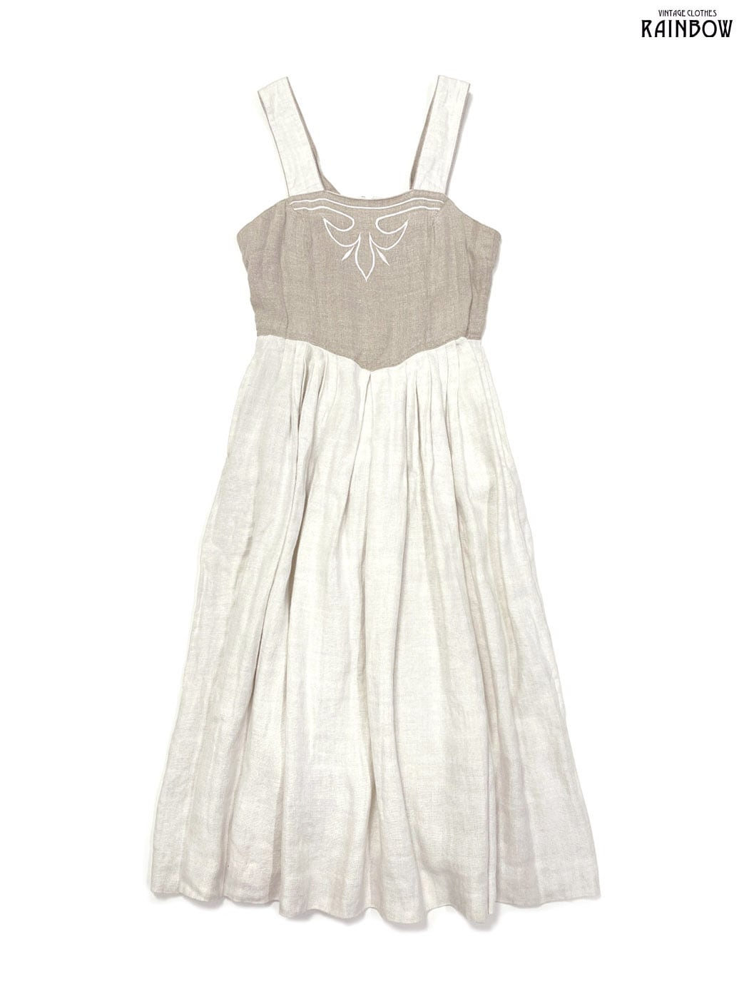 #ワンピース #ノースリーブ #ロング丈 #フレア #ウエスト切り替え #ベージュ #生成り #無地 #刺繍 #ディアンドル #チロル #ガーリー #ナチュラル #リネン #リネンワンピース