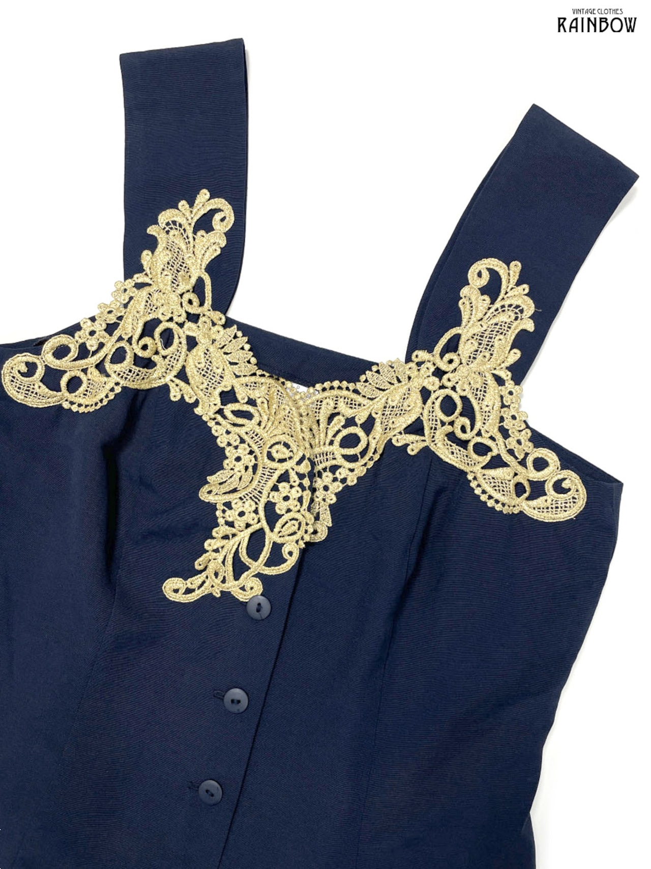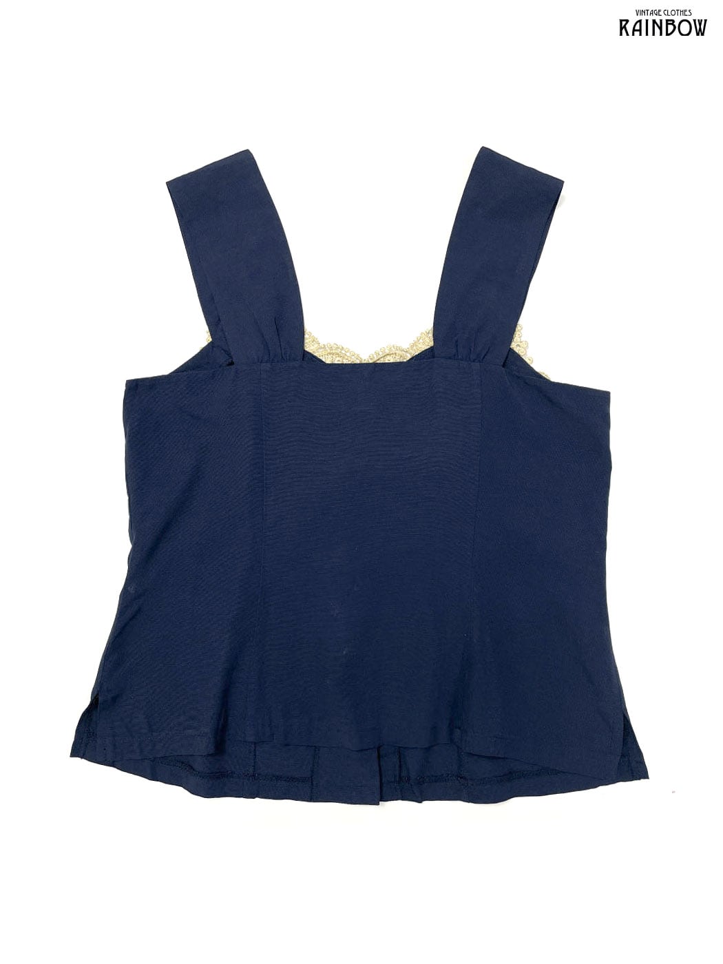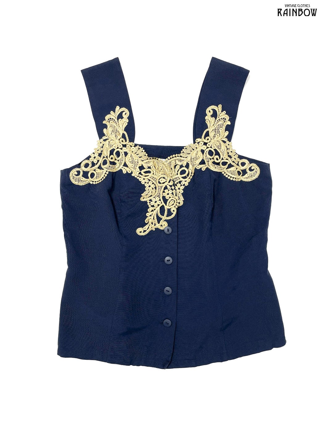 #トップス #キャミソール #キャミソール #紺 #ゴールド #無地 #刺繍 #前開き #ヴィンテージ #キャミソール