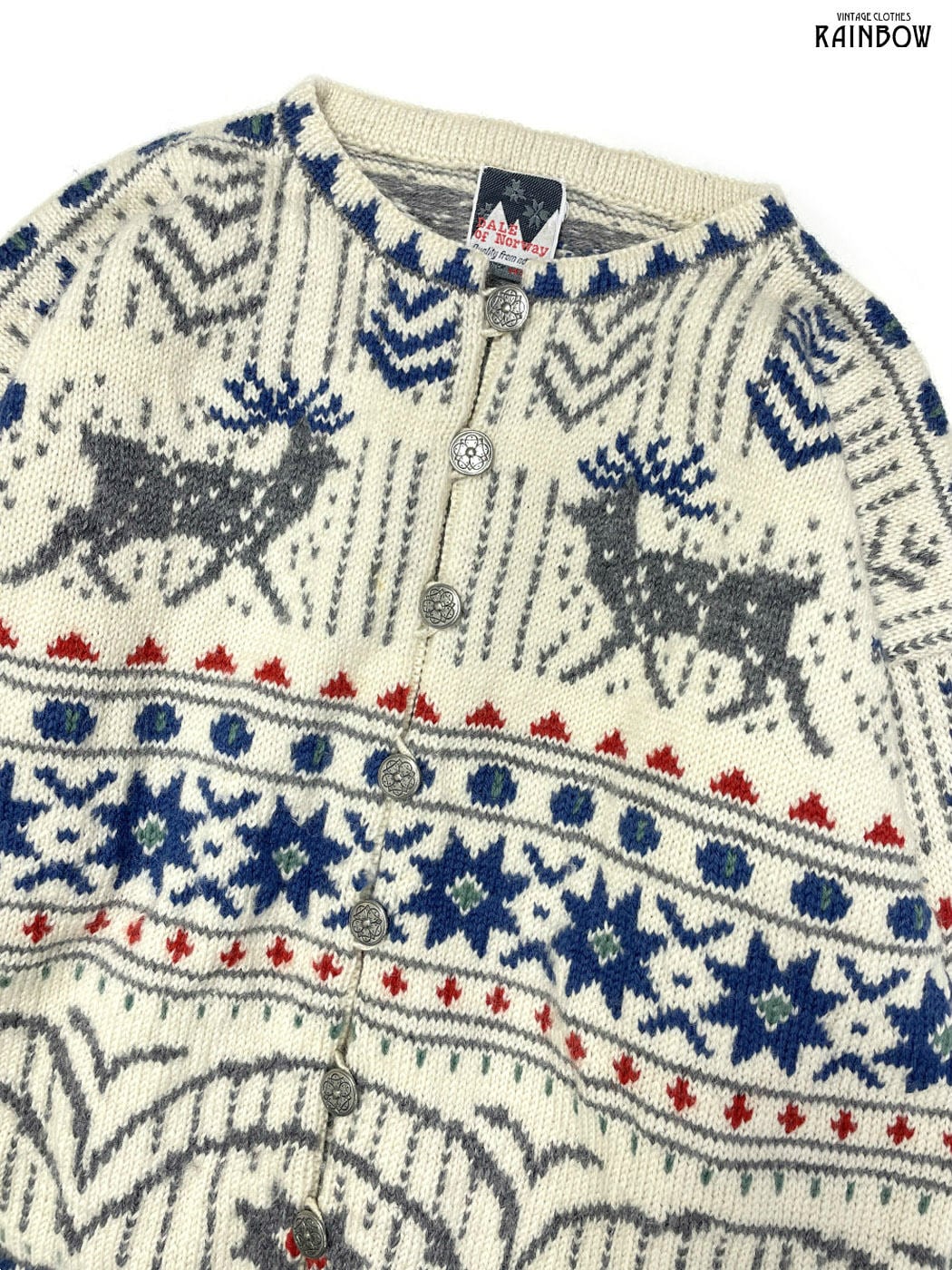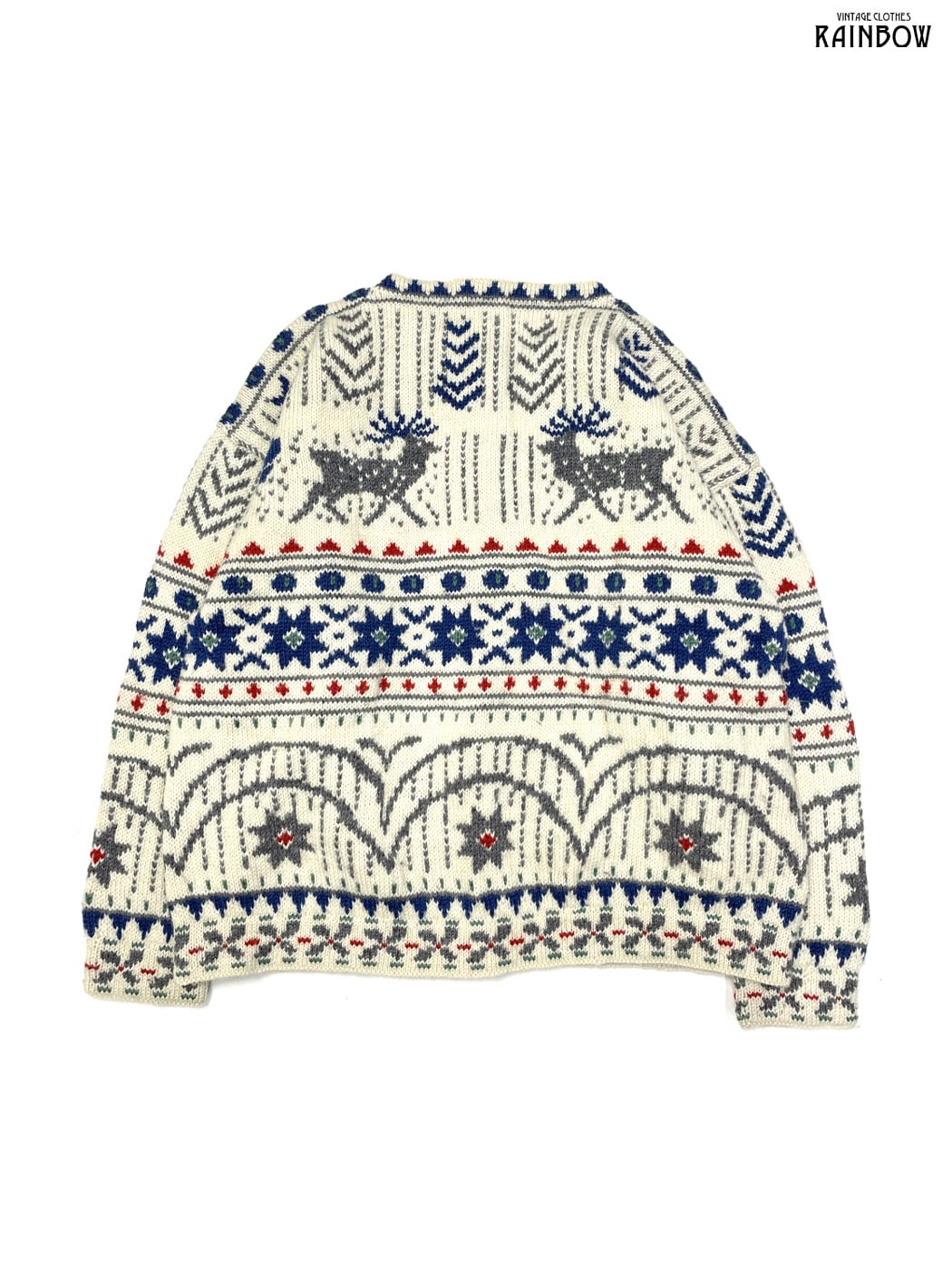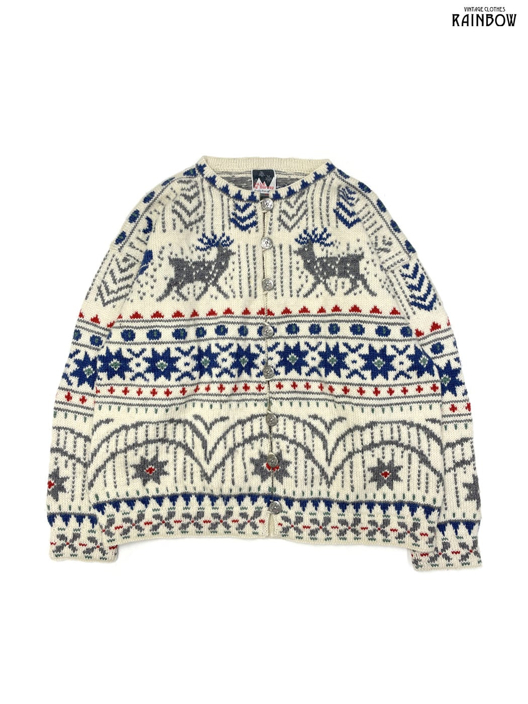 #ニット #カーディガン #ロングスリーブ #白 #生成り #総柄 #ノルディック柄 #アニマル #トナカイ #前開き #ガーリー #ヴィンテージ #ウール #ピュアウール #ノルディック柄ニット