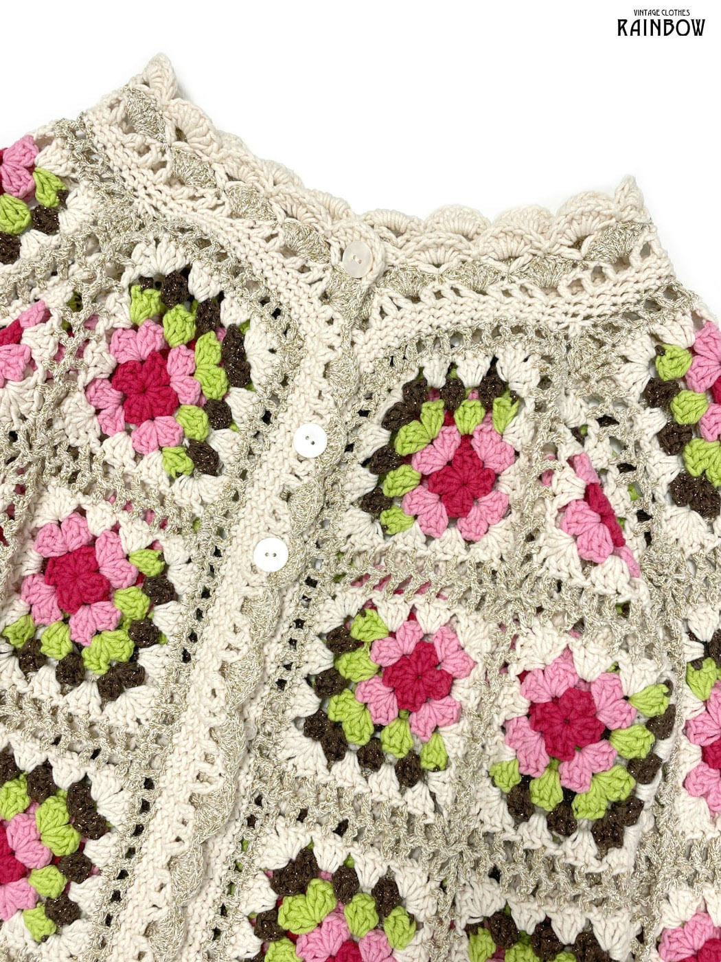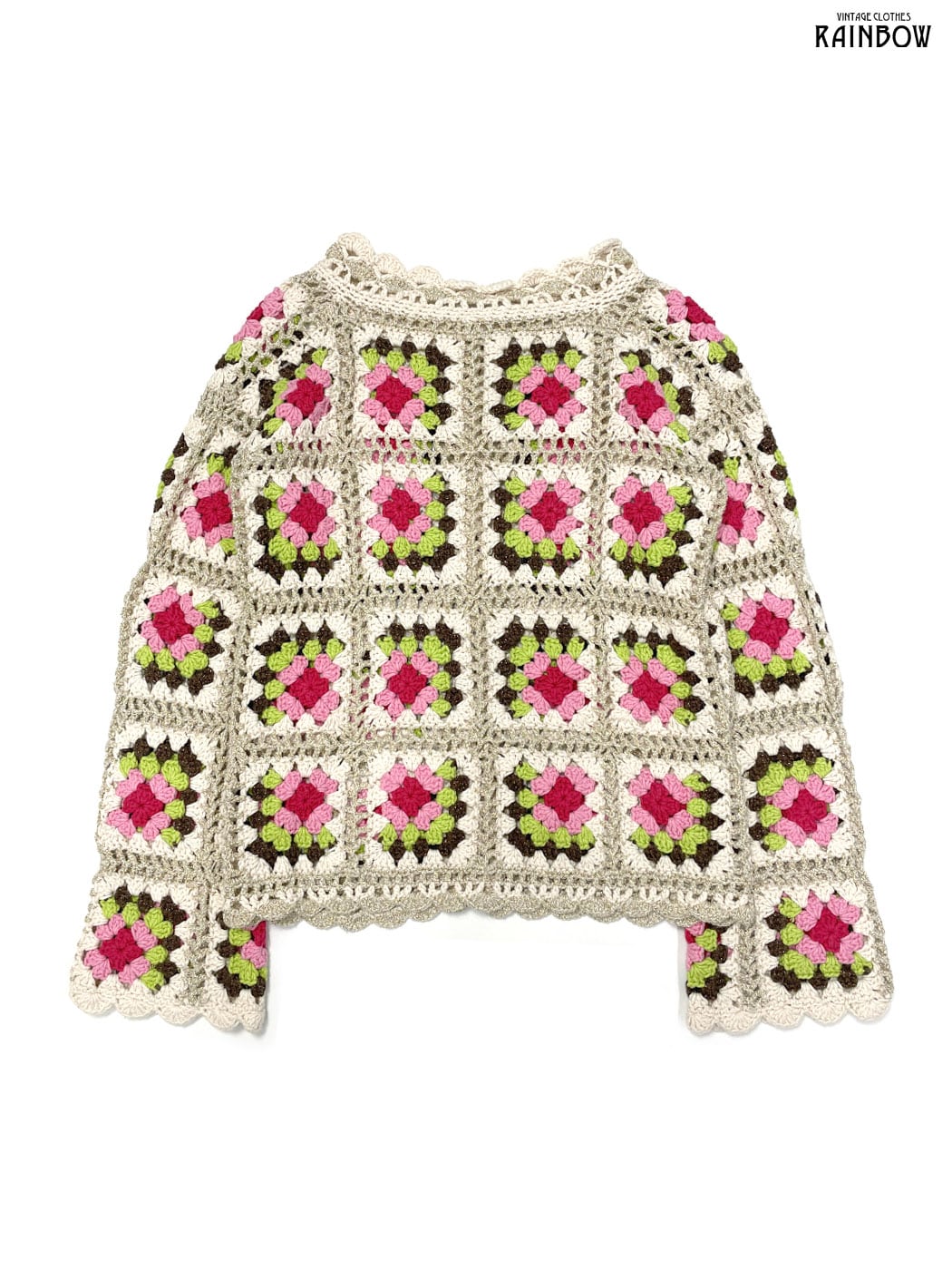 #ニット #カーディガン #ロングスリーブ #ピンク #ベージュ #ゴールド #花柄 #シェルボタン #前開き #パッチワーク #かぎ編み #ガーリー #ヴィンテージ #ニット地 #柄カーディガン