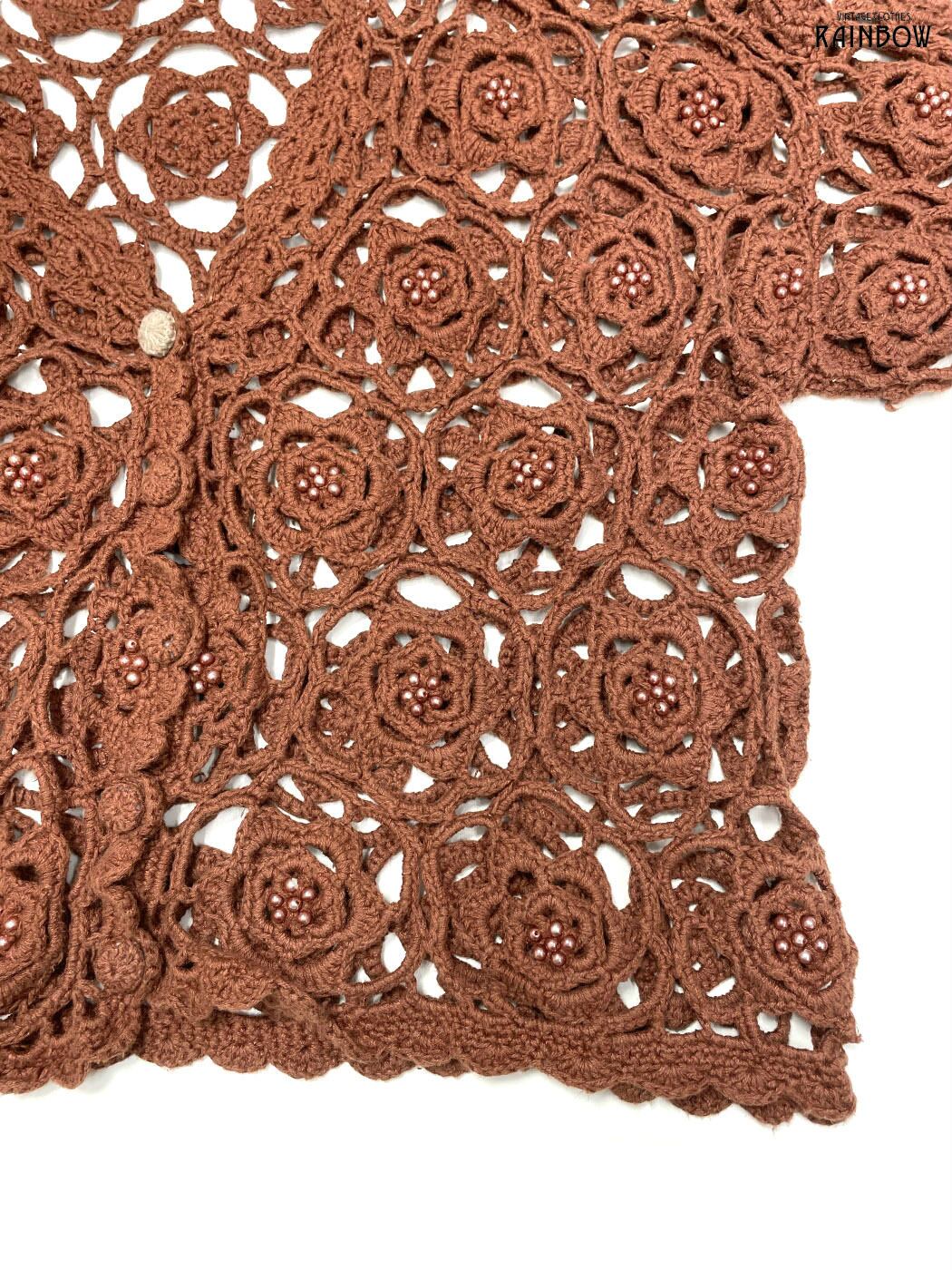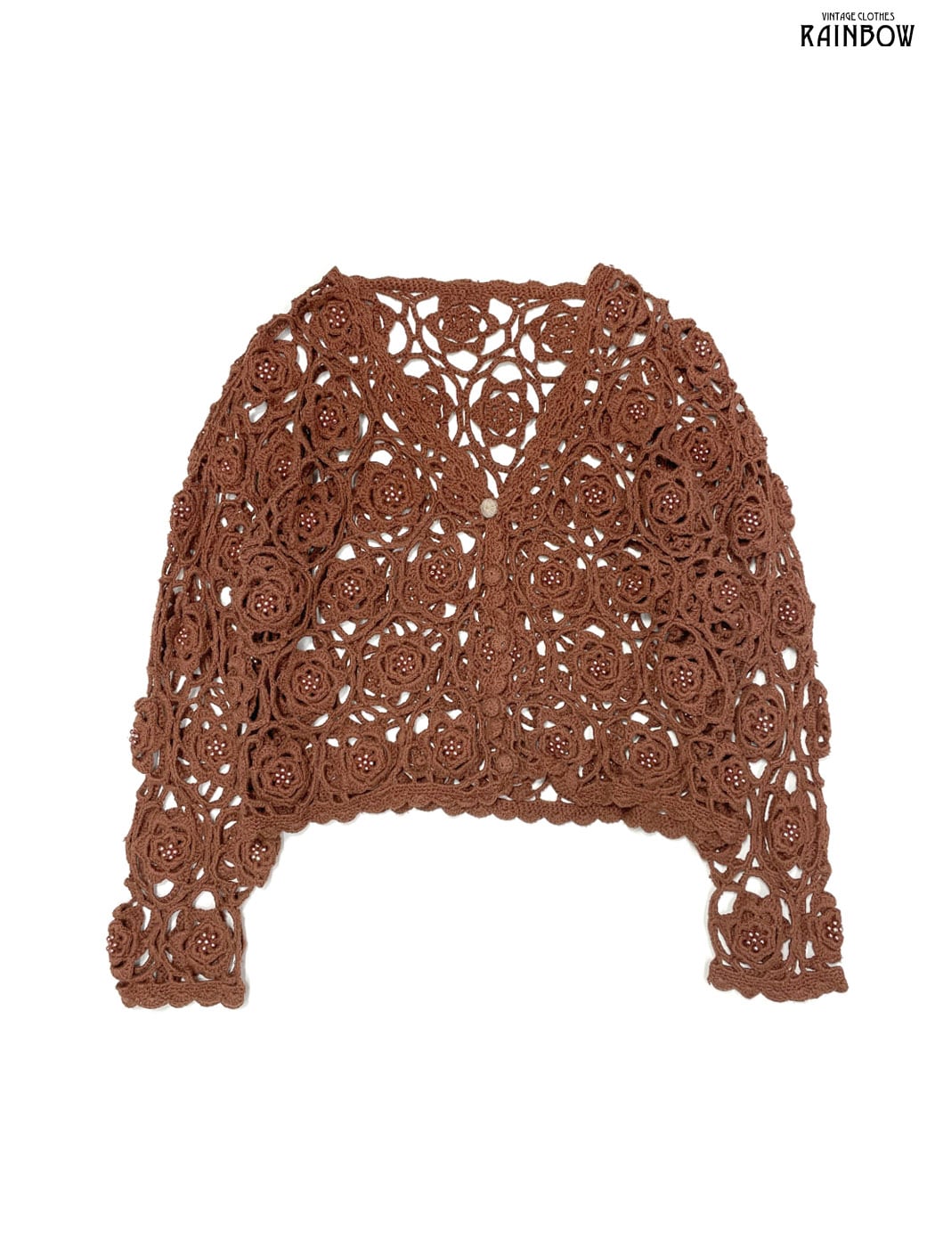 #ニット #カーディガン #ロングスリーブ #茶 #無地 #フラワーモチーフ #パール #刺繍 #ビジュー #前開き #ヴィンテージ #ニット地 #無地カーディガン