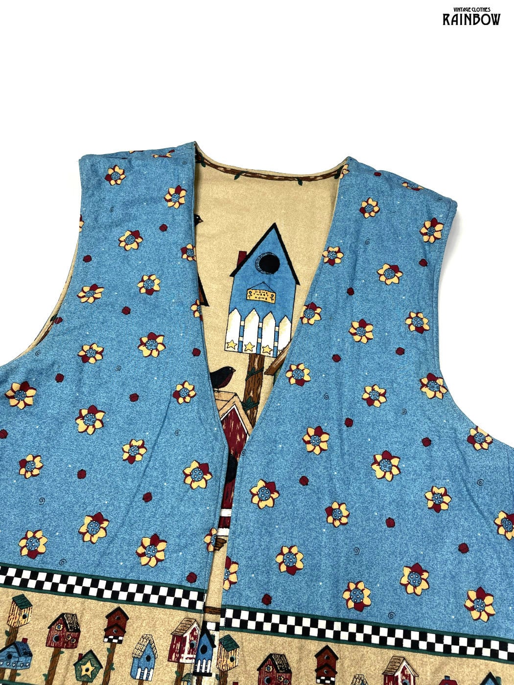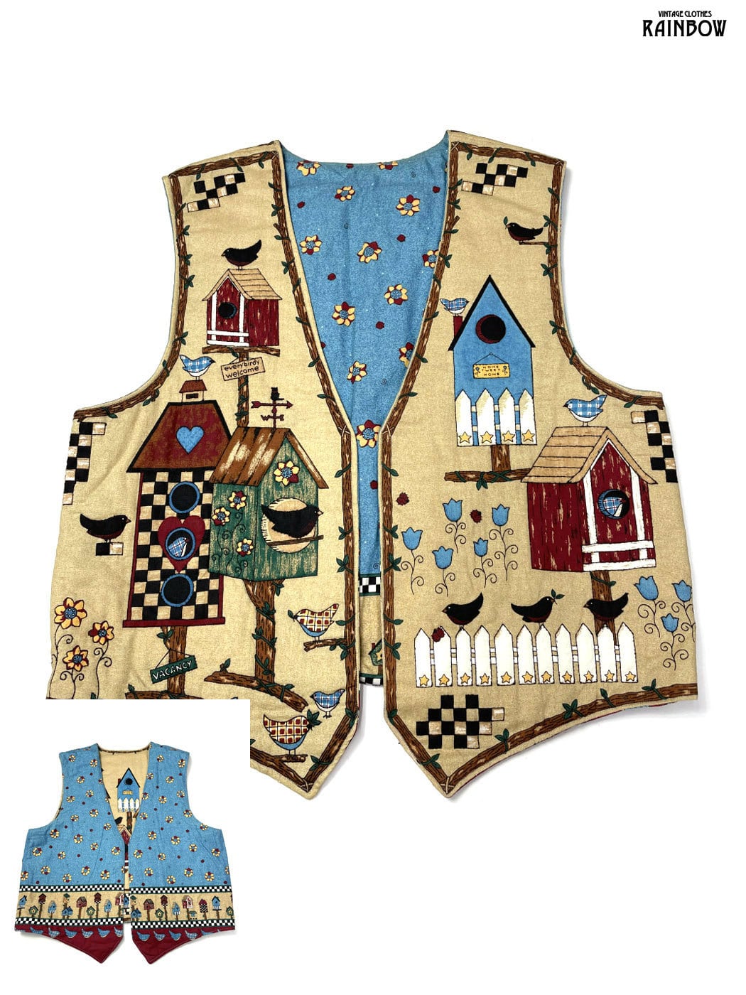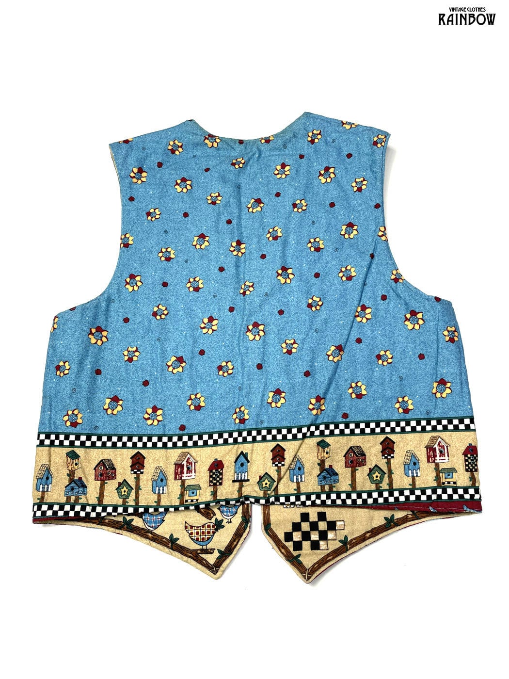 #トップス #ベスト #ノースリーブ #青 #ベージュ #花柄 #総柄 #鳥小屋 #リバーシブル #コットン #ベスト