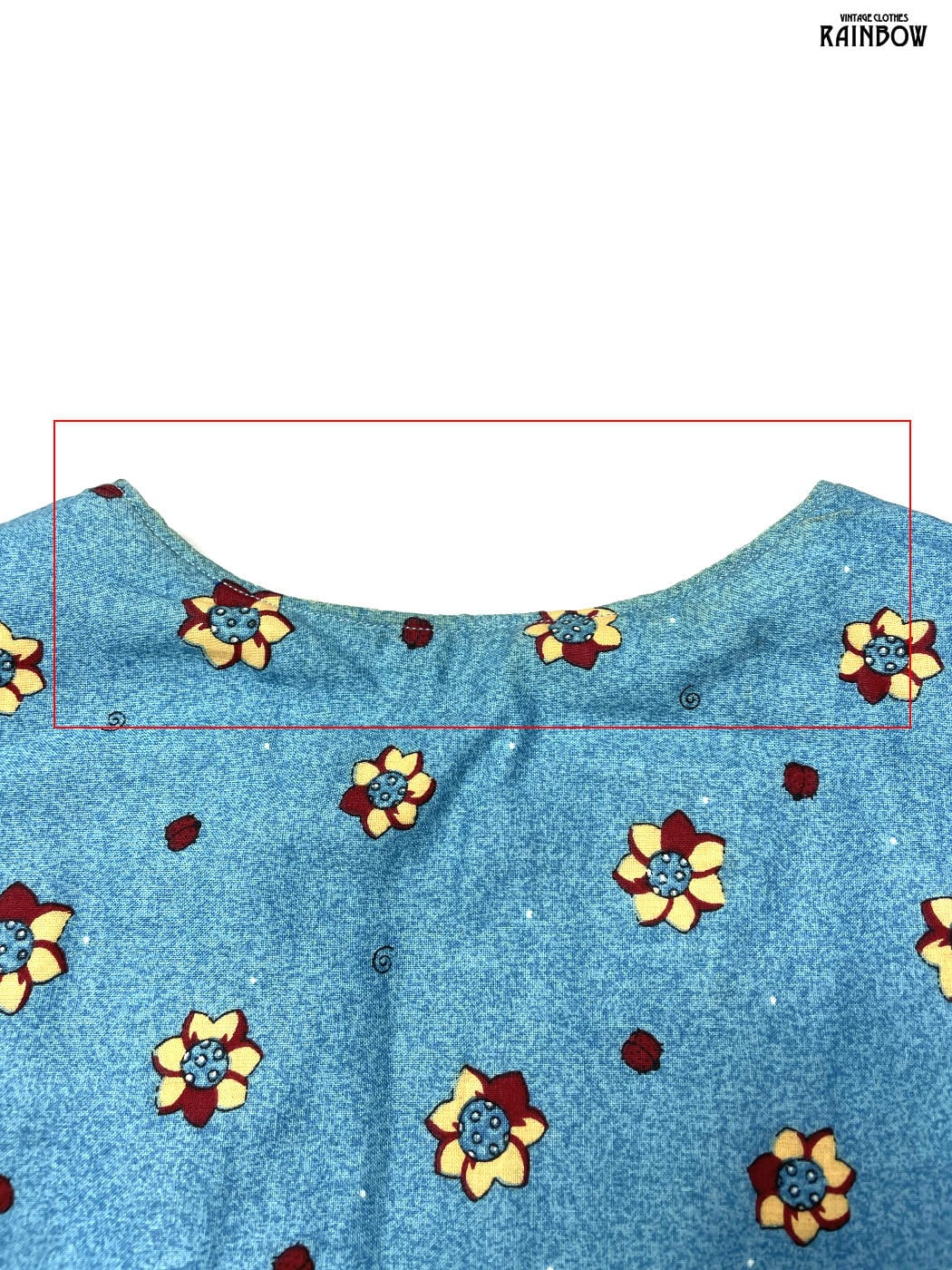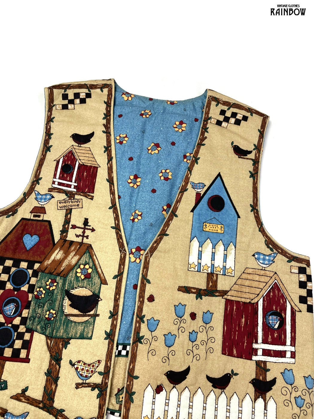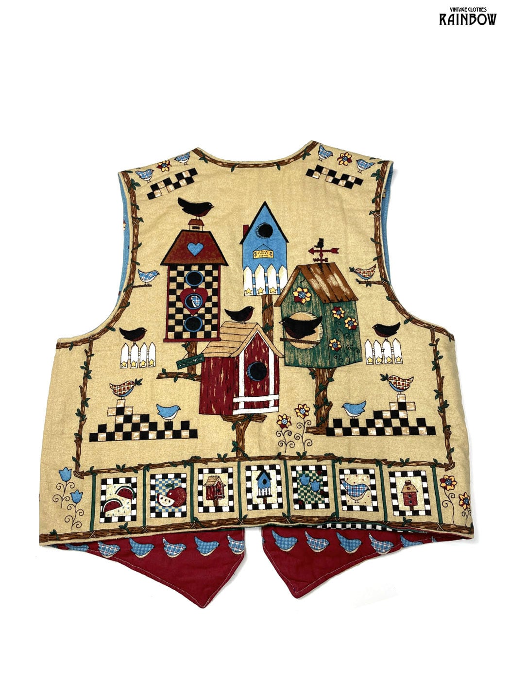 #トップス #ベスト #ノースリーブ #青 #ベージュ #花柄 #総柄 #鳥小屋 #リバーシブル #コットン #ベスト