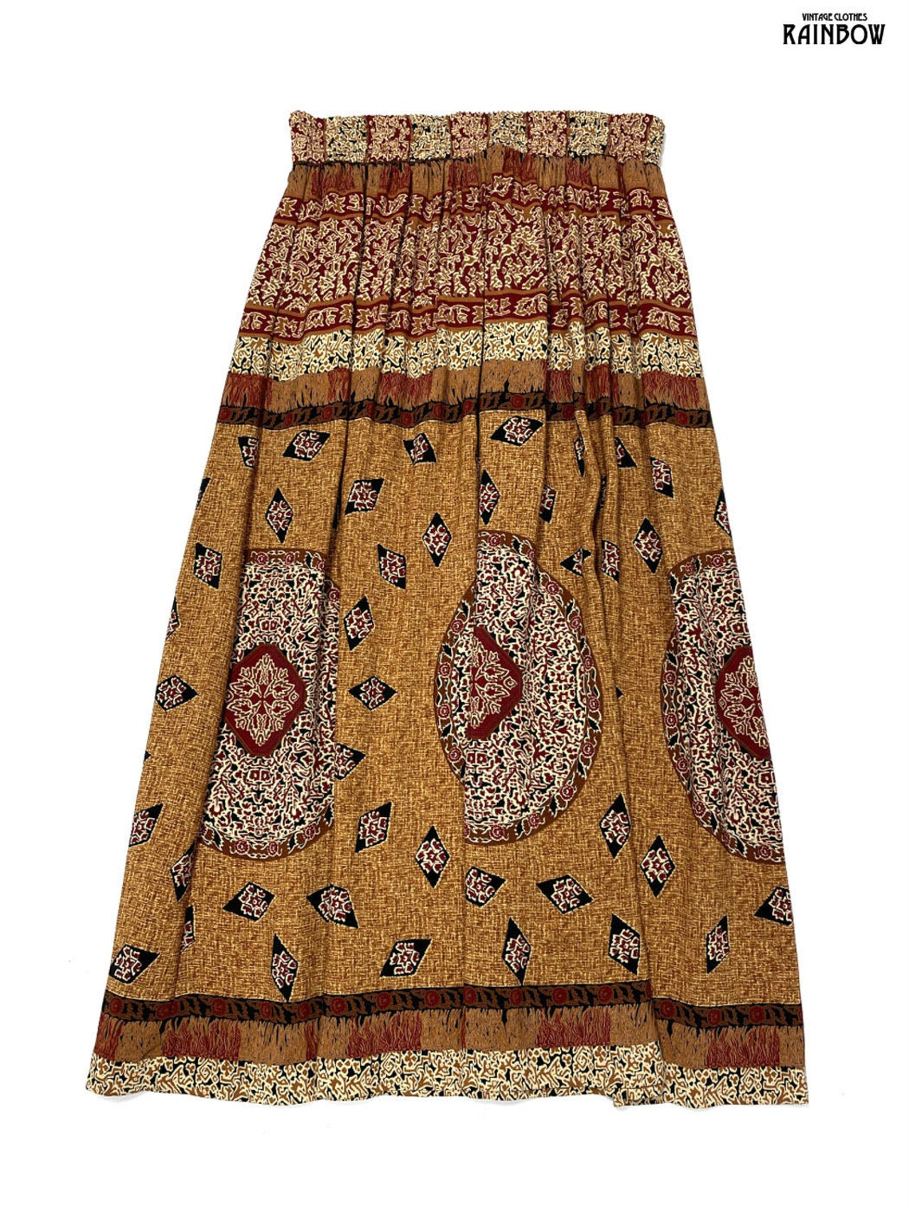 #スカート #ロング丈 #ゴムウエスト #茶 #オレンジ #総柄 #アメリカ製 #クラシック #レーヨン #秋冬柄スカート