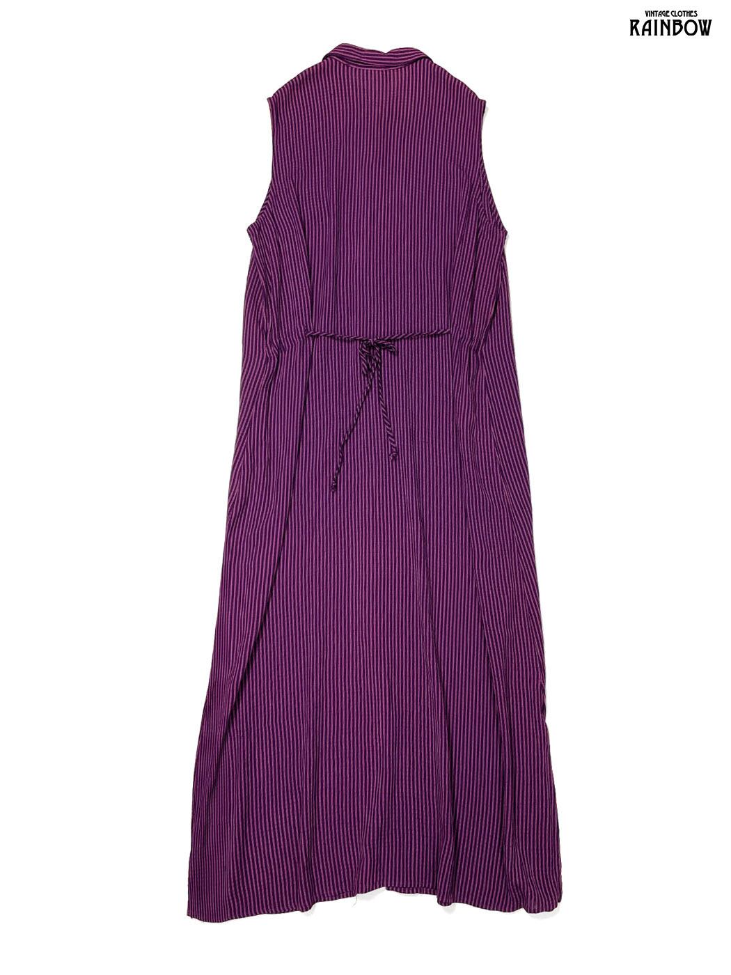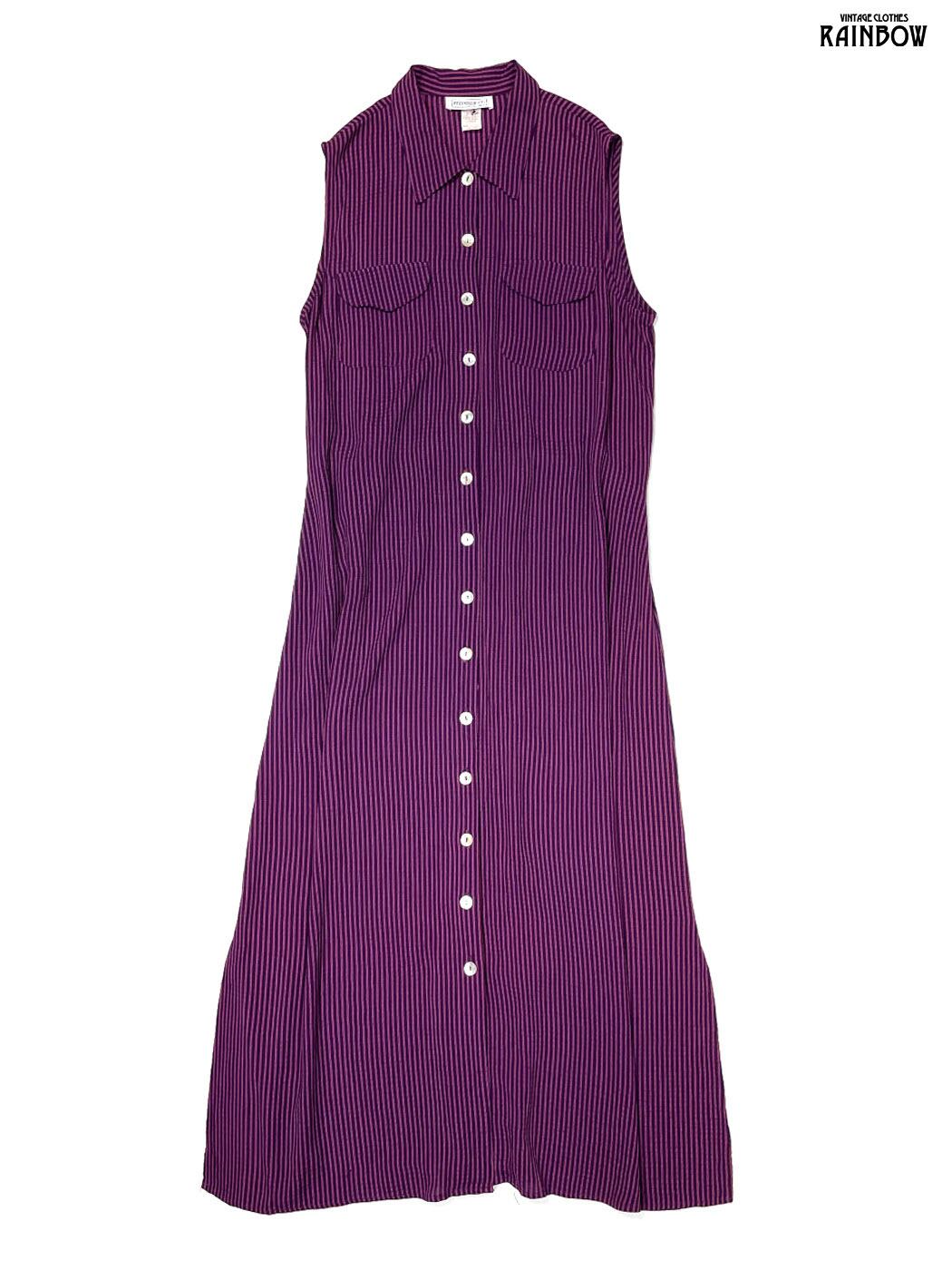 #ワンピース #ノースリーブ #ロング丈 #紫 #ストライプ柄 #アメリカ製 #シェルボタン #前開き #レーヨン #ノースリーブストライプ柄ワンピース