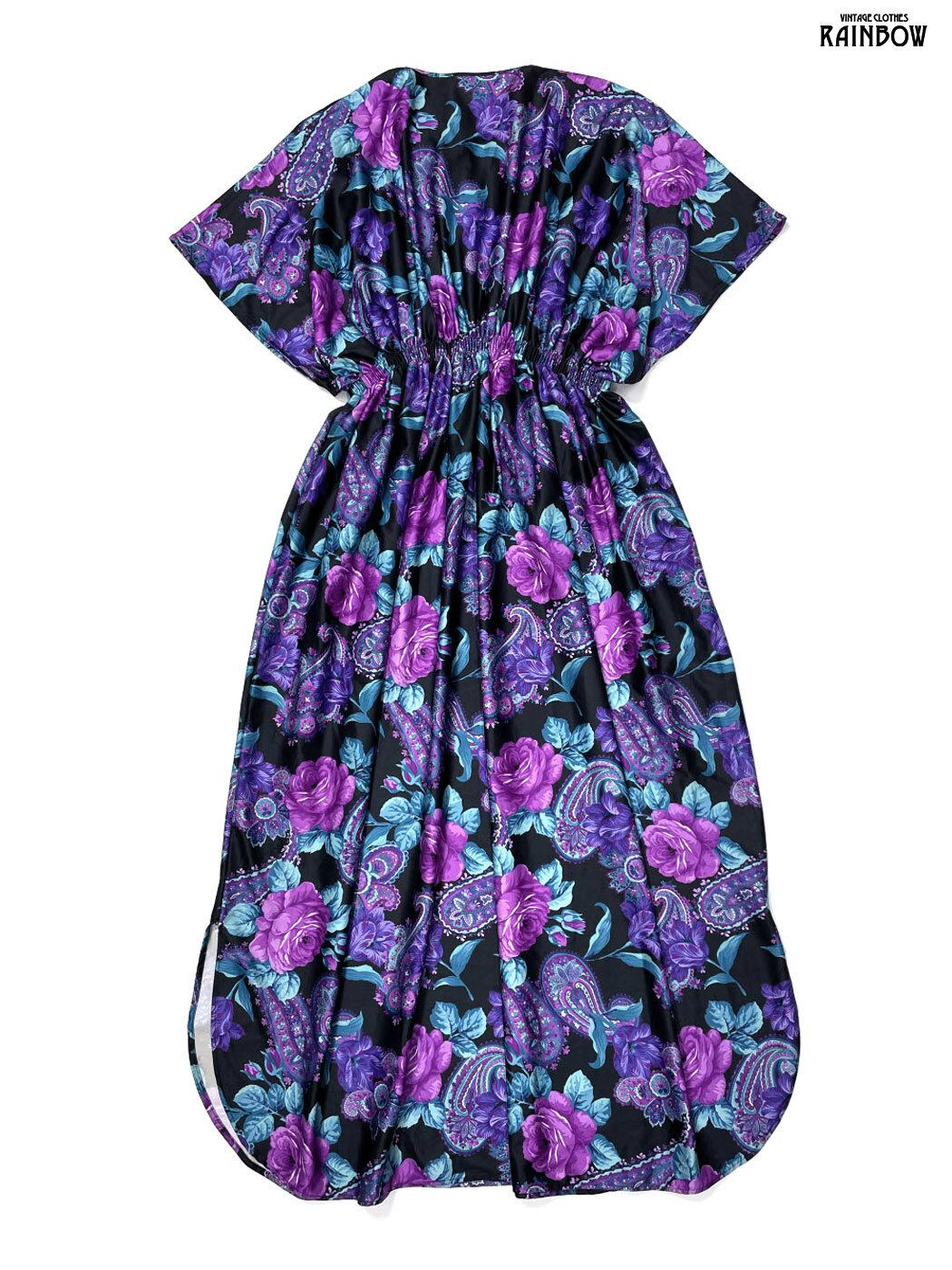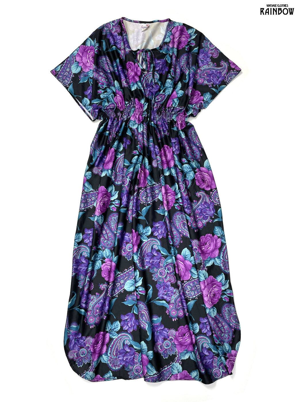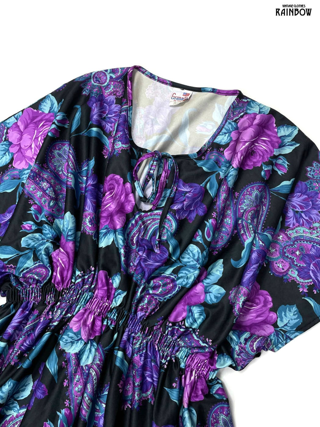 古着 Granada アメリカ製 リボン 花柄 総柄 ロング丈 半袖 ワンピース 紫 黒 (otu2511006)