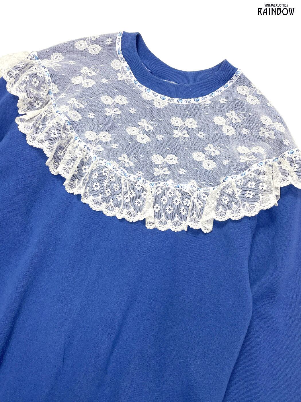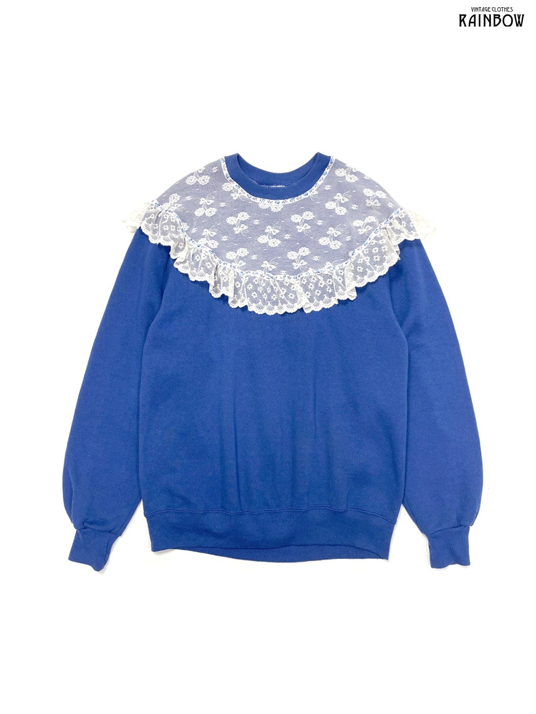 古着 フリル リボン 花柄 刺繍レース 無地 長袖 スウェット トレーナー 青 (ttu2511057)