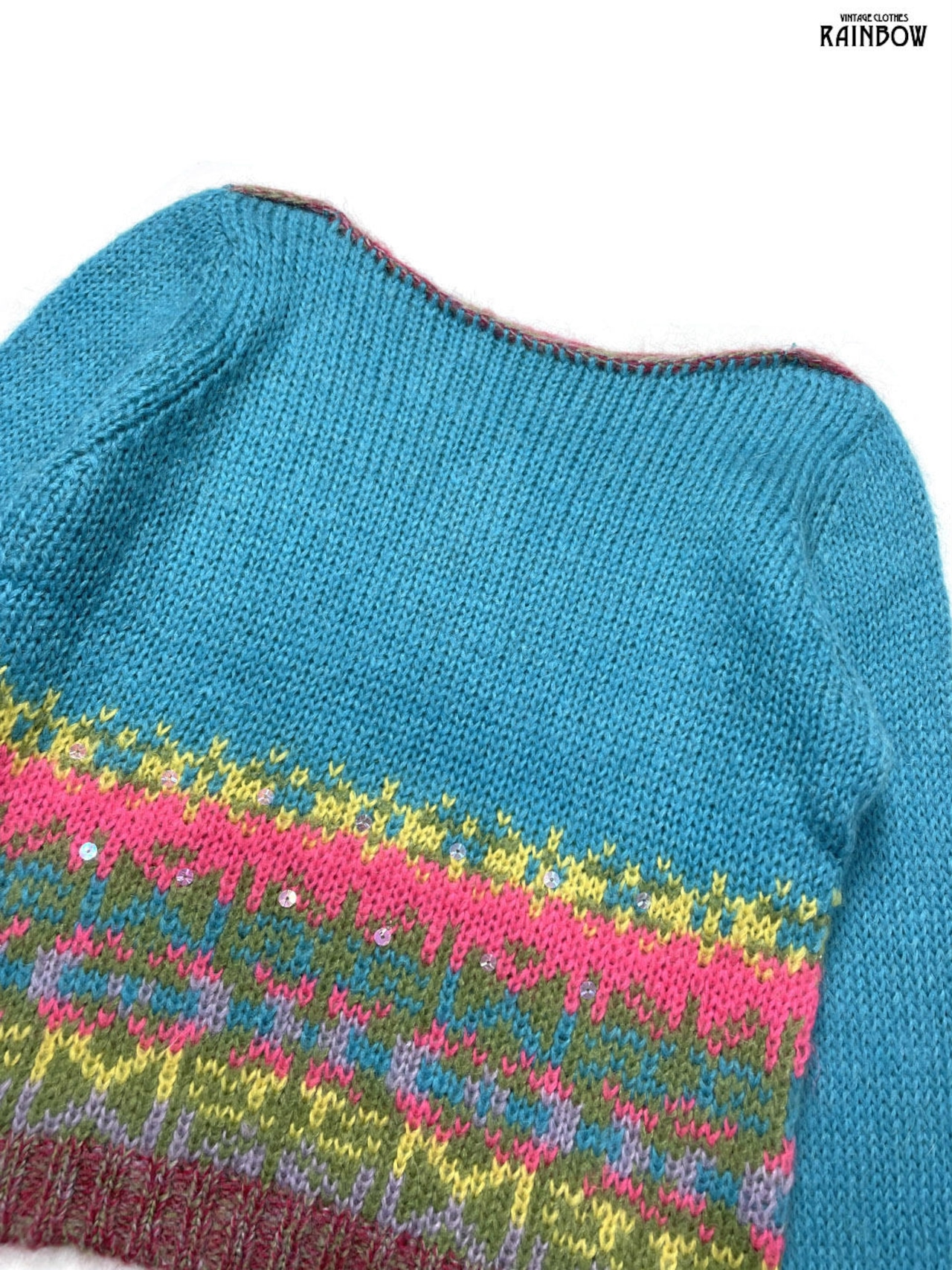 #ニット #セーター #ロングスリーブ #青 #総柄 #スパンコール #ニット地 #柄セーター