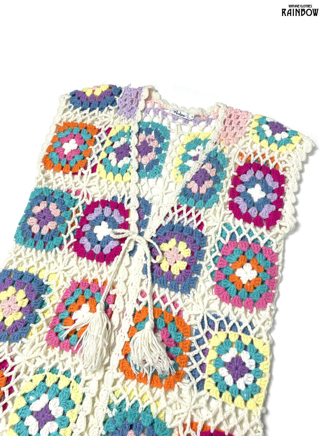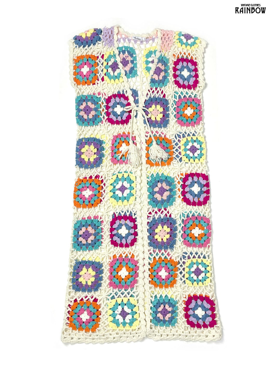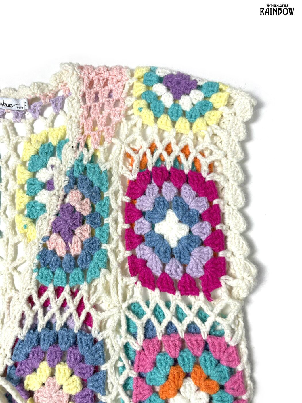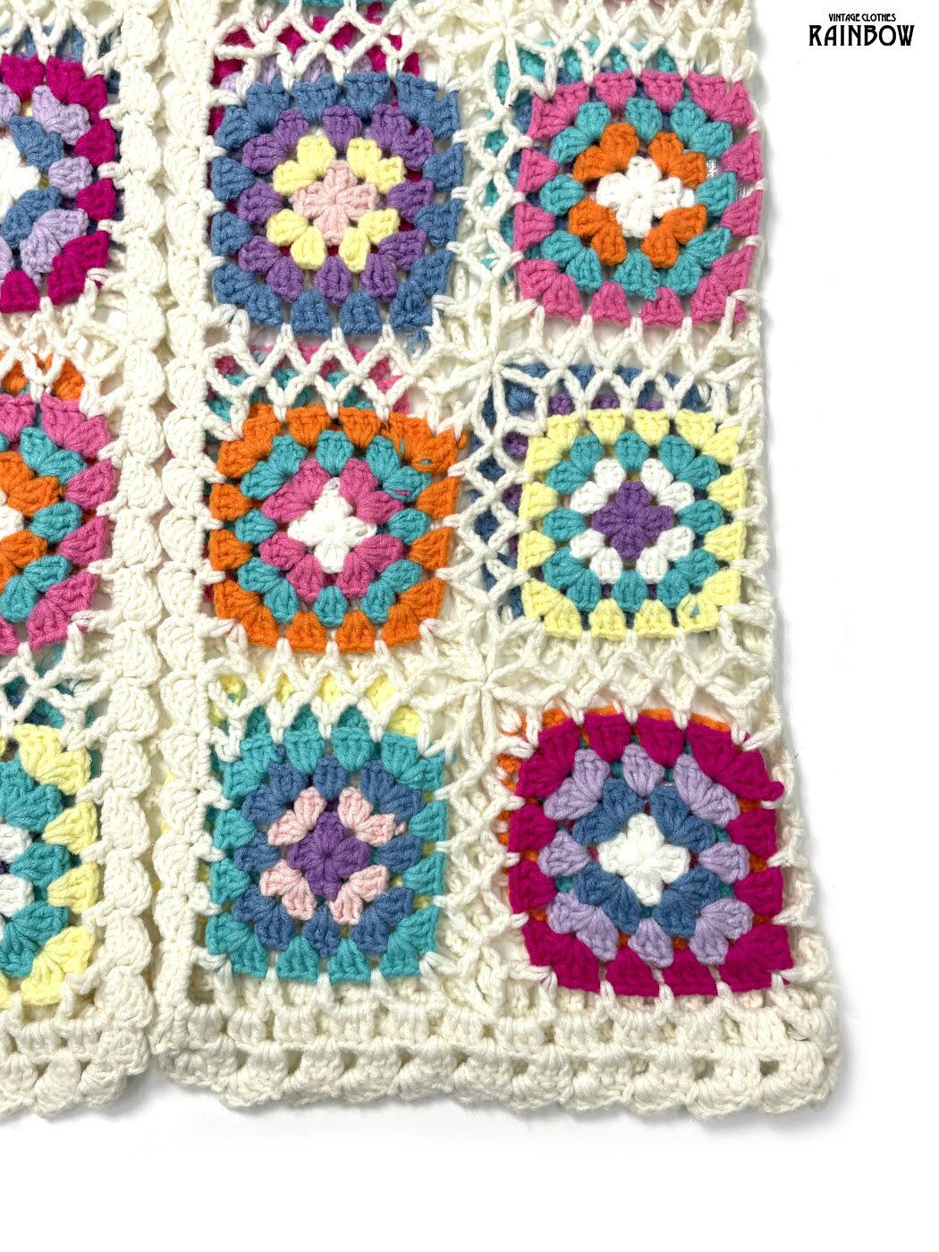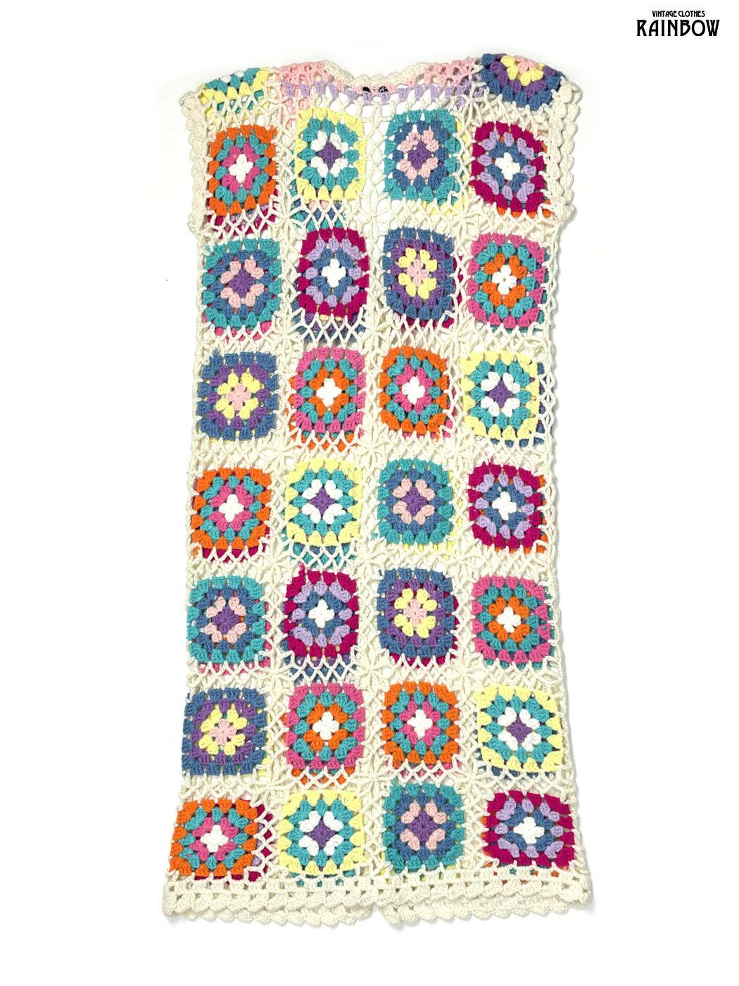 古着 リボン 総柄 ロング丈 長袖 グラニースクエア カギ編み ニット カーディガン カラフル (ttu2601004)