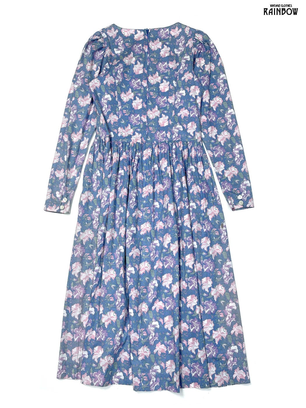 古着 Laura Ashley ローラアシュレイ イギリス製 花柄 コットン100% ロング丈 長袖 ワンピース 紫 水色 (otu2601004)