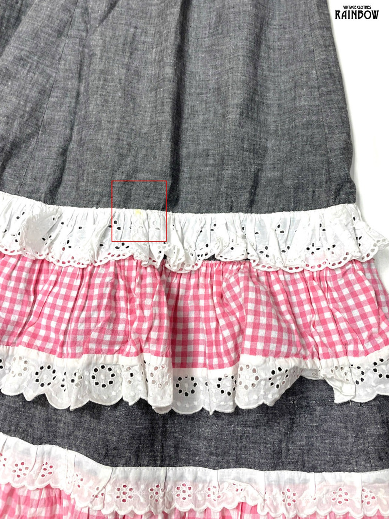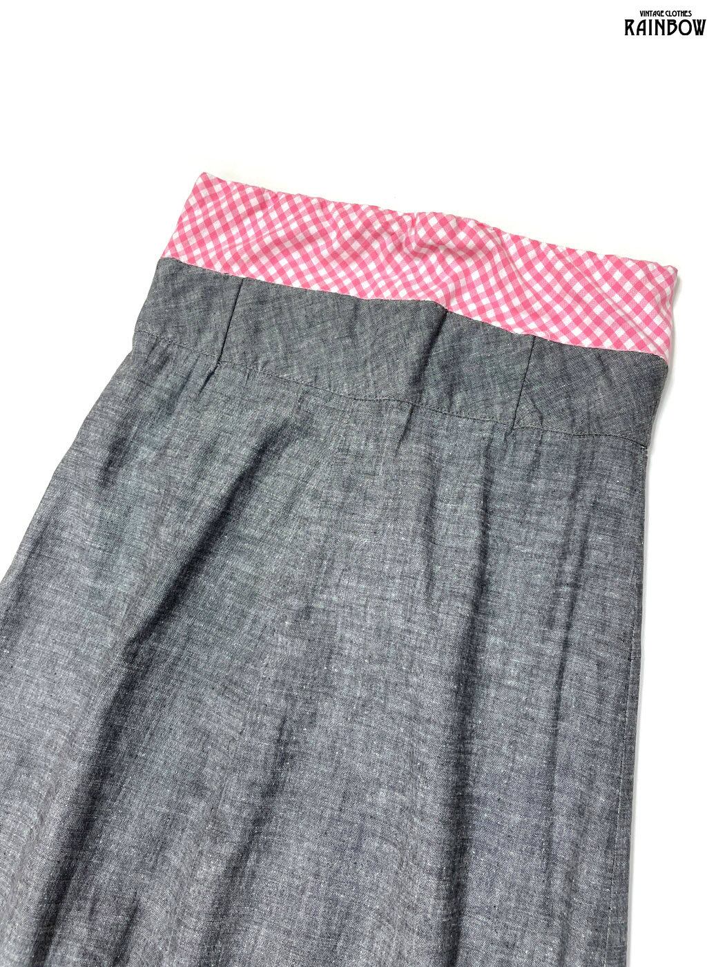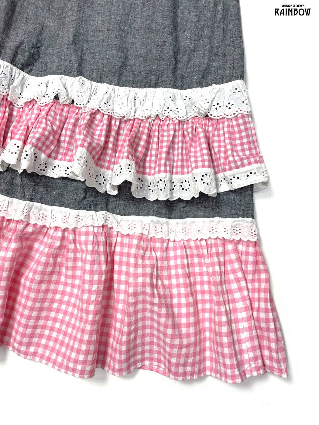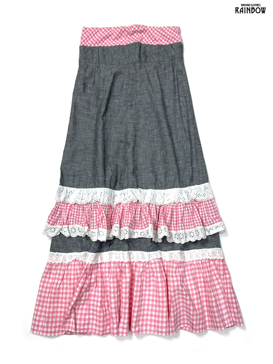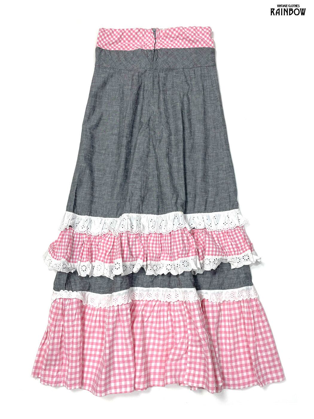 古着 レース 無地 ギンガムチェック柄 コットン ロング丈 ティアード スカート ピンク グレー (btu2601002)