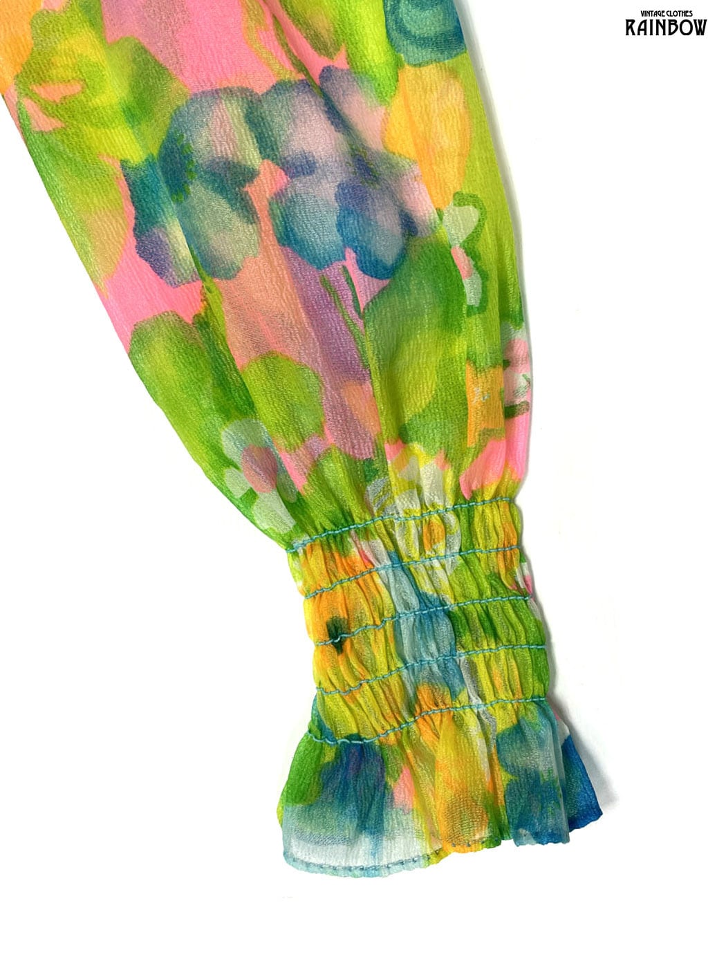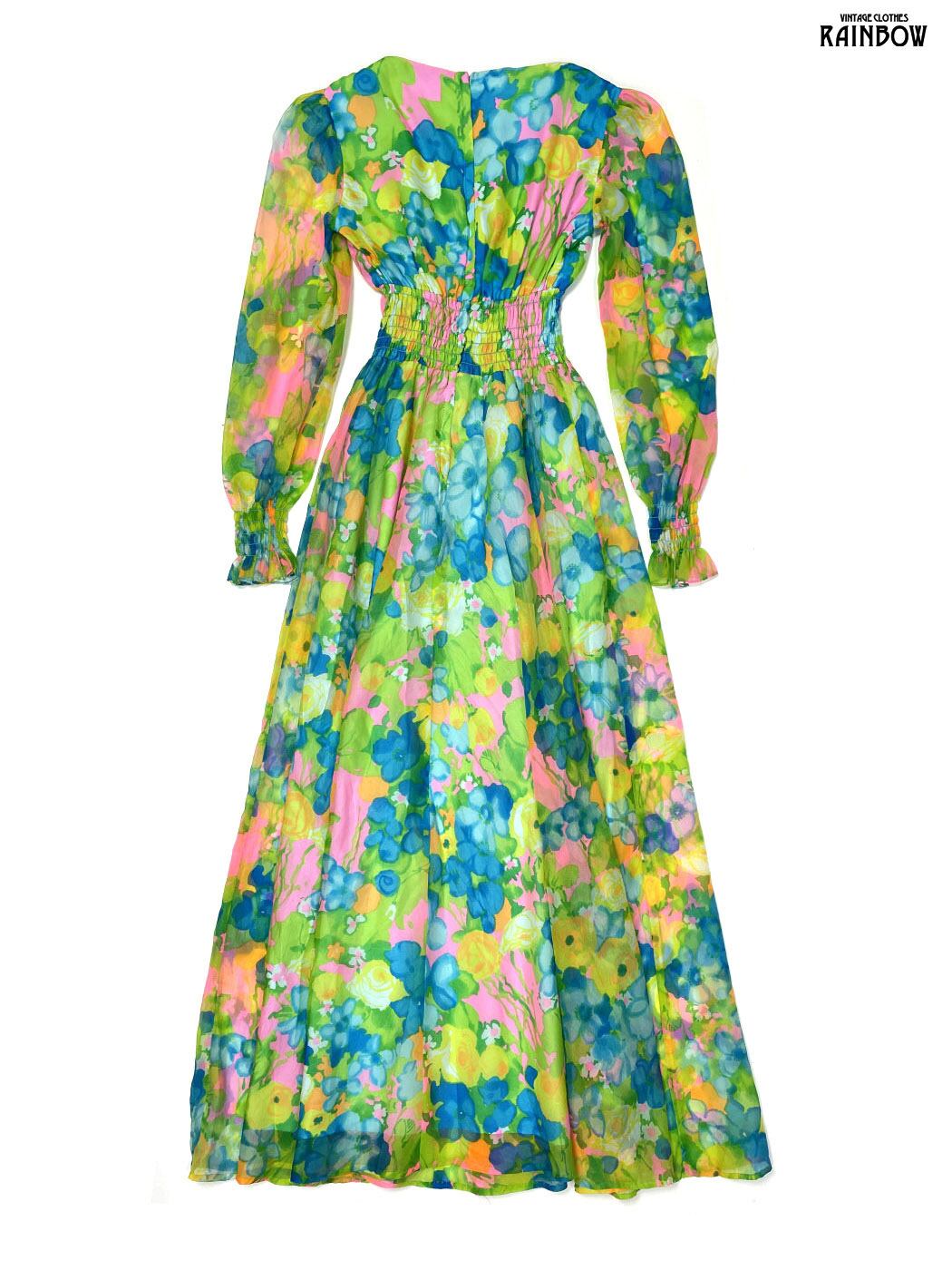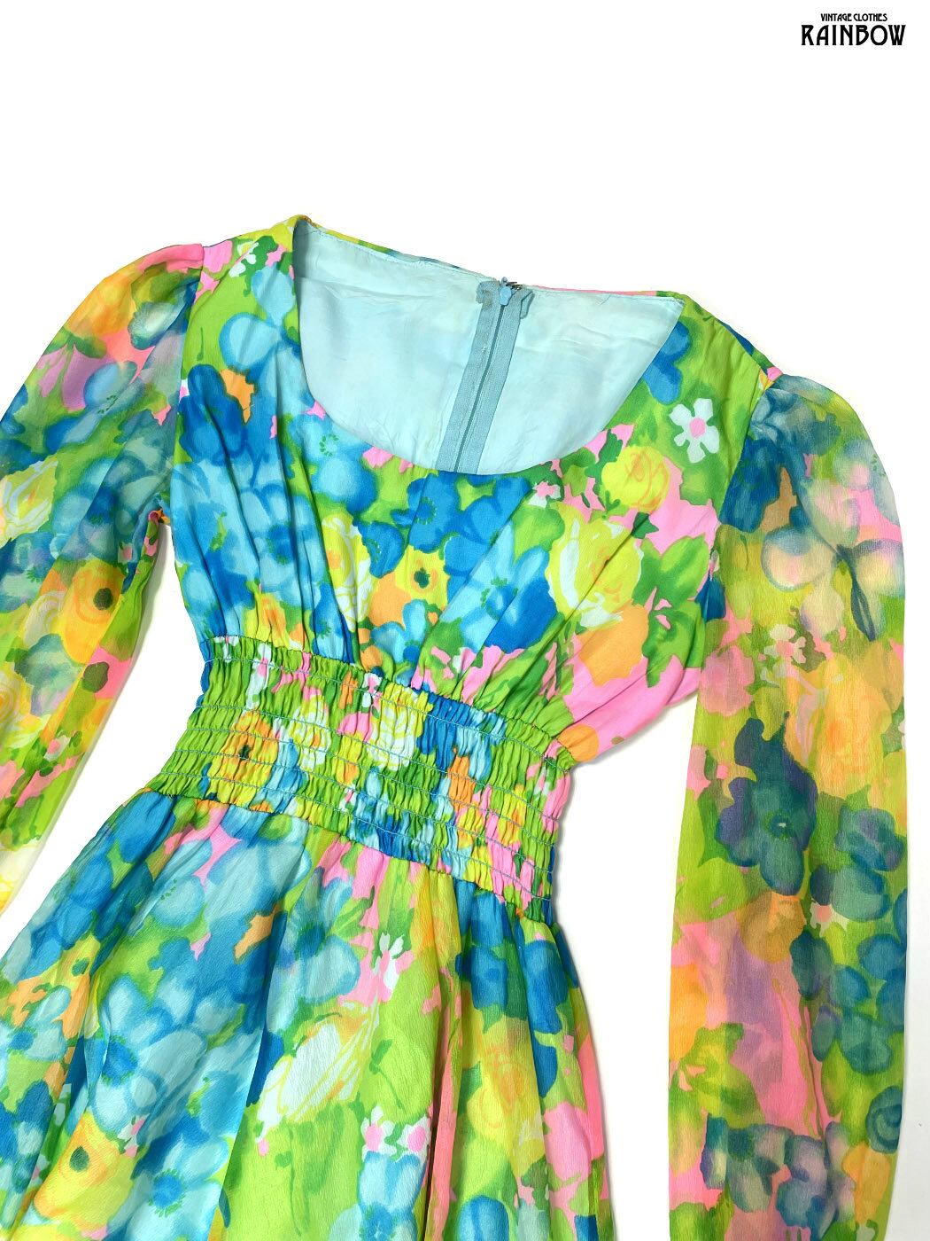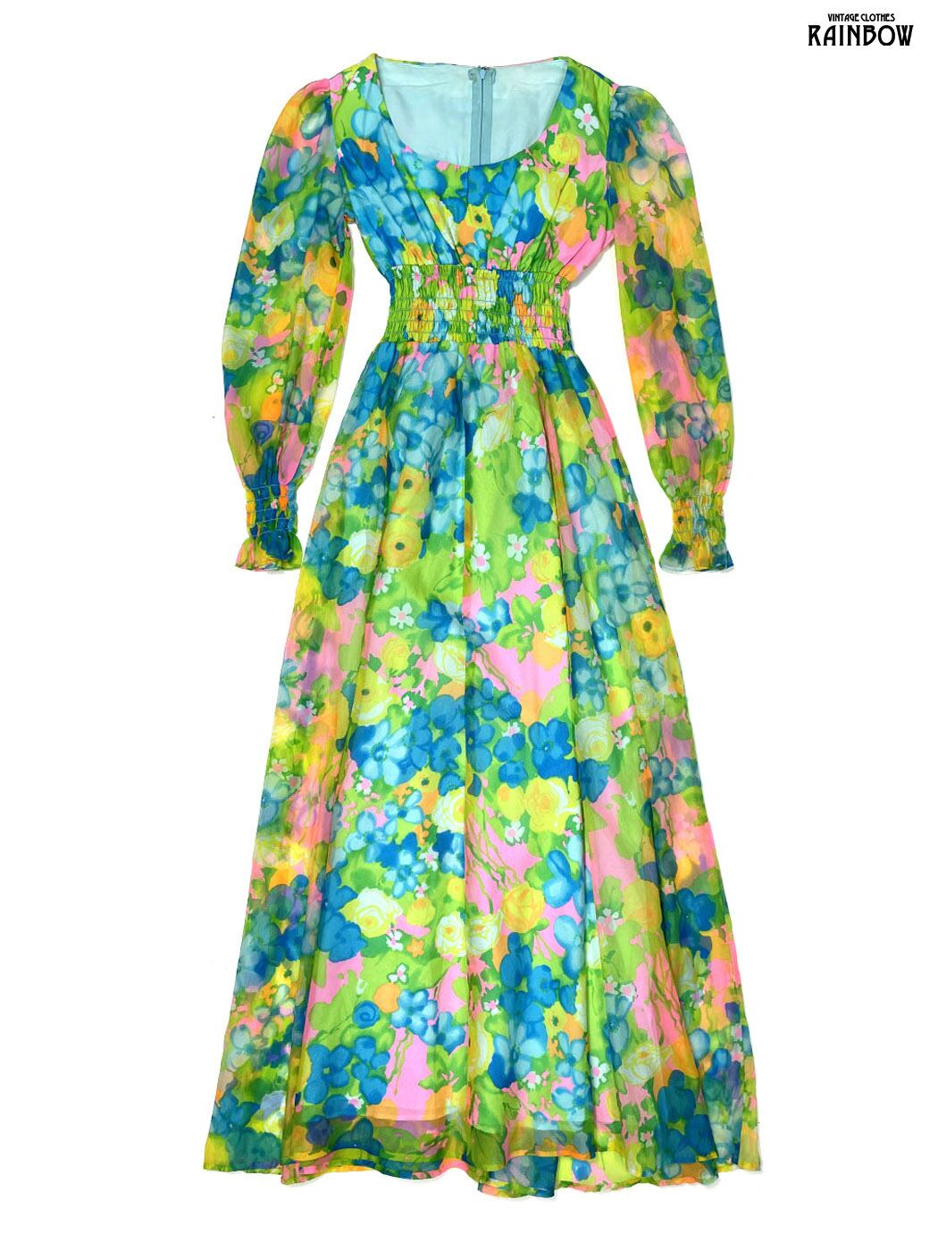 #ワンピース #ロングスリーブ #ロング丈 #ゴムウエスト #緑 #花柄 #ガーリー #シフォン #シフォンワンピース