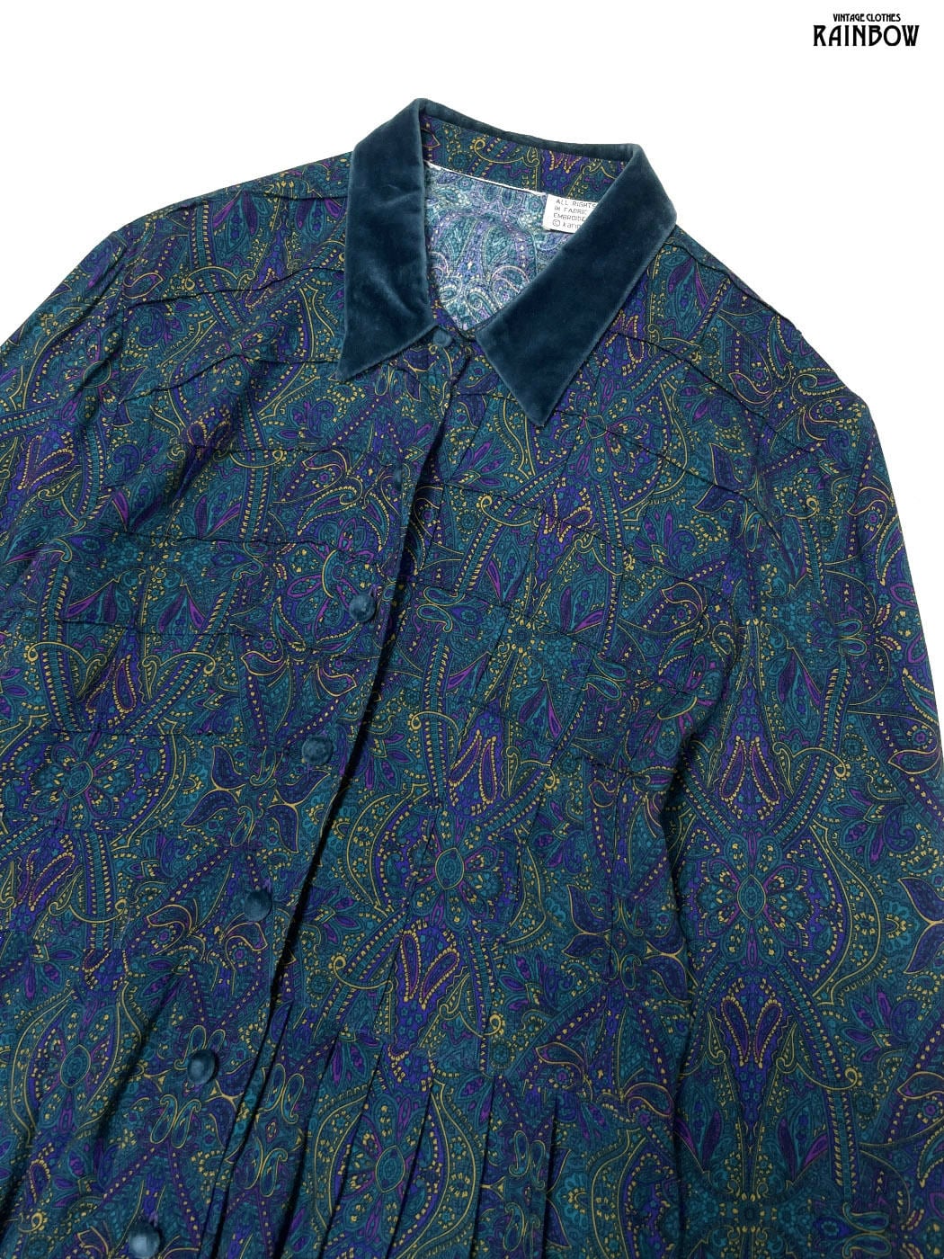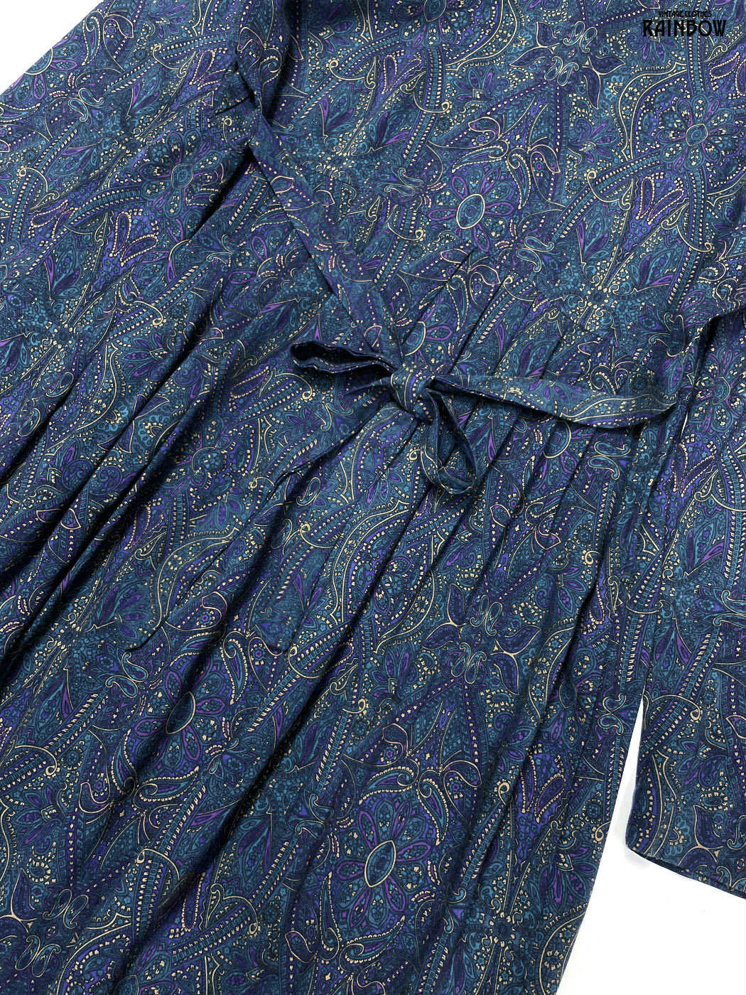 #ワンピース #ロングスリーブ #ロング丈 #ウエスト切り替え #青 #紺 #総柄 #ペイズリー柄 #リボン #前開き #クラシック #レーヨン #前開きシャツワンピース