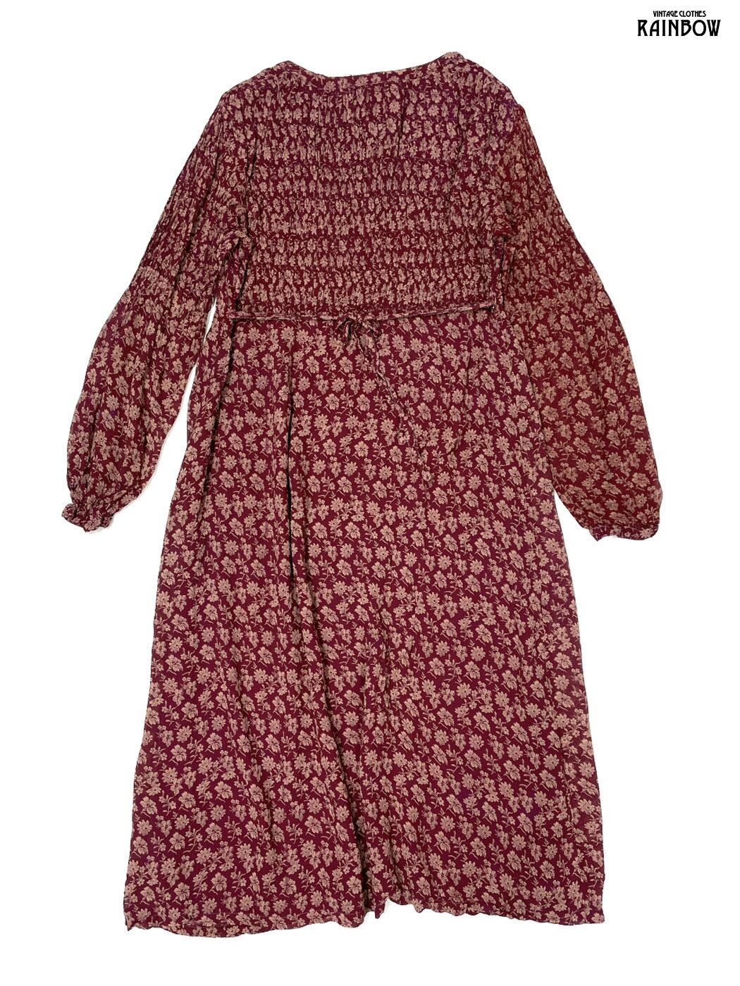 古着 April Cornell エイプリルコーネル リボン 花柄 ロング丈 長袖 ワンピース 赤 ボルドー (otu2601023)