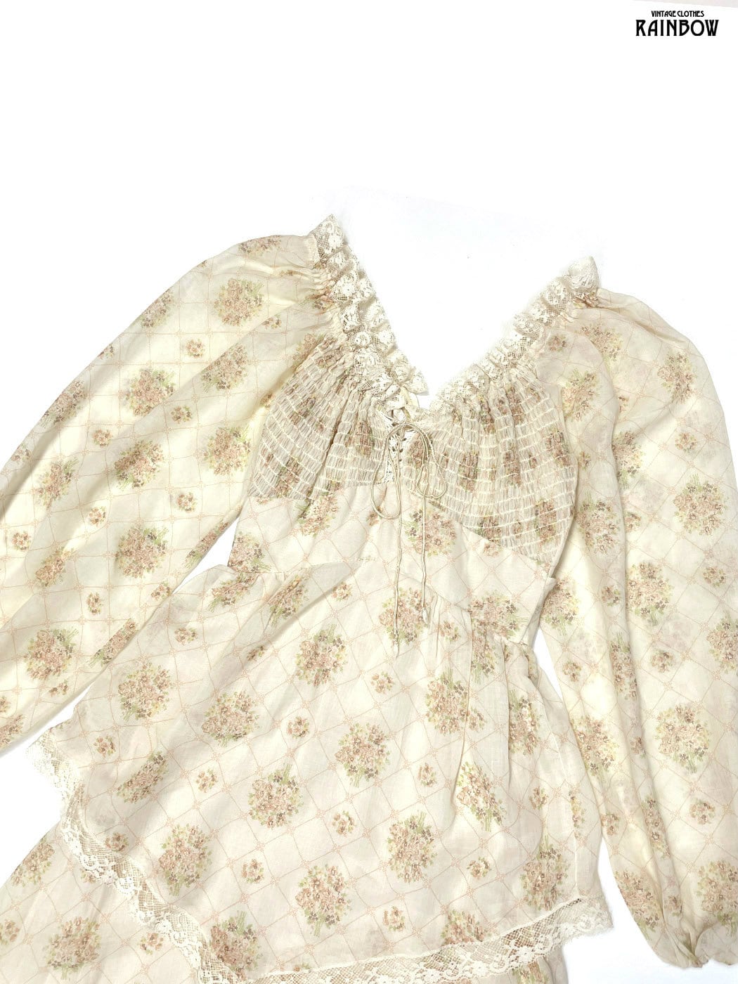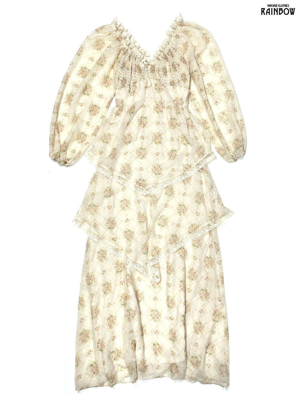 古着 リボン レース 花柄 コットン シフォン ロング丈 長袖 ワンピース ベージュ (otu2601039)