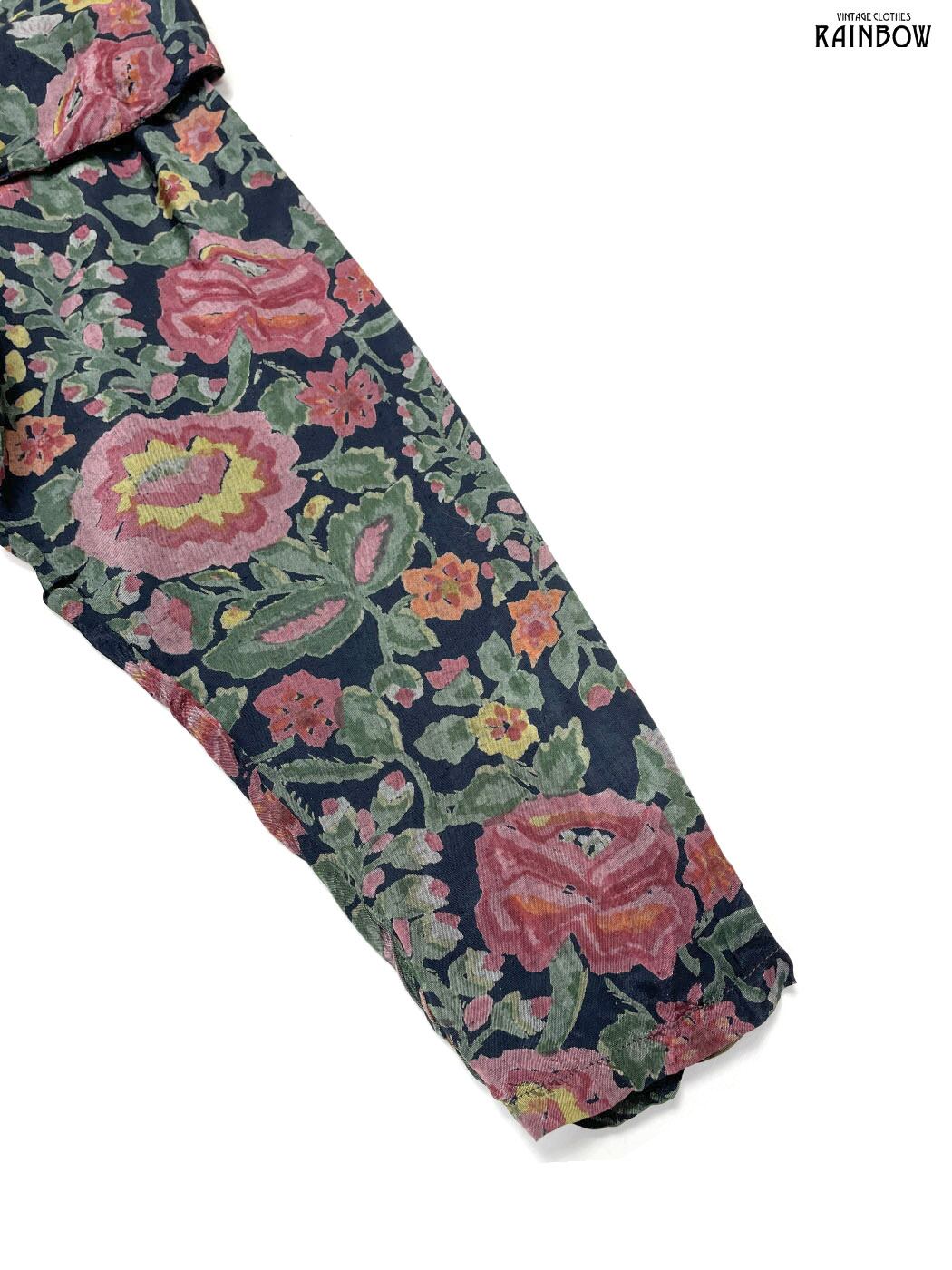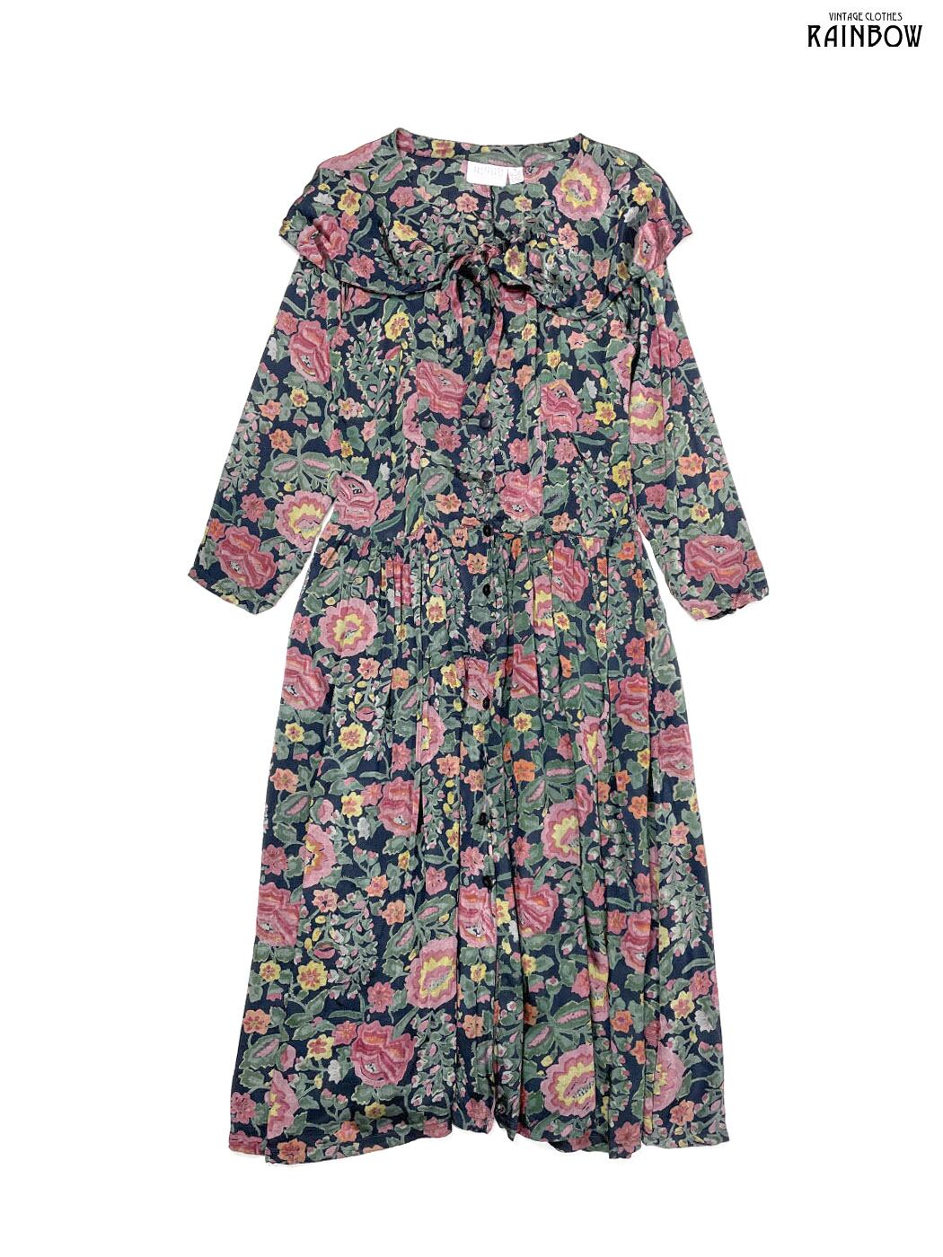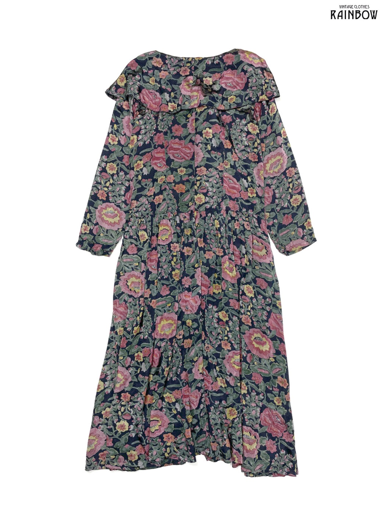 古着 PASSPORTS セーラーカラー 前開き 花柄 ロング丈 長袖 ワンピース 紺 ピンク (otu2512005)