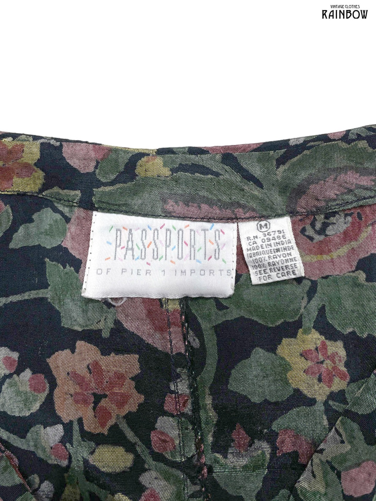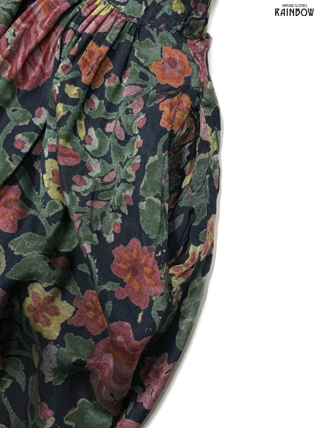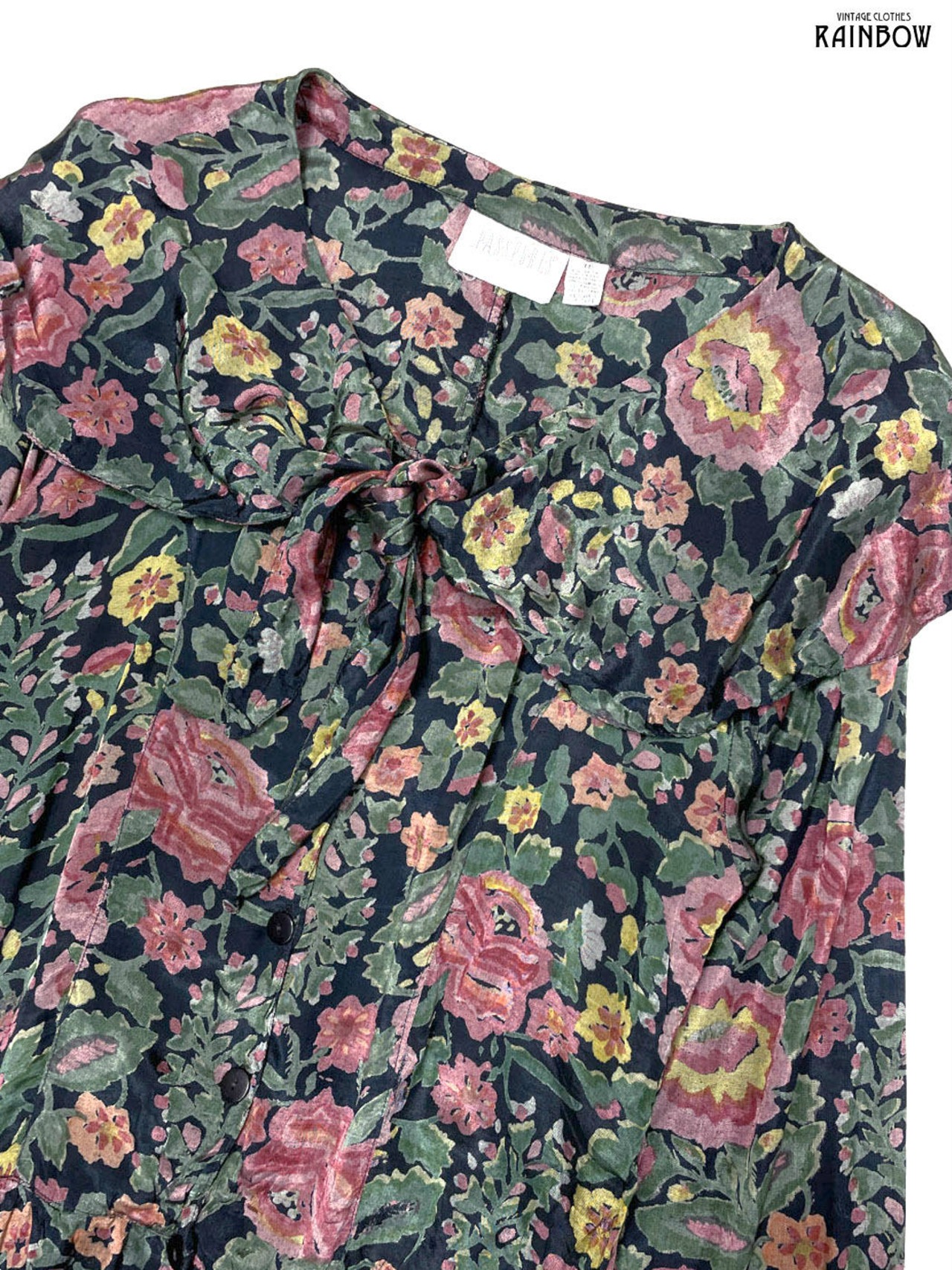 古着 PASSPORTS セーラーカラー 前開き 花柄 ロング丈 長袖 ワンピース 紺 ピンク (otu2512005)