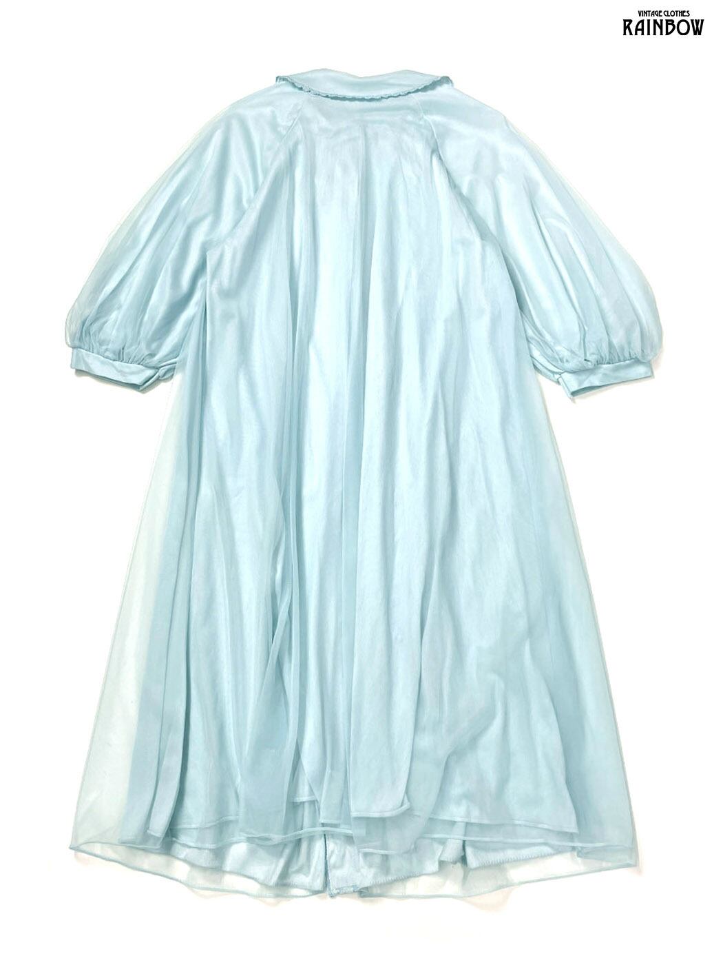 古着 刺繍 前開き 無地 シフォン ナイロン ロング丈 長袖 ワンピース 青 水色 (otu2601054)