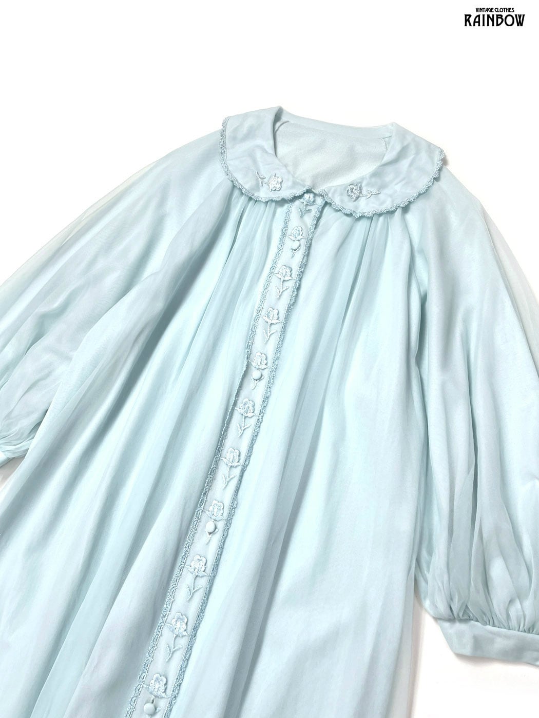 #ワンピース #ロングスリーブ #ロング丈 #青 #水色 #無地 #刺繍 #前開き #ガーリー #シフォン #ナイロン #シフォンワンピース
