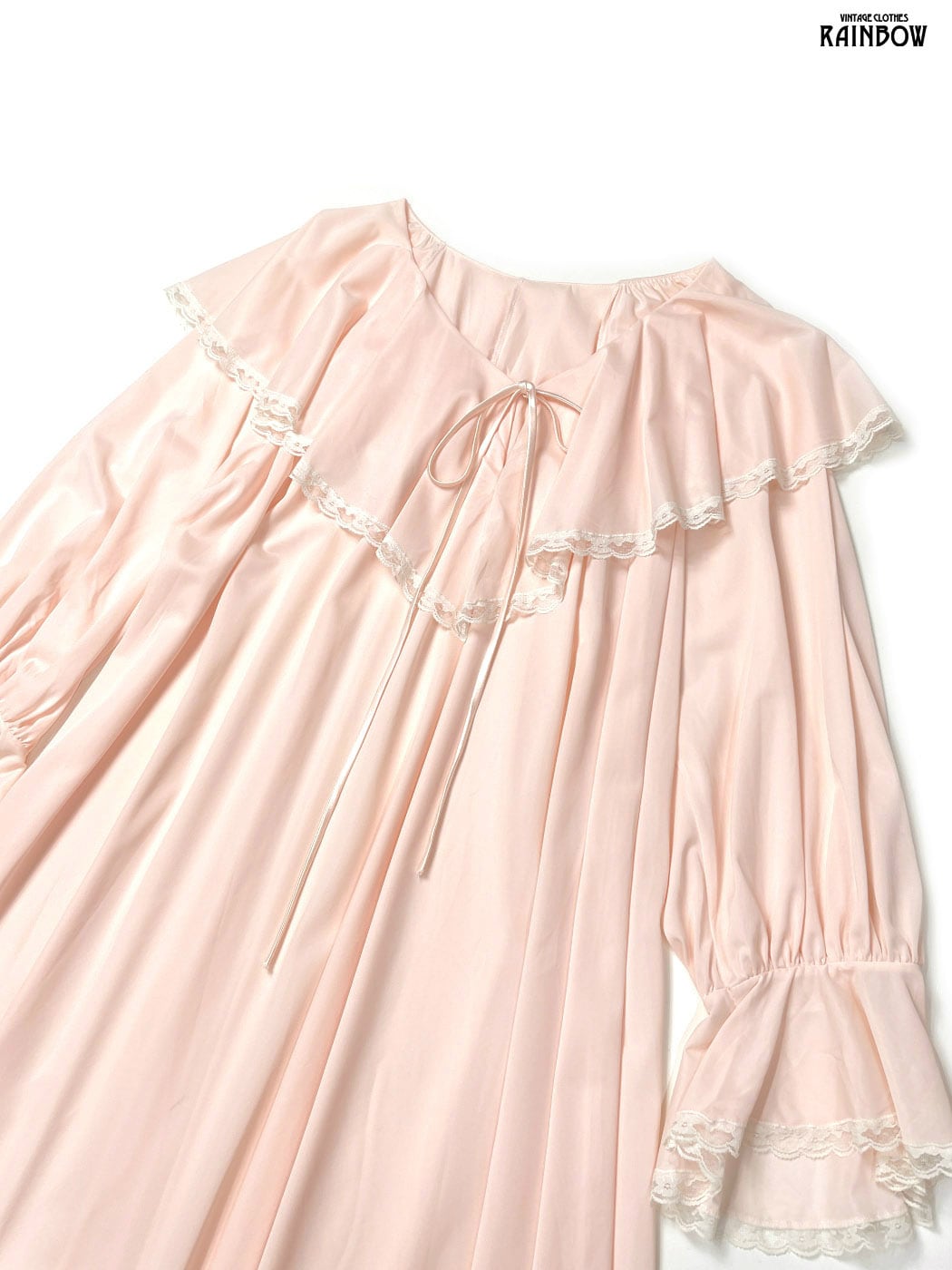 古着 リボン レース 無地 ナイロン ロング丈 長袖 ワンピース ピンク (otu2601057)