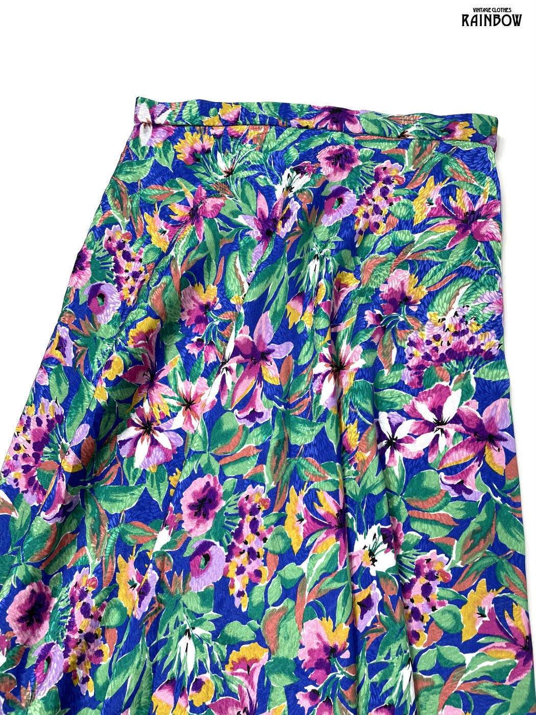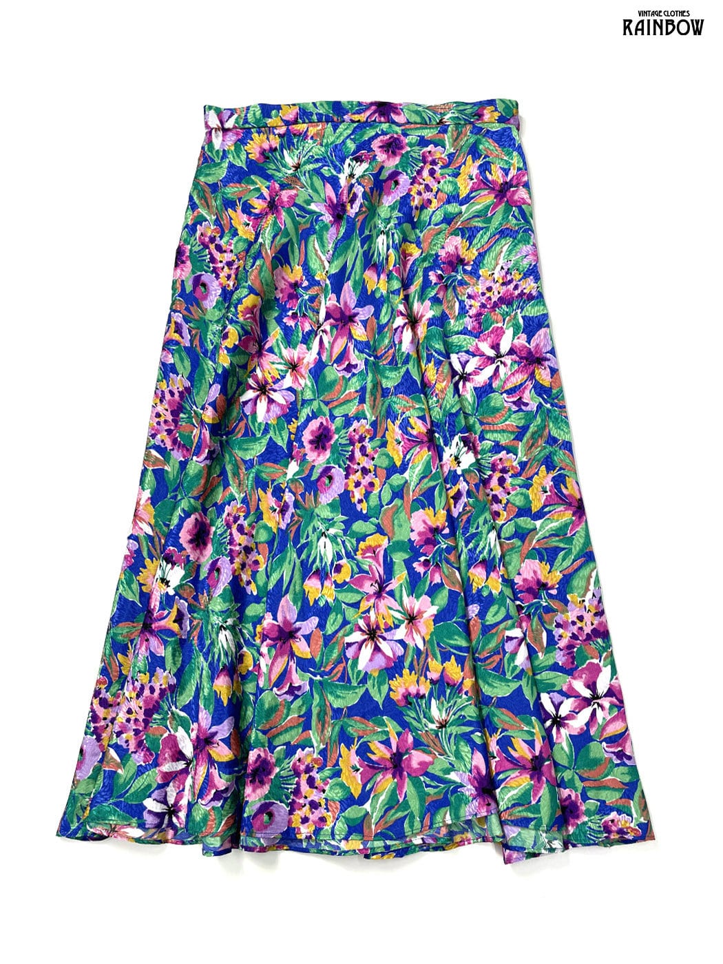 古着 花柄 サテン 膝丈 スカート 青 紫 (btu2601079)