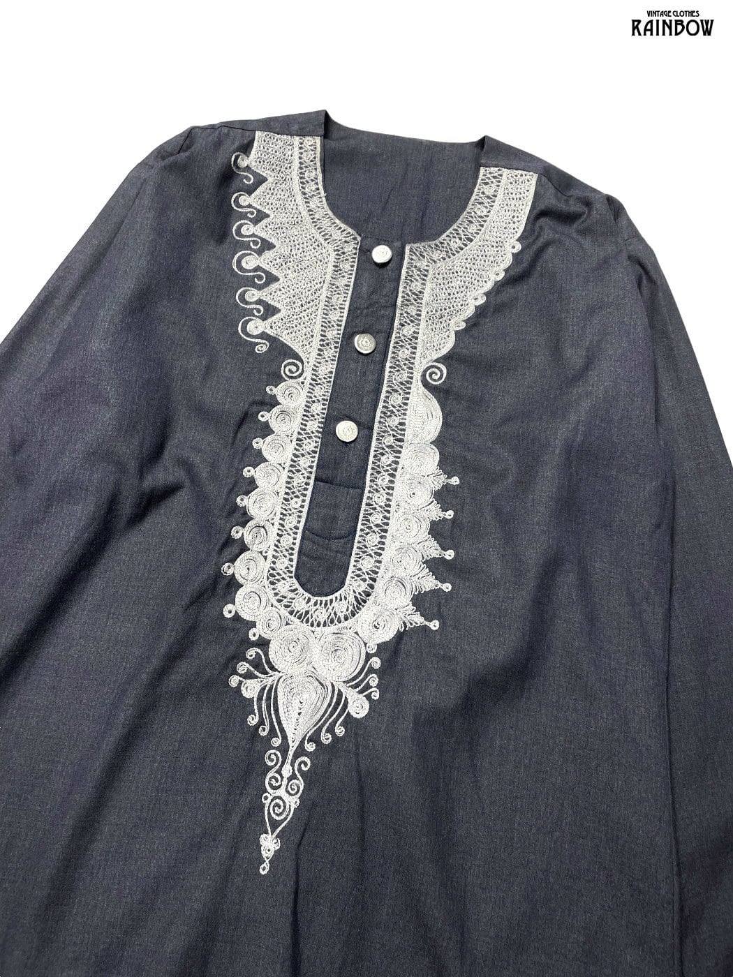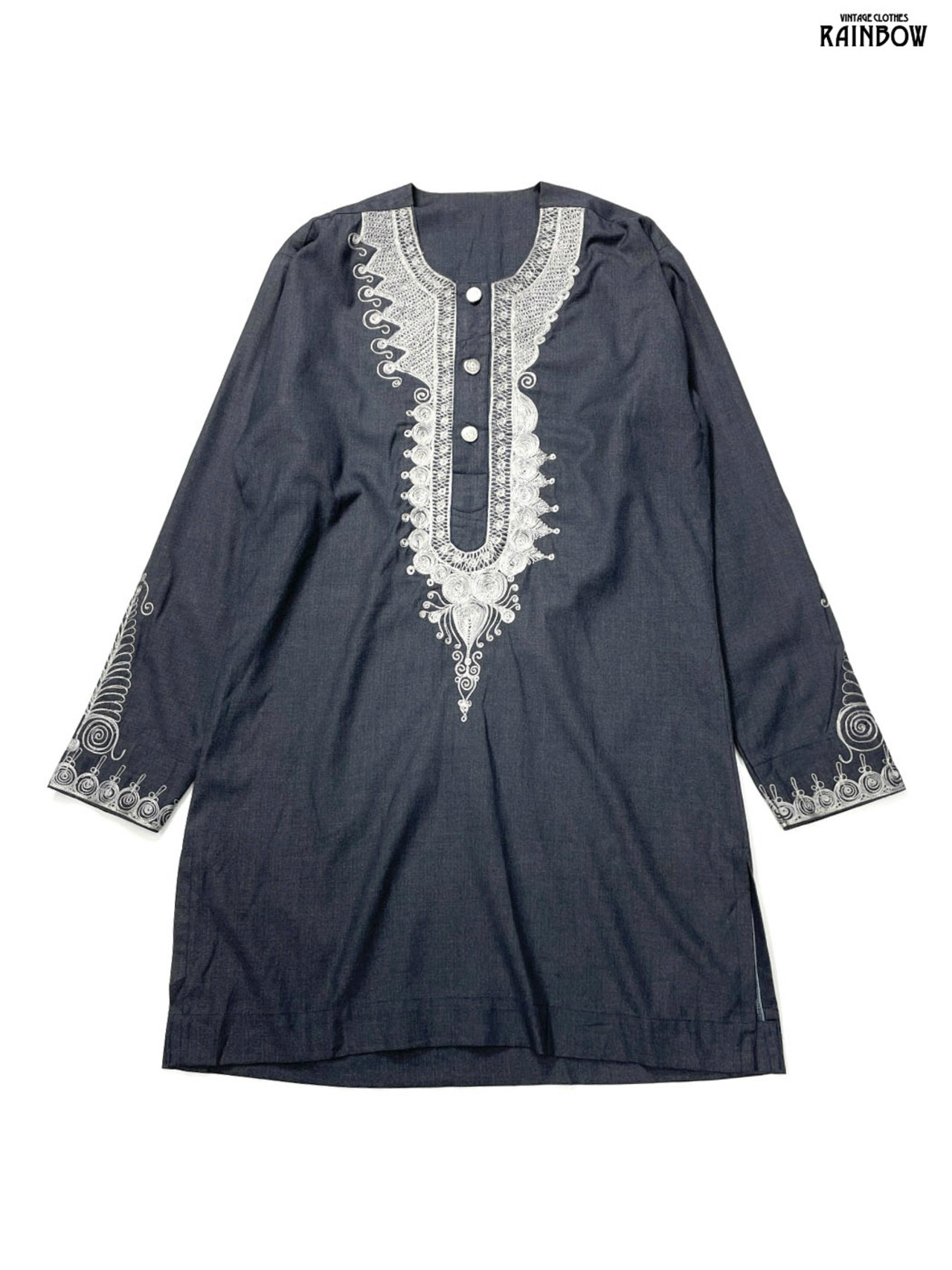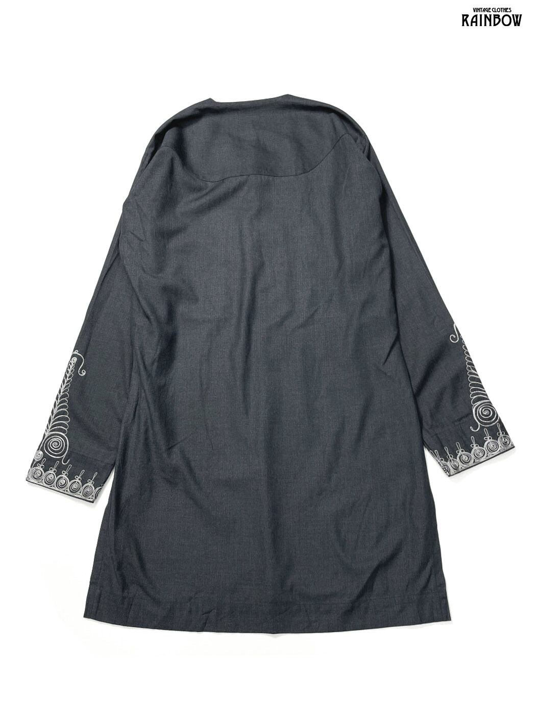 古着 刺繍 スリット 無地 コットン 膝丈 長袖 ワンピース グレー (otu2601070)