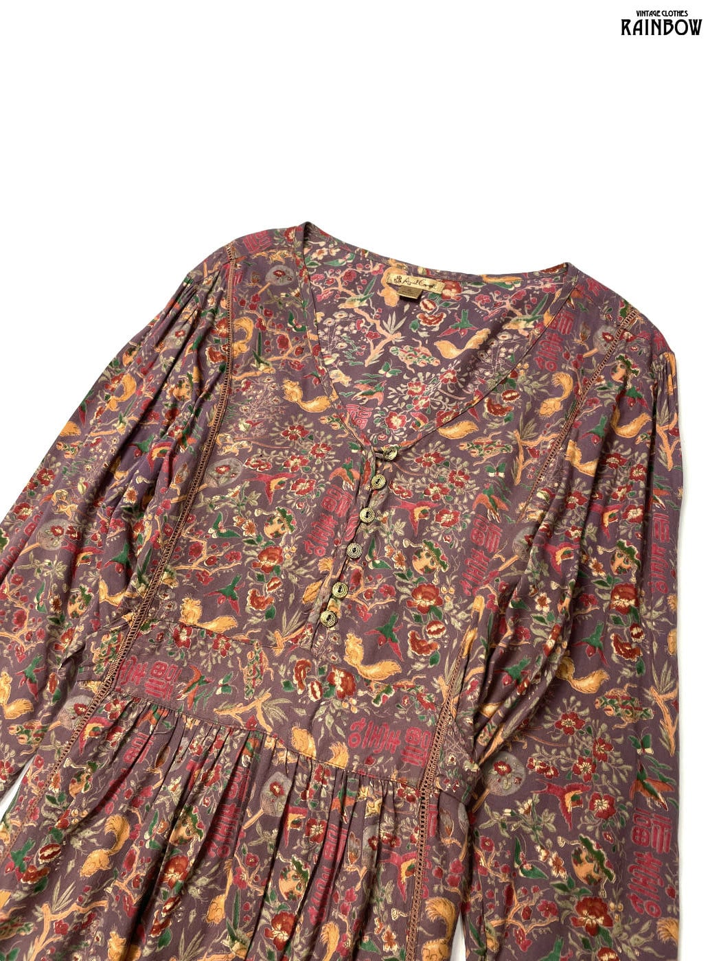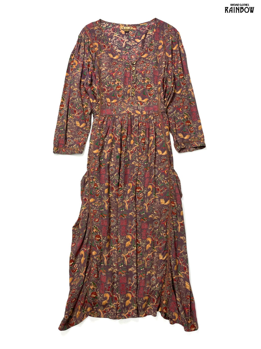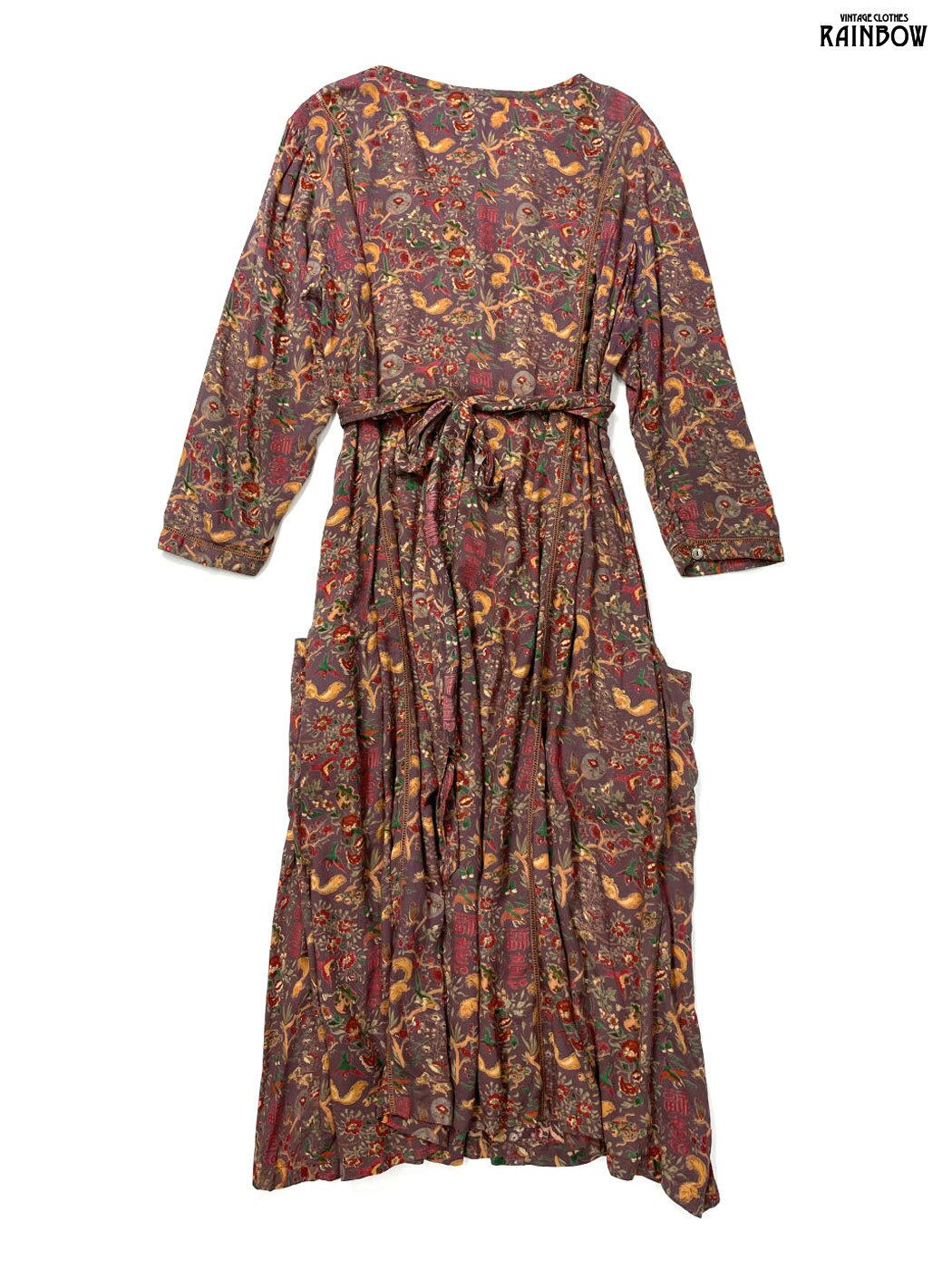 #ワンピース #ロングスリーブ #ロング丈 #ウエスト切り替え #茶 #花柄 #総柄 #リボン #クラシック #レーヨン #長袖花柄ワンピース