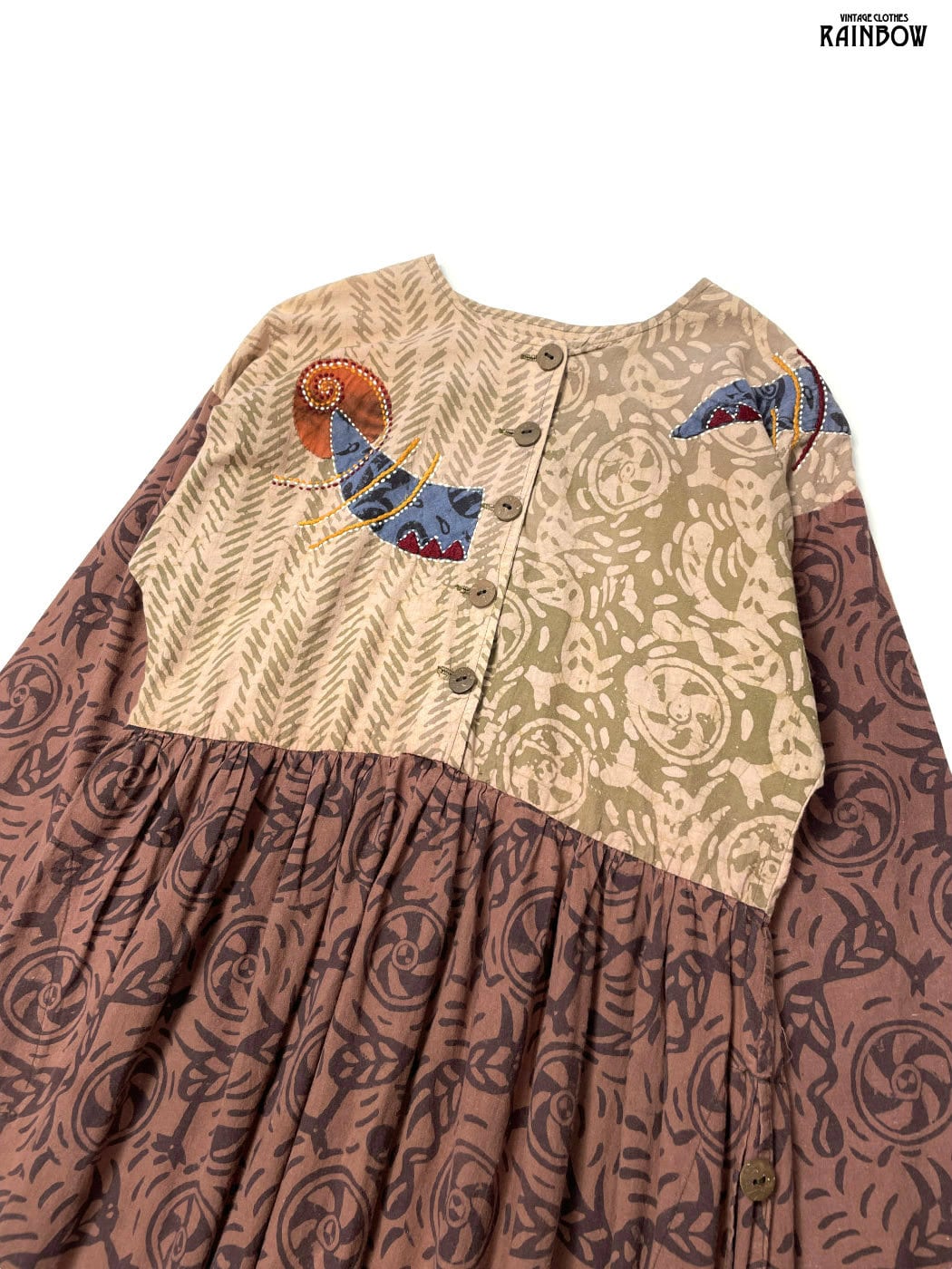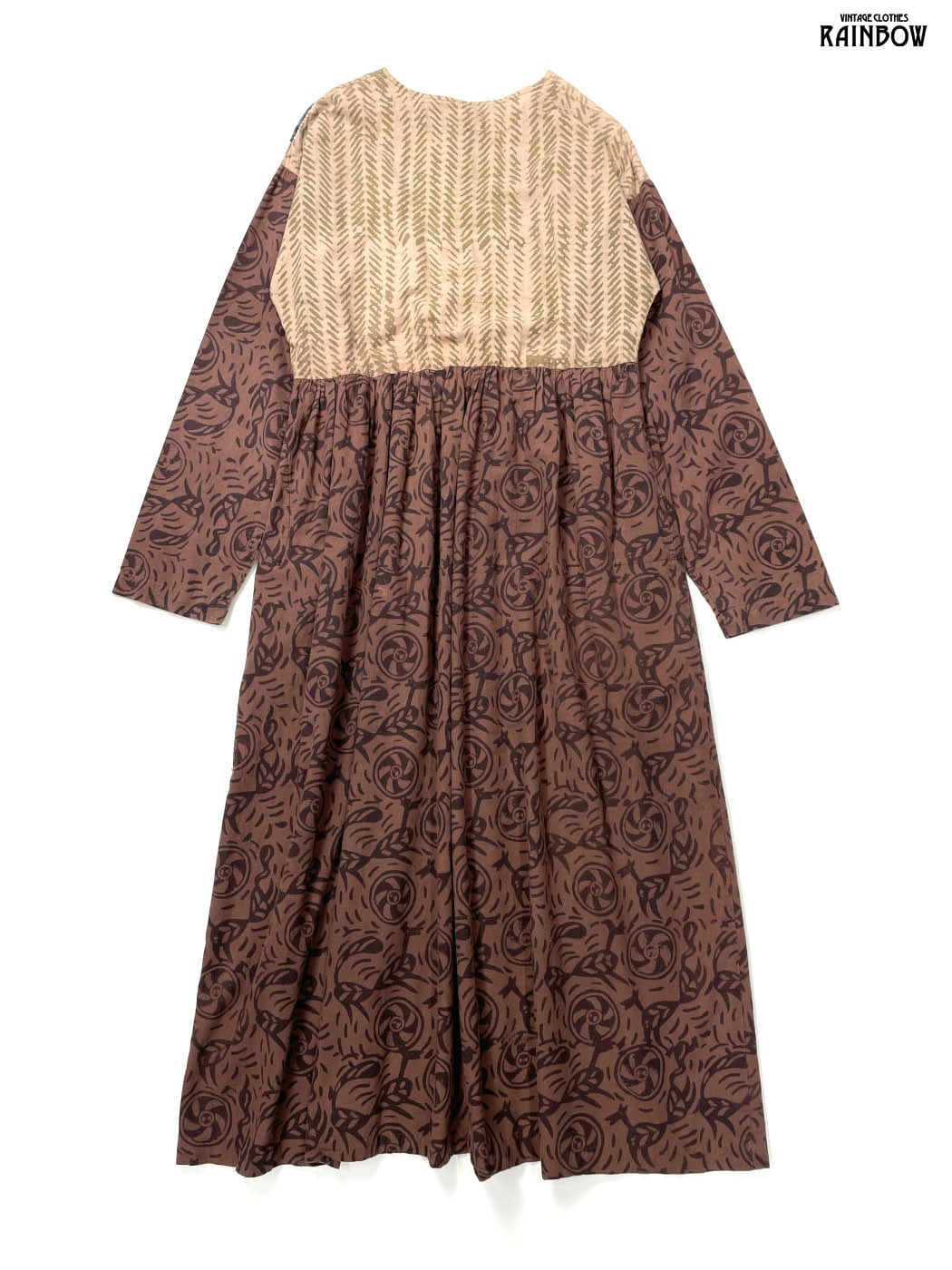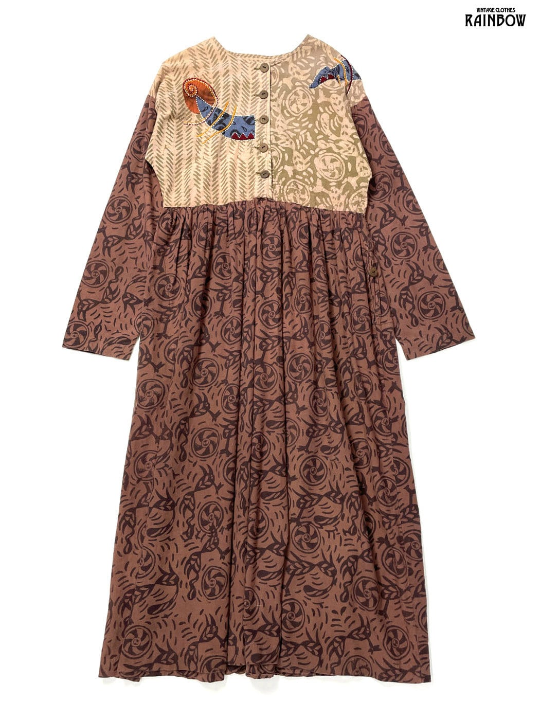 #ワンピース #ロングスリーブ #ロング丈 #ウエスト切り替え #茶 #総柄 #刺繍 #クラシック #コットン #長袖総柄ワンピース
