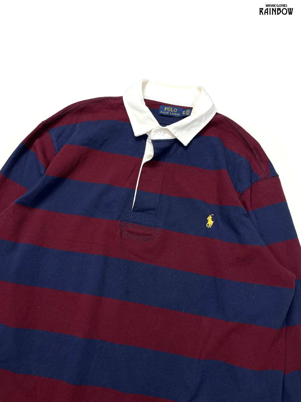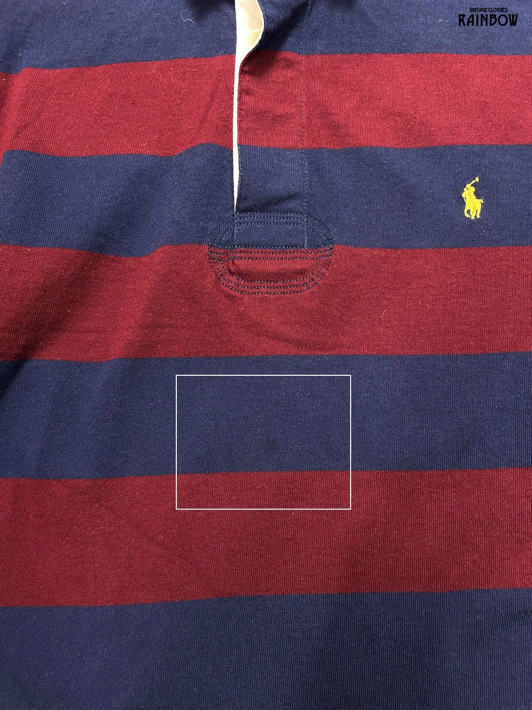 古着 POLO Ralph Lauren ポロラルフローレン 刺繍 ボーダー柄 ワンポイント コットン100% 長袖 ラガーシャツ 紺 ボルドー (ttu2601116)