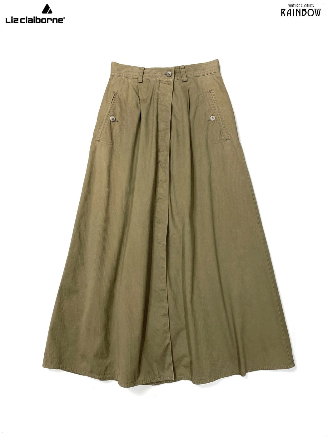 古着 Liz sport リズスポーツ 前開き 無地 コットン100% ロング丈 スカート カーキ ベージュ (btu2601096)