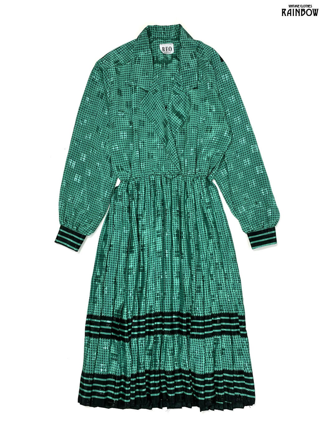 #ワンピース #ロングスリーブ #ロング丈 #プリーツ #ゴムウエスト #緑 #総柄 #長袖総柄ワンピース