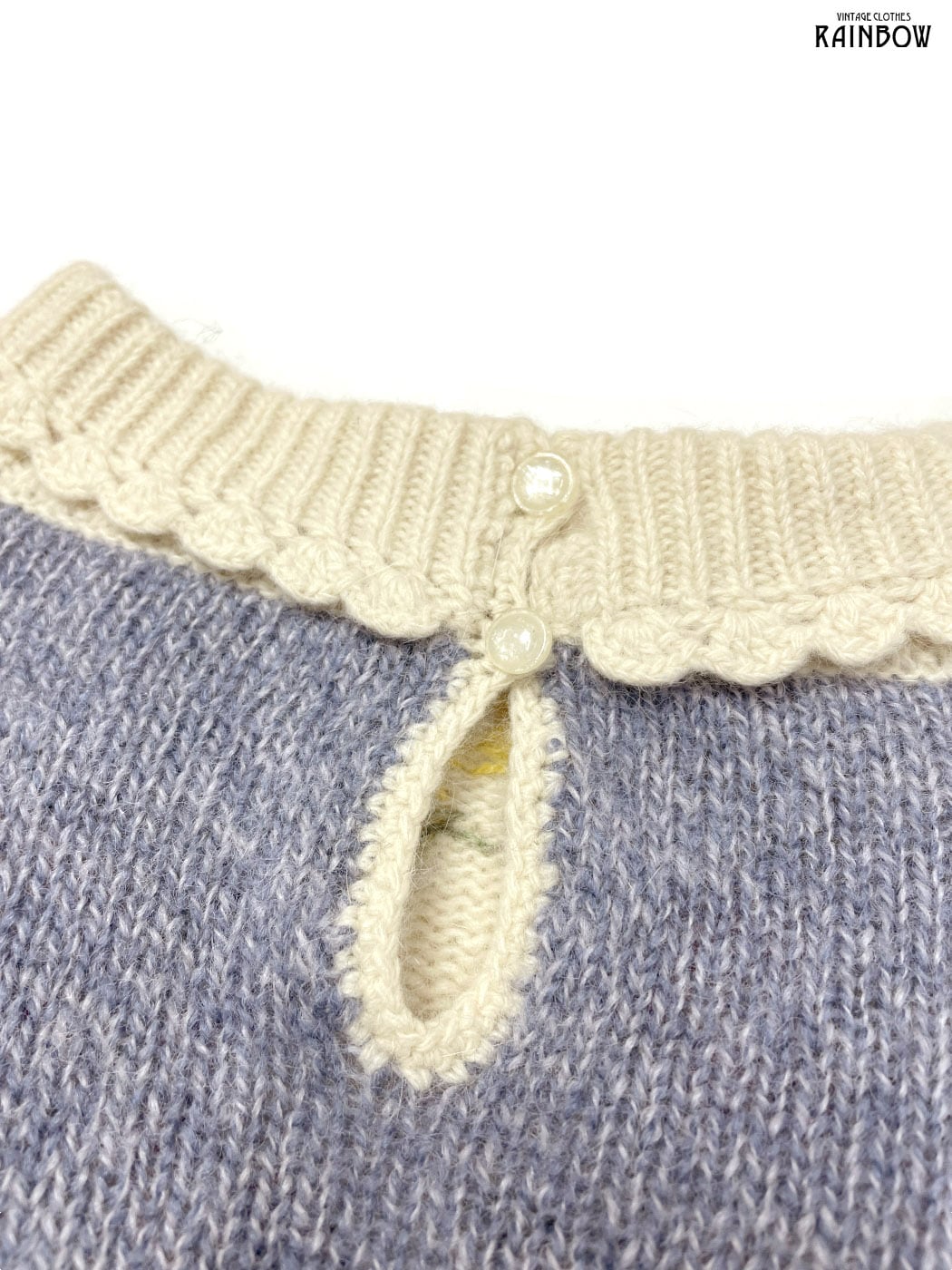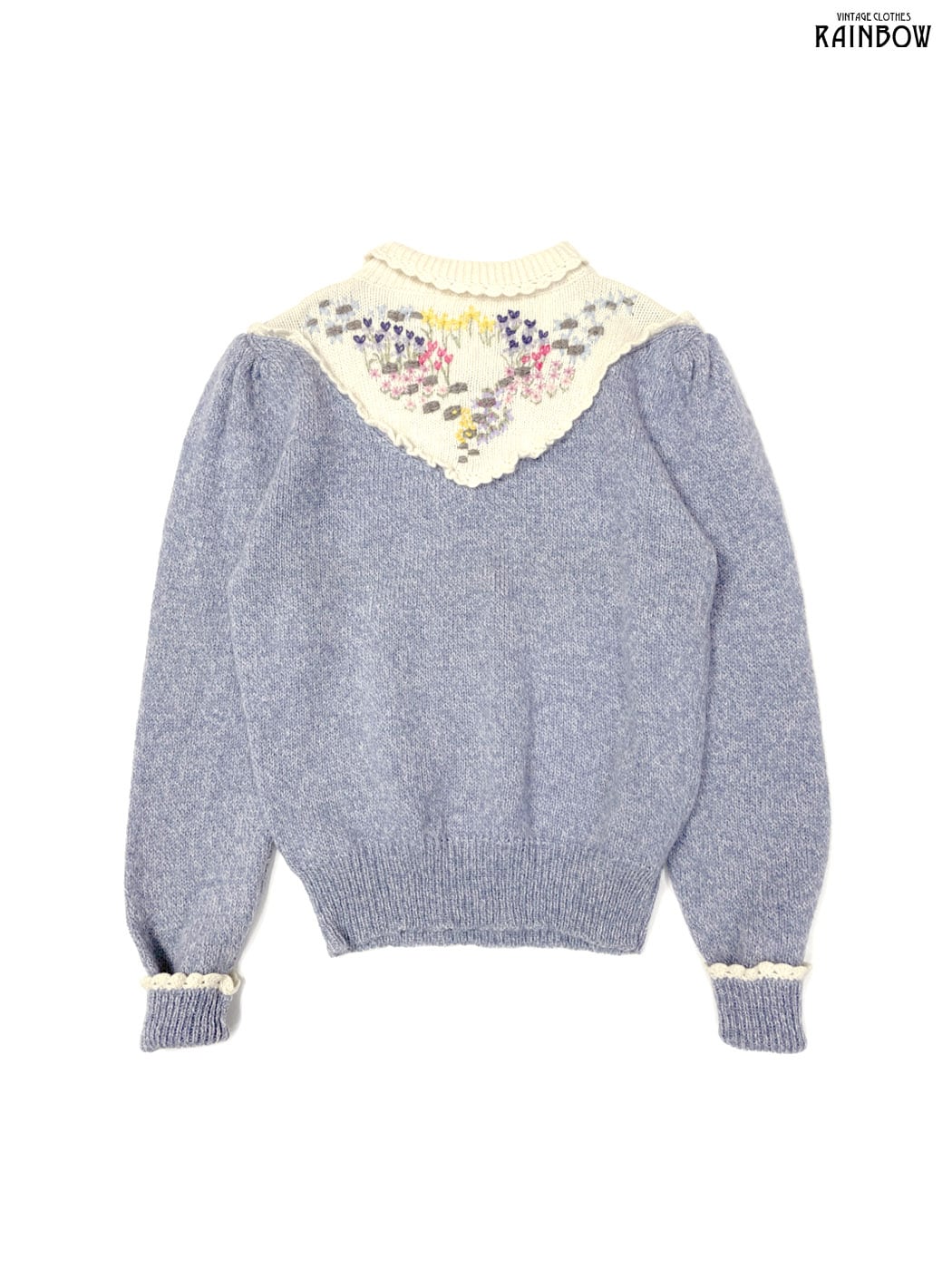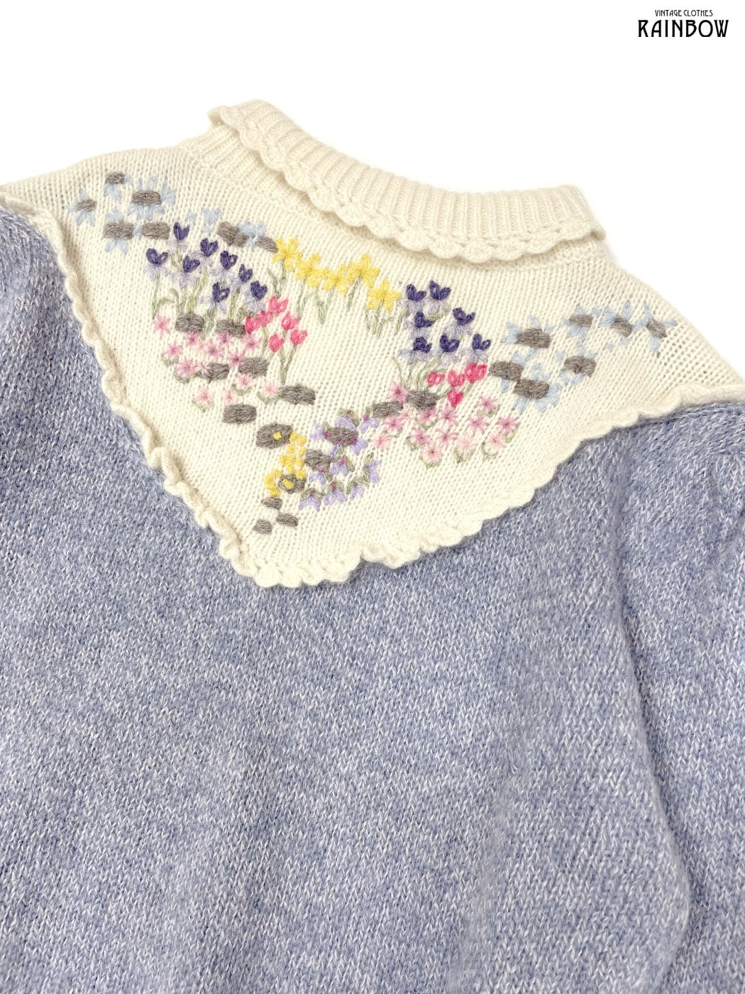 #ニット #セーター #ロングスリーブ #ベージュ #水色 #花柄 #フリル #刺繍 #ハイネック #ガーリー #ヴィンテージ #ウール #刺繍ニット