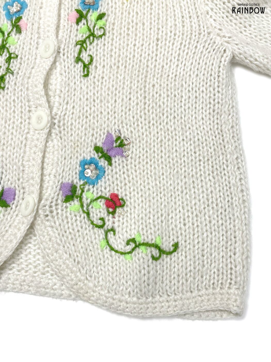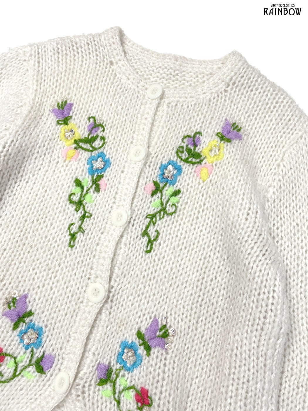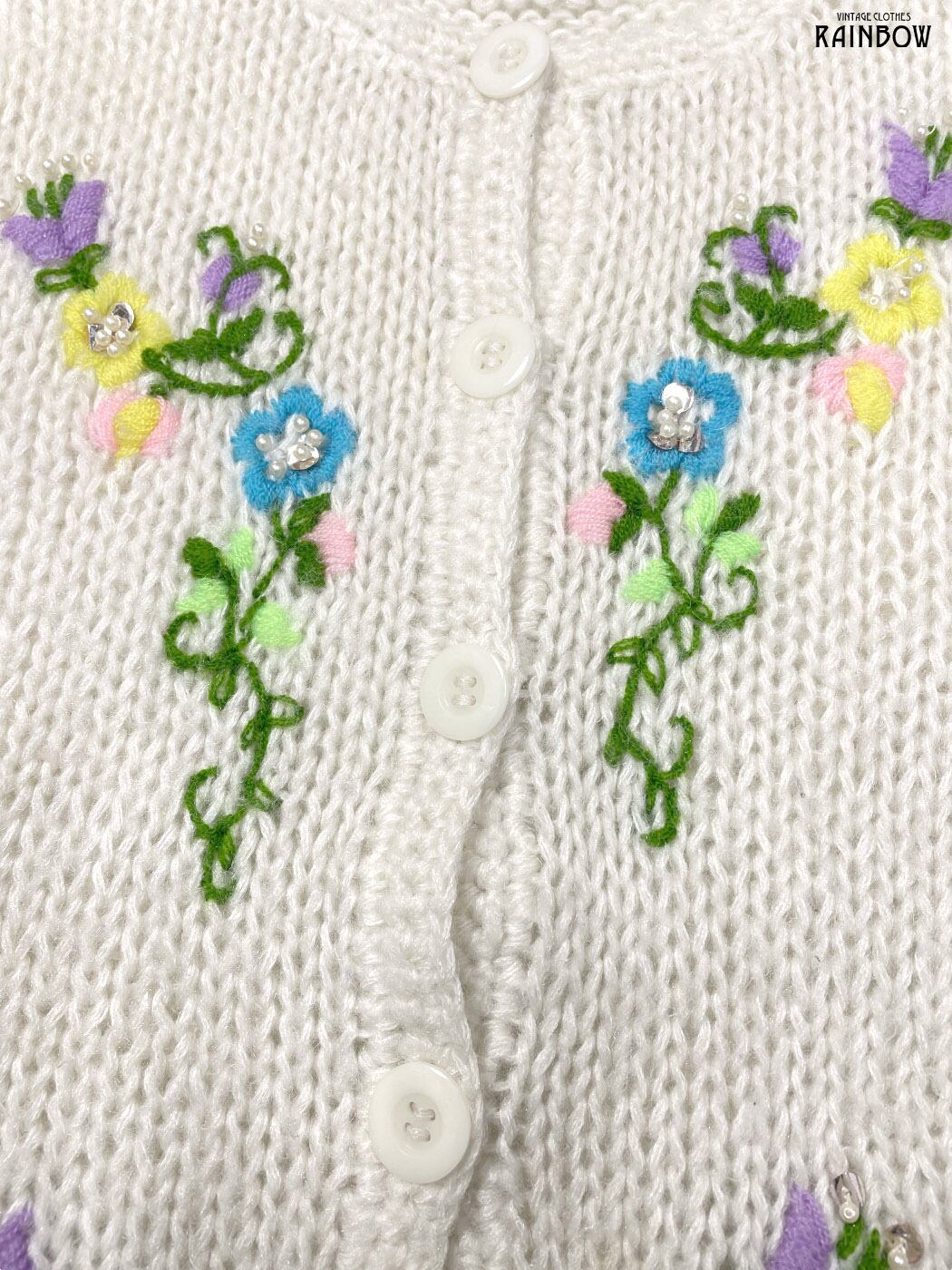#ニット #カーディガン #ロングスリーブ #白 #花柄 #パール #スパンコール #刺繍 #ビジュー #前開き #ガーリー #ニット地 #柄カーディガン