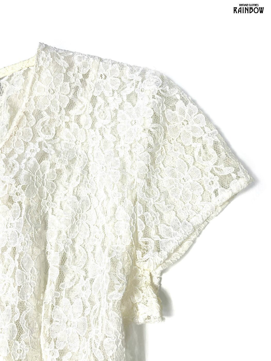 古着 編み上げリボン 無地 総レース ロング丈 半袖 ワンピース 白 生成り (otu2601114)