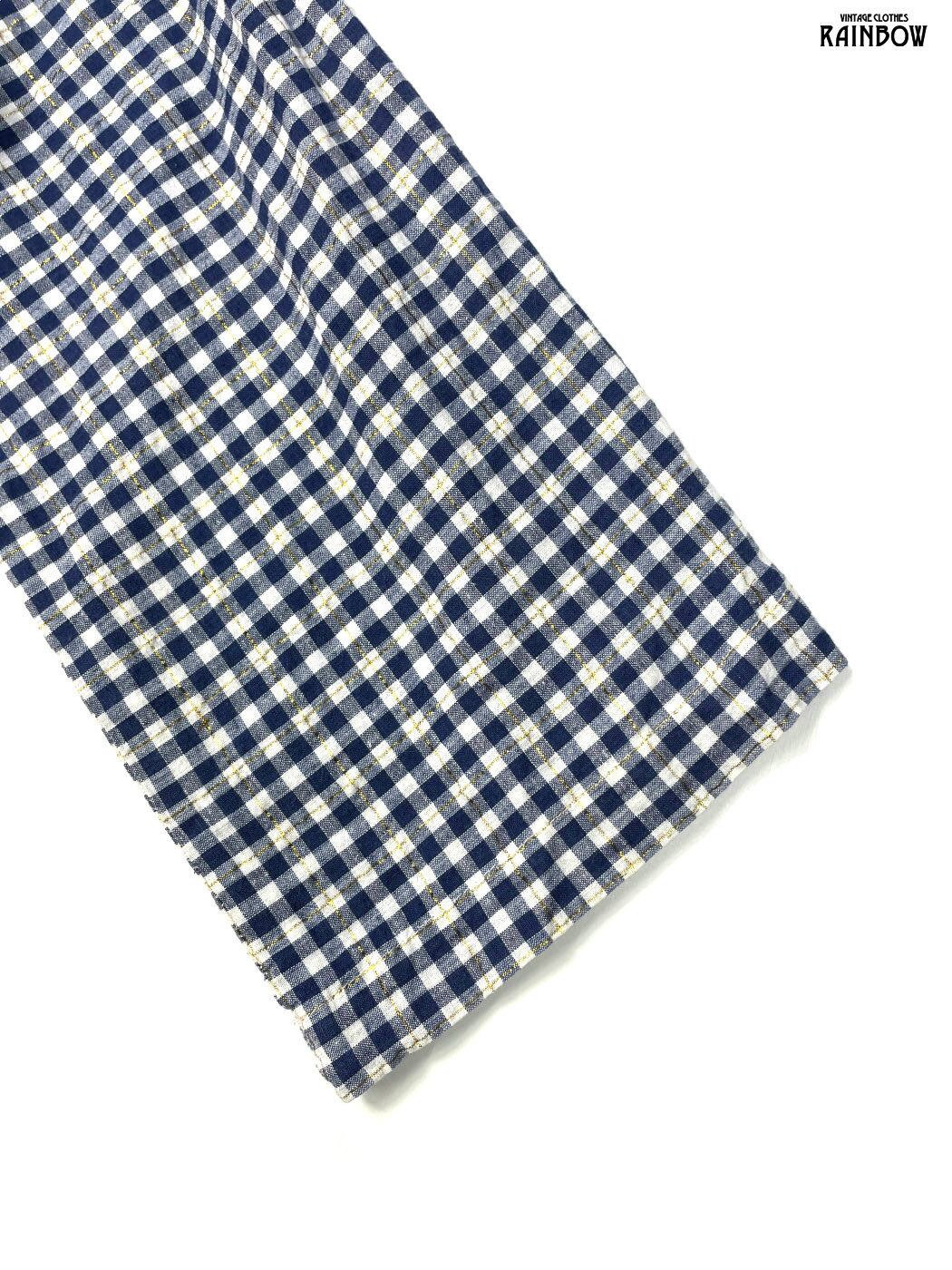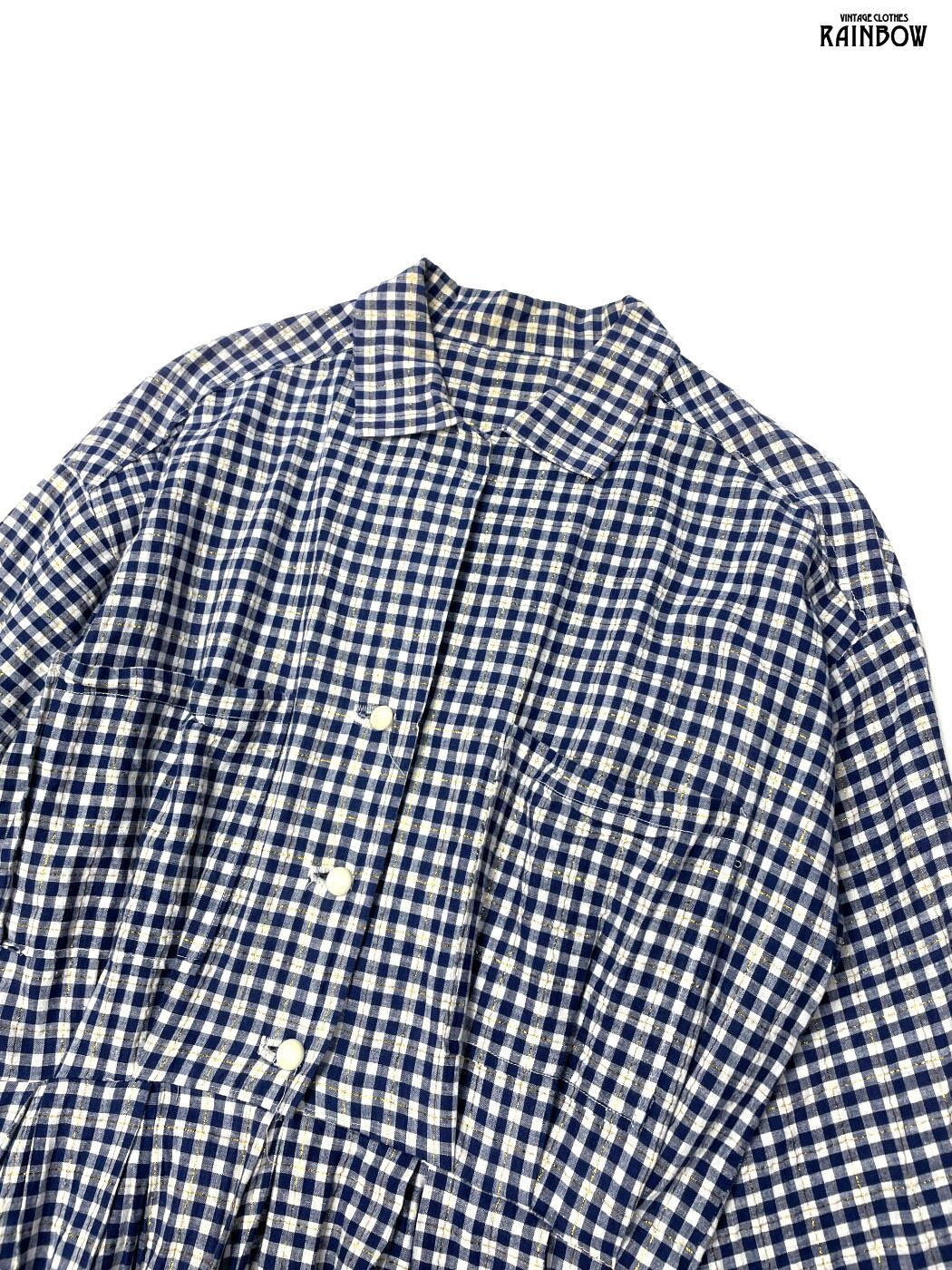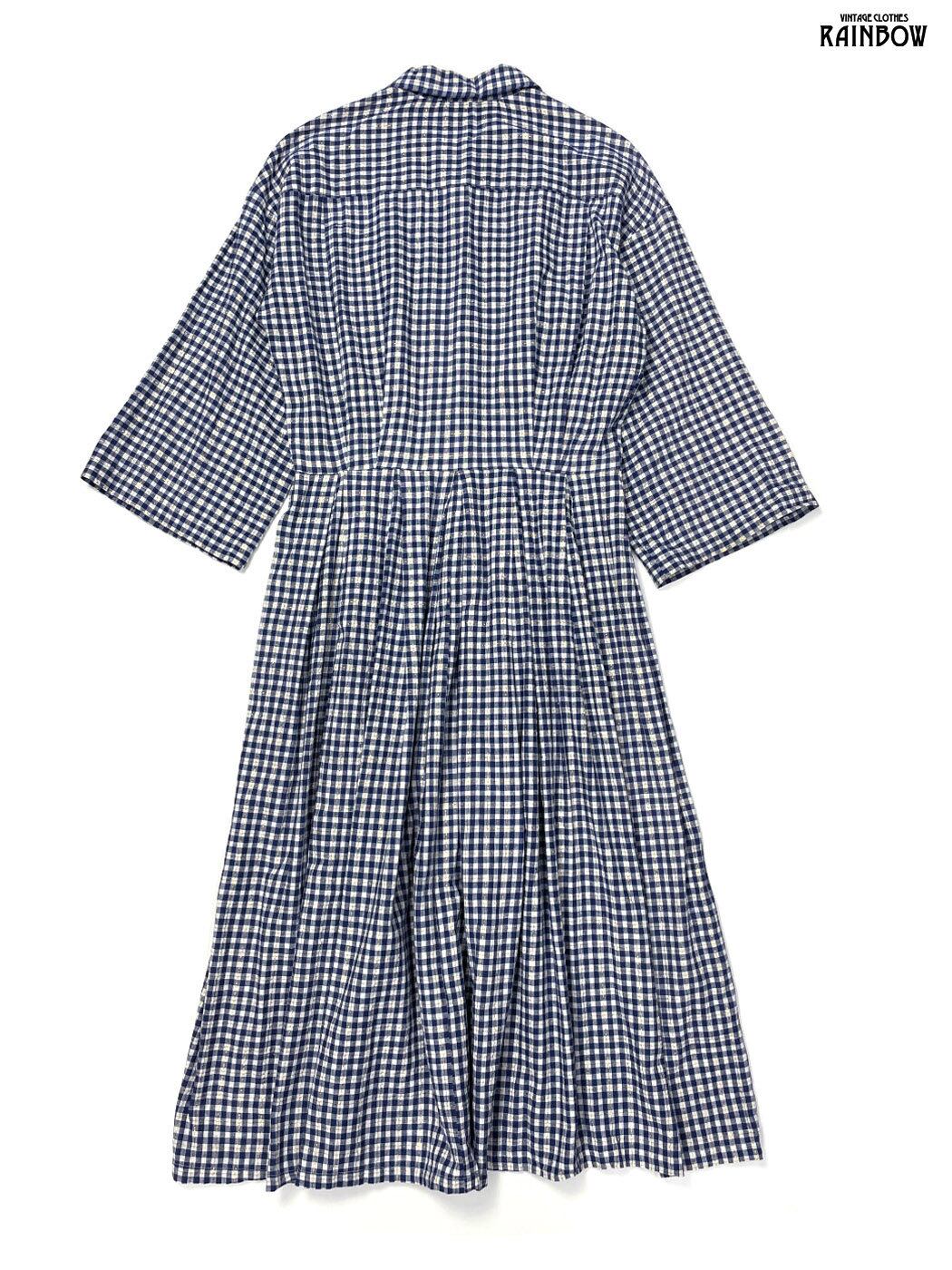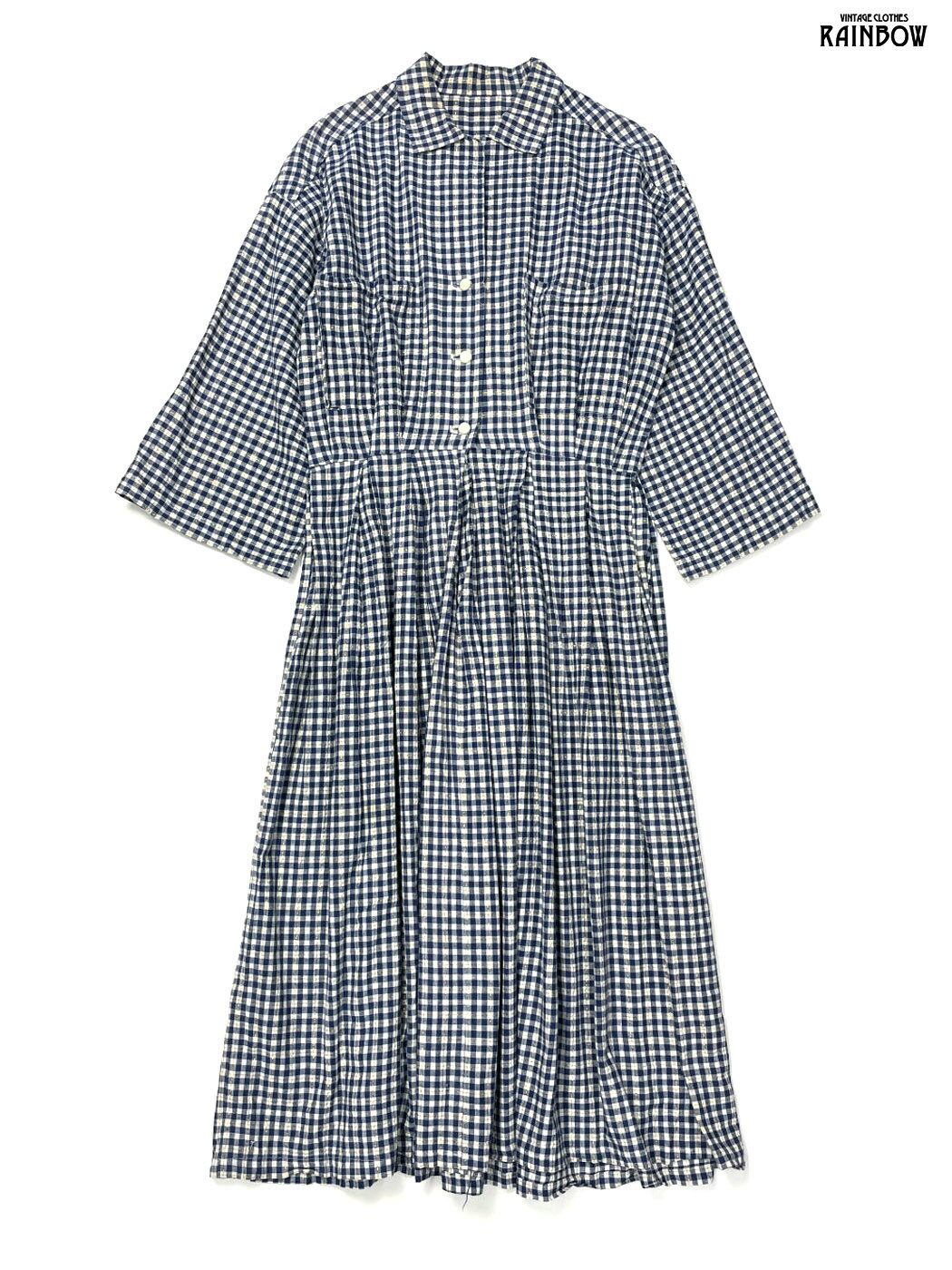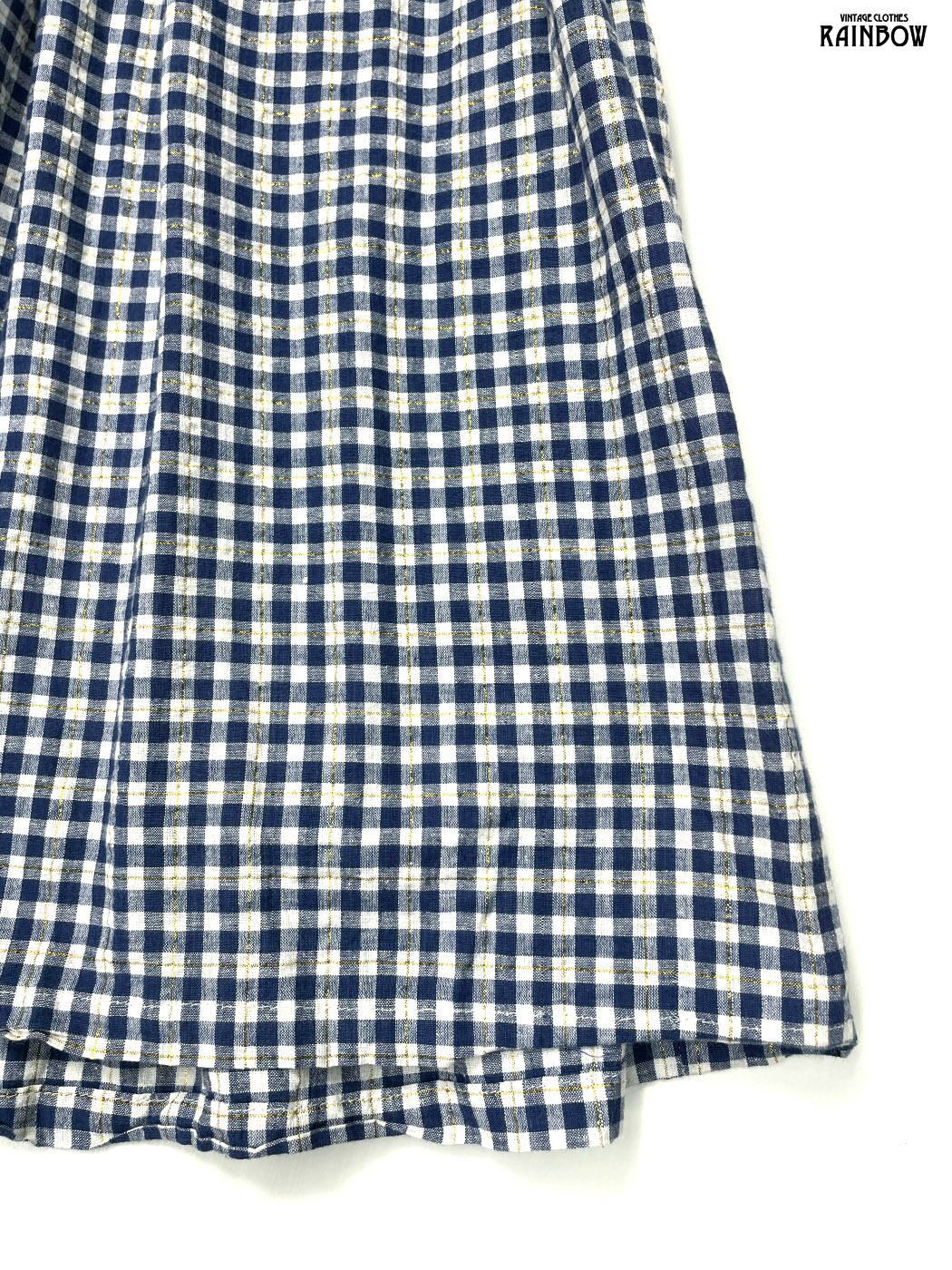古着 チェック柄 コットン ロング丈 長袖 ワンピース 青 紺 (otu2601124)