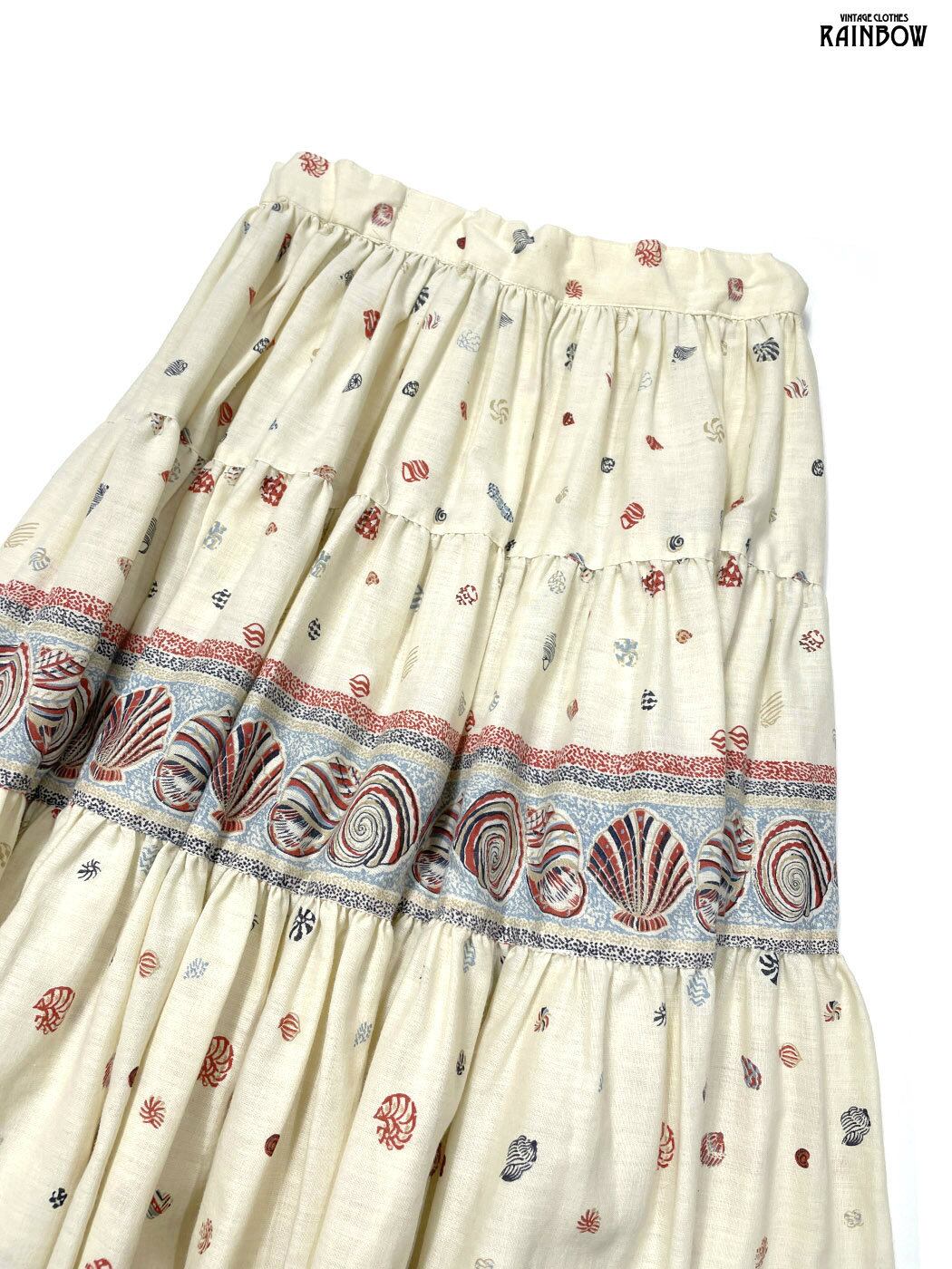 #スカート #膝丈 #ティアード #ベージュ #総柄 #貝殻 #TALONジップ #コットン #柄ライトスカート