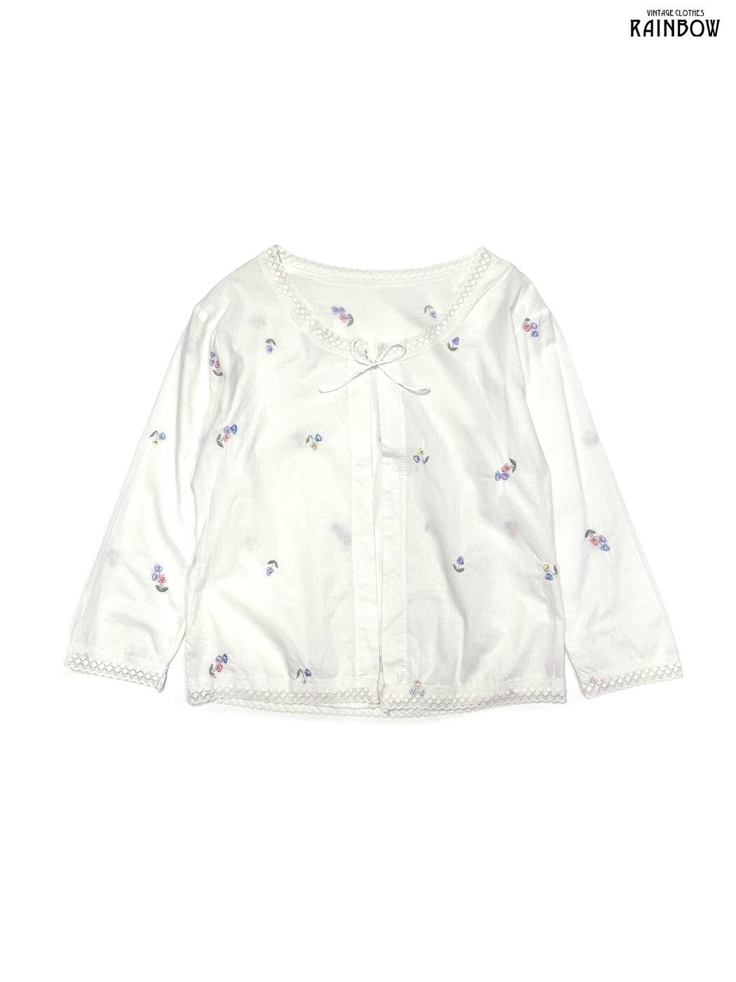 古着 刺繍 リボン レース 花柄 コットン 長袖 アウター 羽織り 白 (ttu2601248)