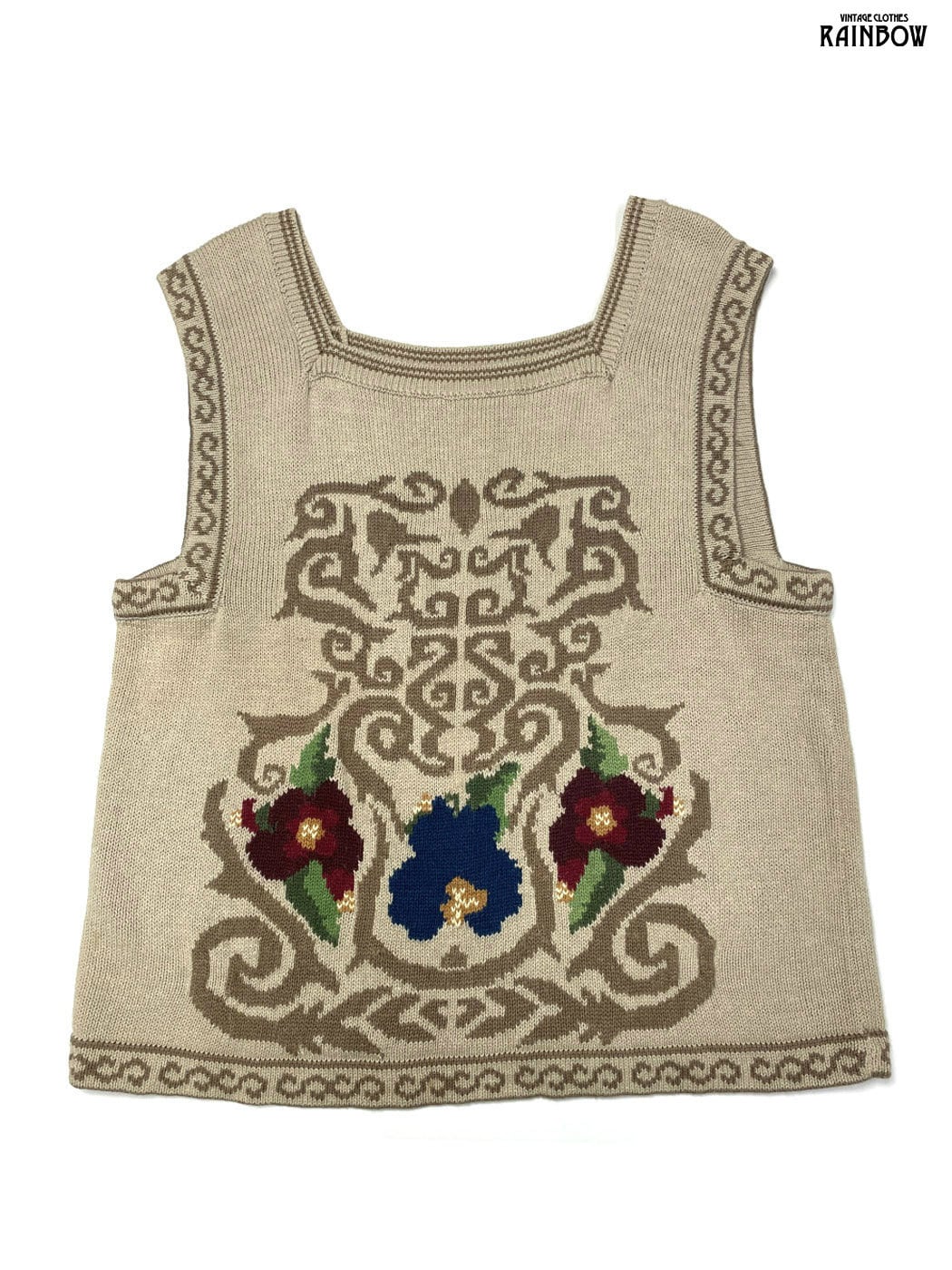 古着 花柄 総柄 ノースリーブ ニット ベスト 茶 ベージュ (ttu2603013)