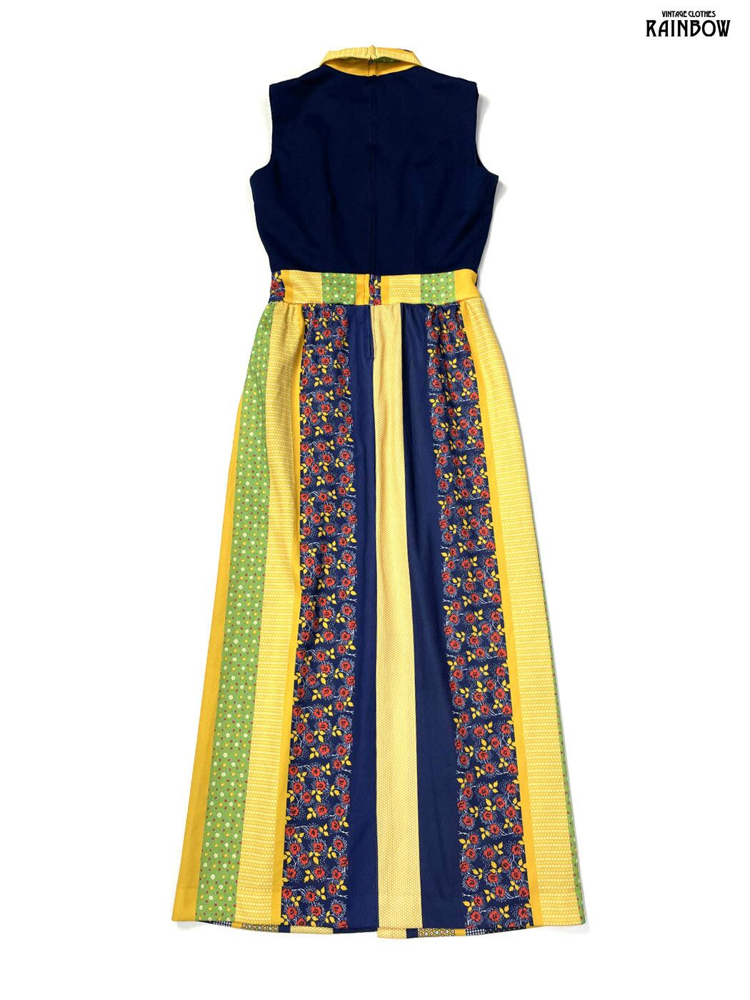 古着 ハイネック TALONジップ 花柄 ロング丈 ノースリーブ ワンピース 黄 紺 (otu2603031)